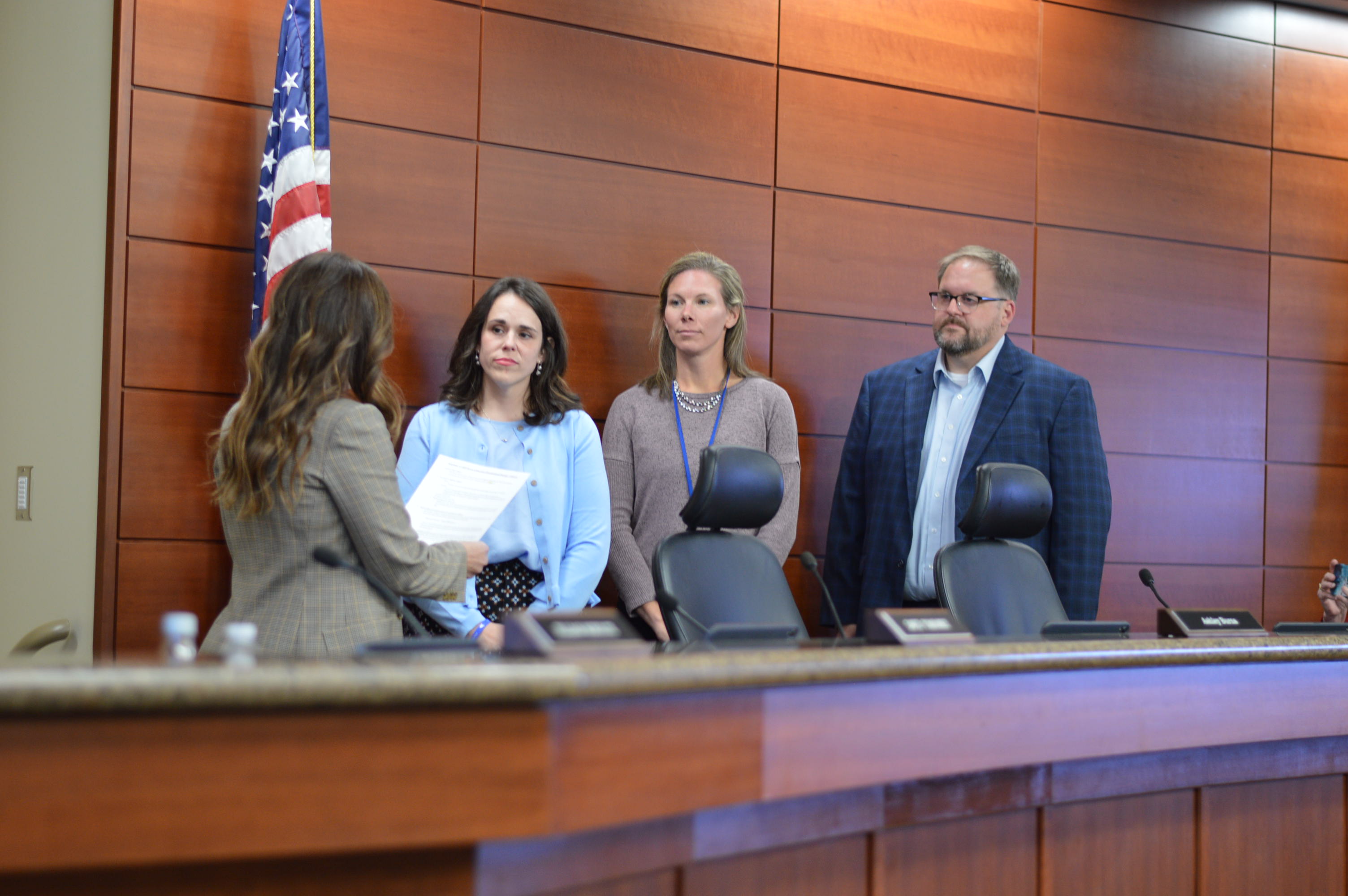 New school board members, left to right, Ashley Burns, Laura Zimmerman and Scott Drzycimski are sworn in during the Nov. 17, 2025, board meeting. (photo/Cindy Hadish)