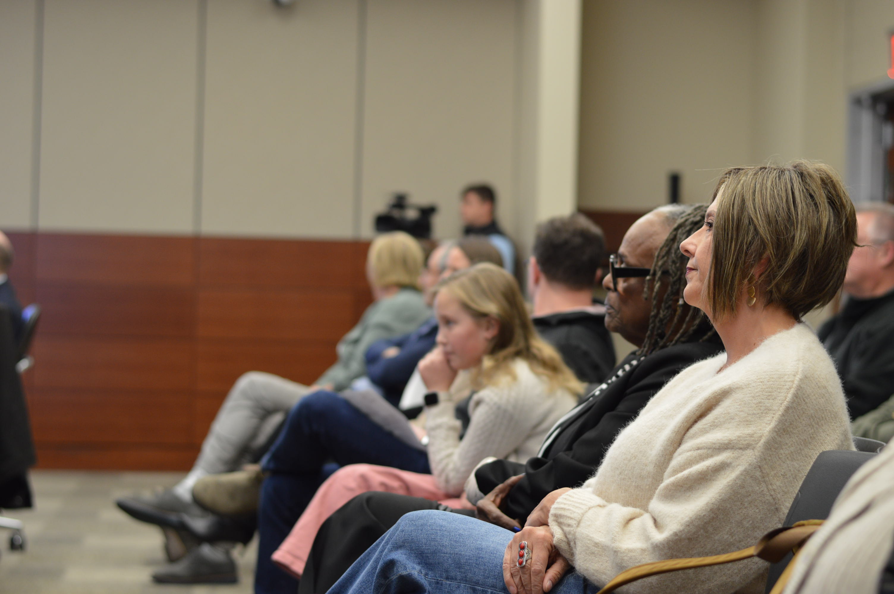 Jennifer Borcherding, right, and Nancy Humbles watch the School Board proceedings after leaving their posts on Nov. 17, 2025. (photo/Cindy Hadish)