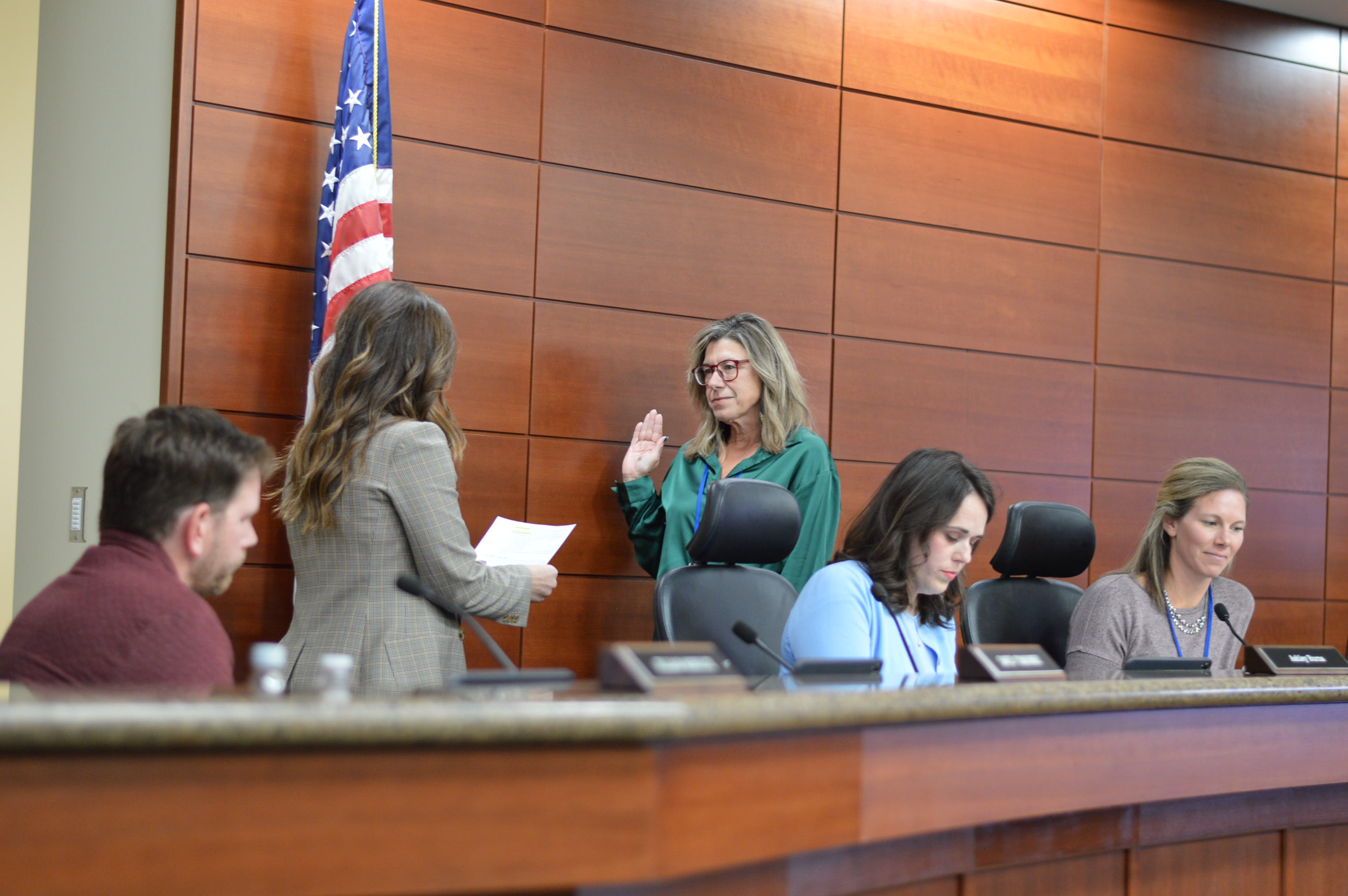 Jen Neumann is sworn in as the new president of the Cedar Rapids School Board. (photo/Cindy Hadish)