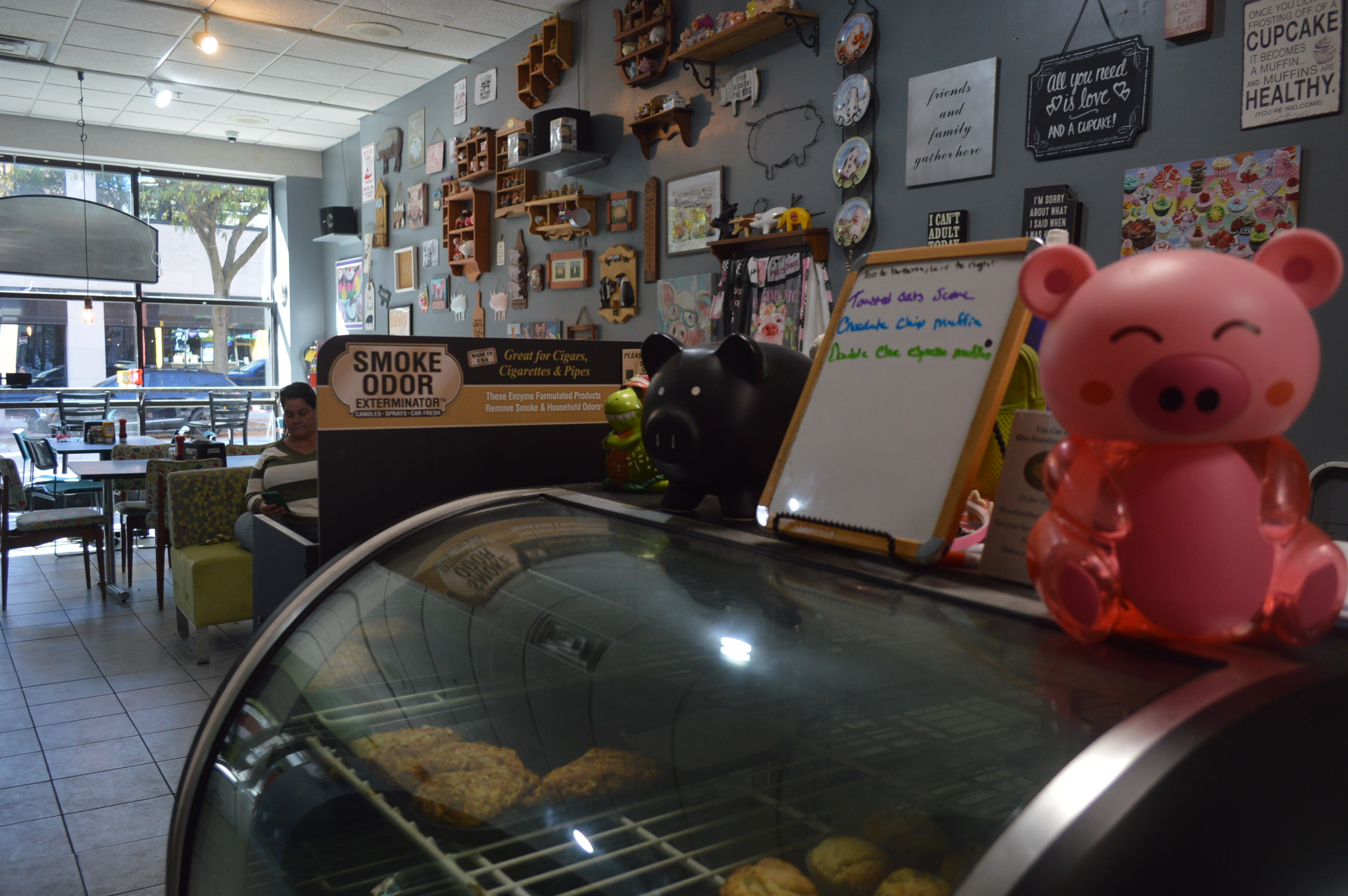 Quirky pig motif decor and the “case of yum” to hold her decadent cookies, bars, cupcakes and other treats, made the move to the new location.