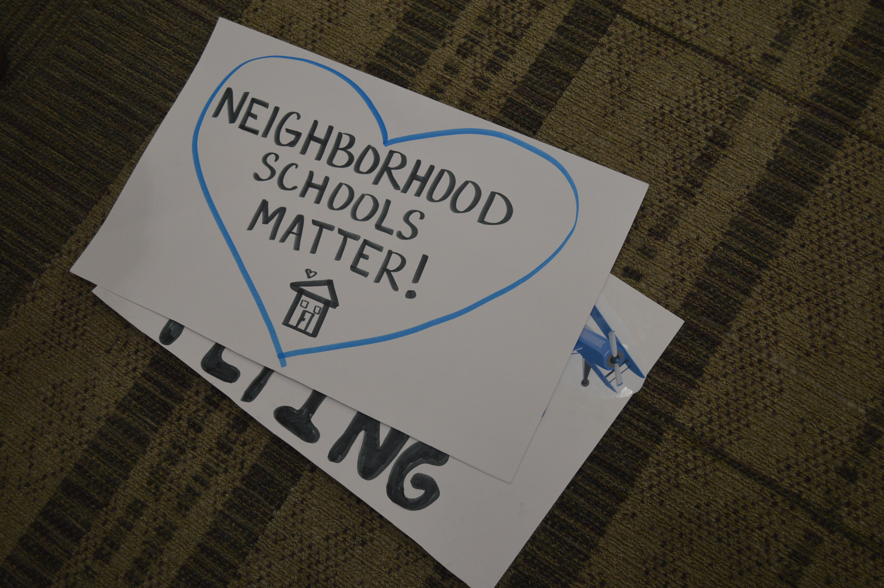 A sign in support of neighborhood schools is seen during the School Board meeting. (photo/Cindy Hadish)
