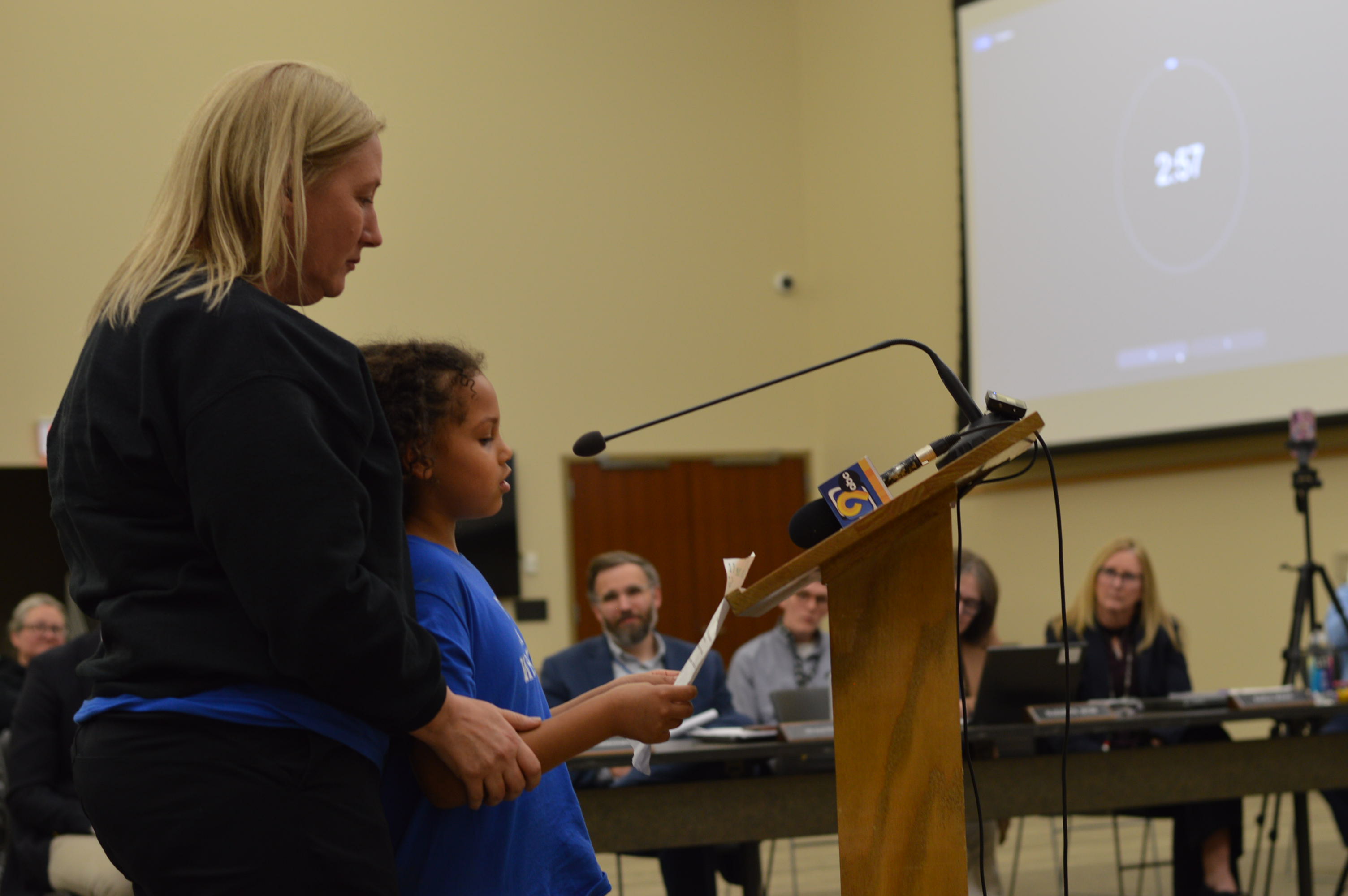 Wright Elementary School teacher Jill Ozarowicz stands behind Amara Stevenson as the second-grader addresses the Cedar Rapids School Board. (photo/Cindy Hadish)
