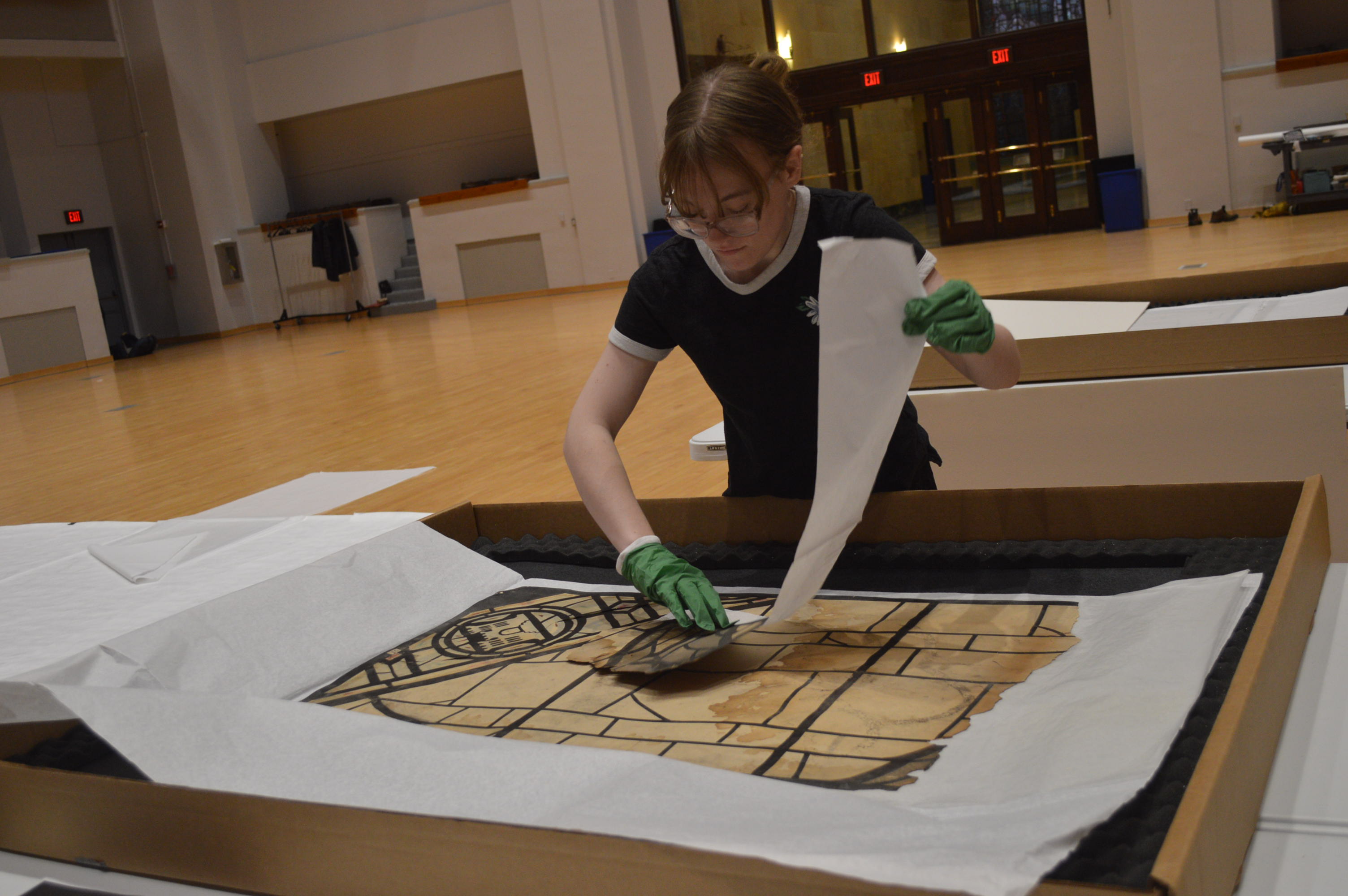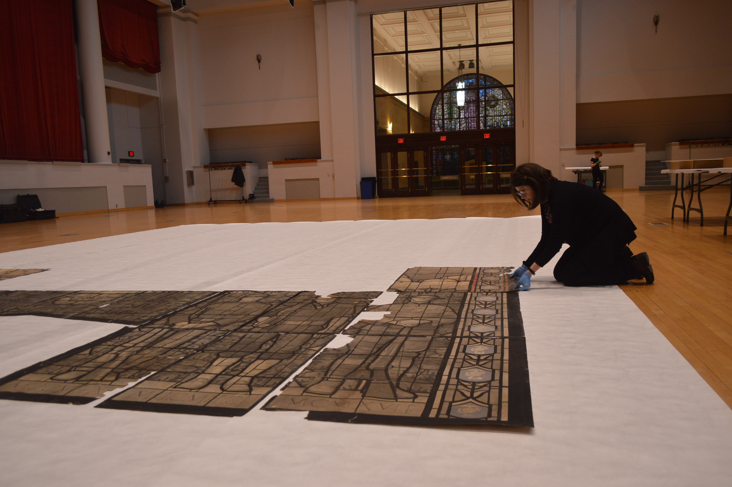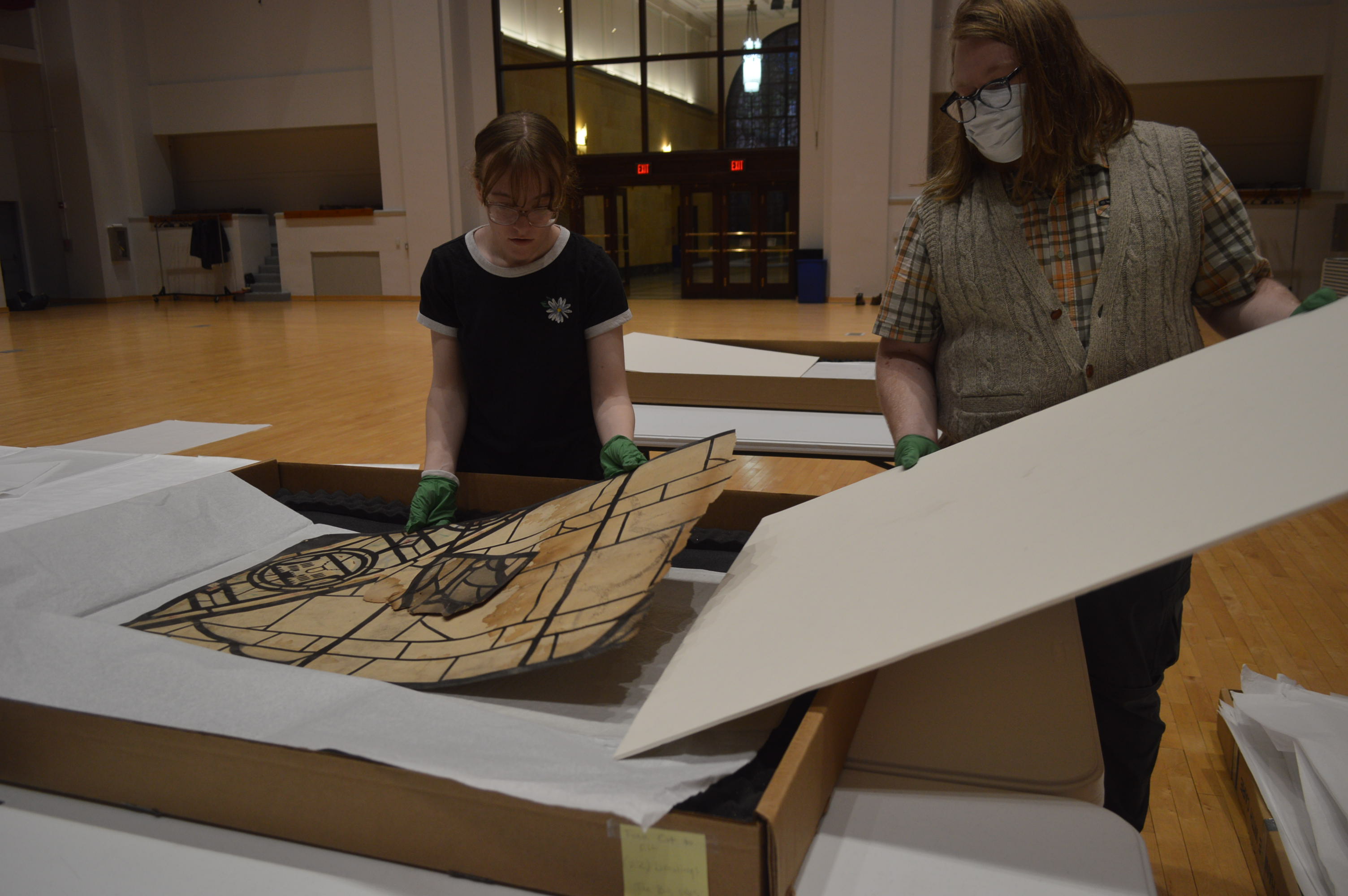 In stocking feet and gloved hands, the three carefully removed the fragile pieces from two flat boxes and placed them on the floor to form the full-sized window model.