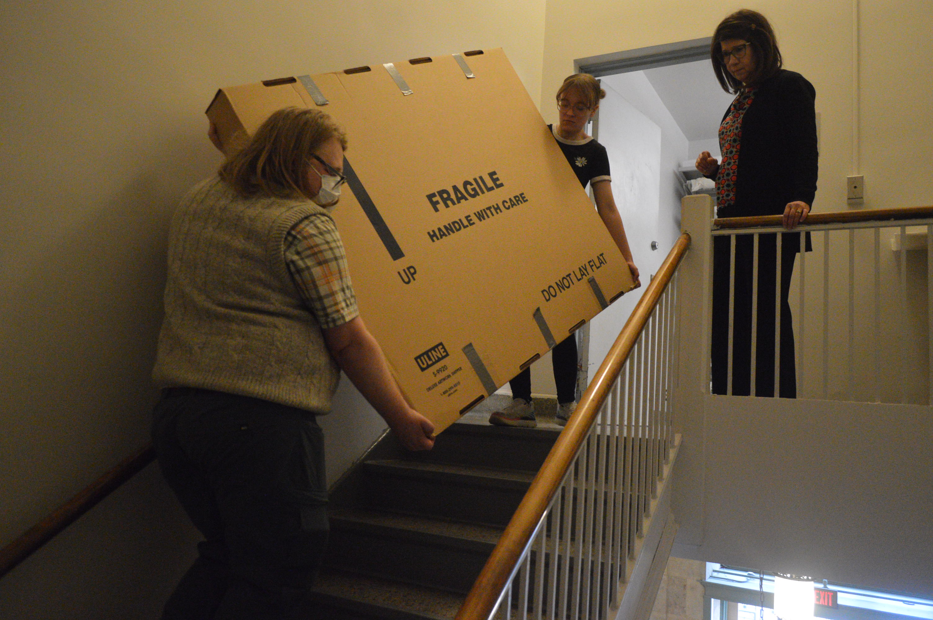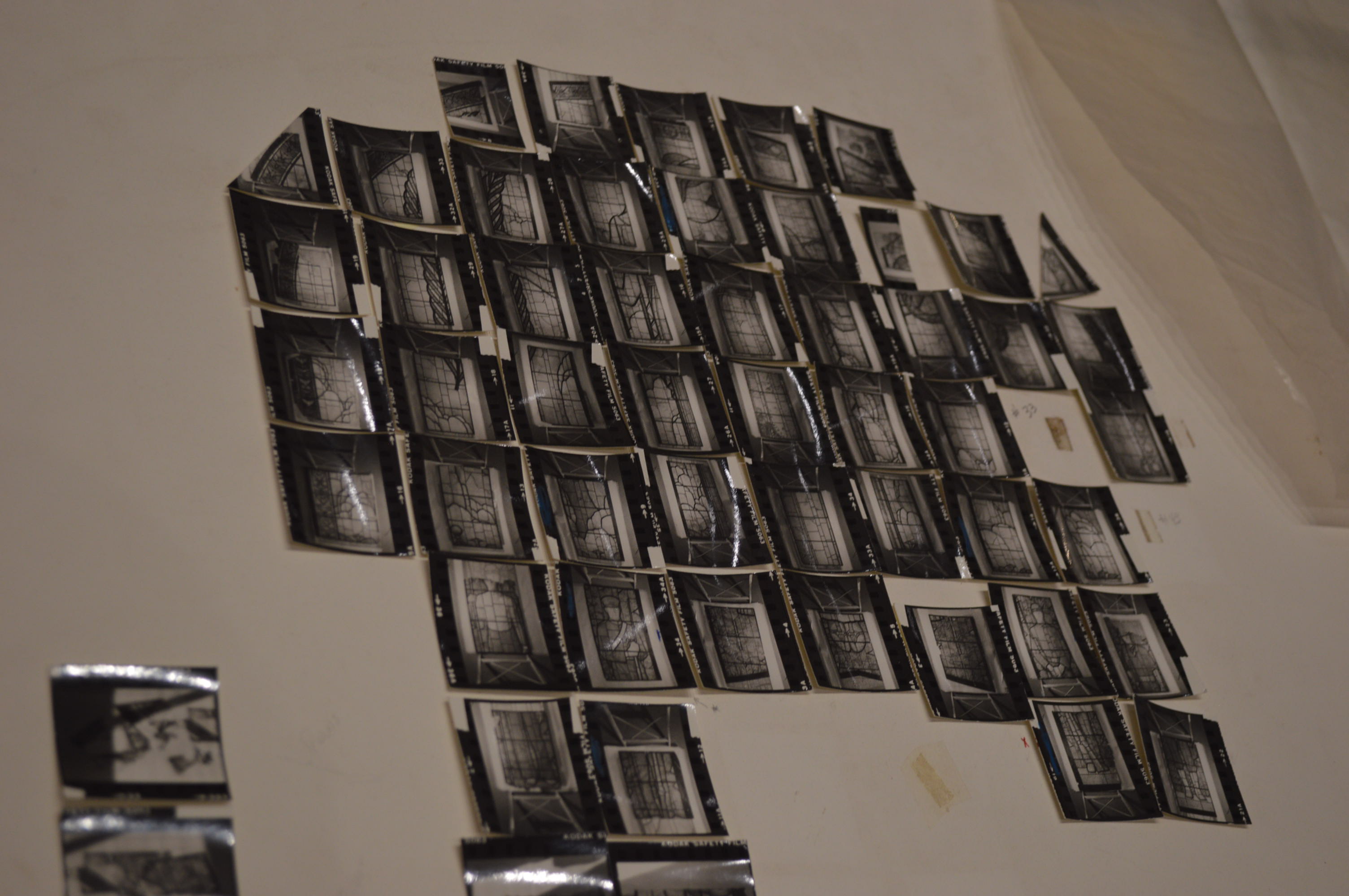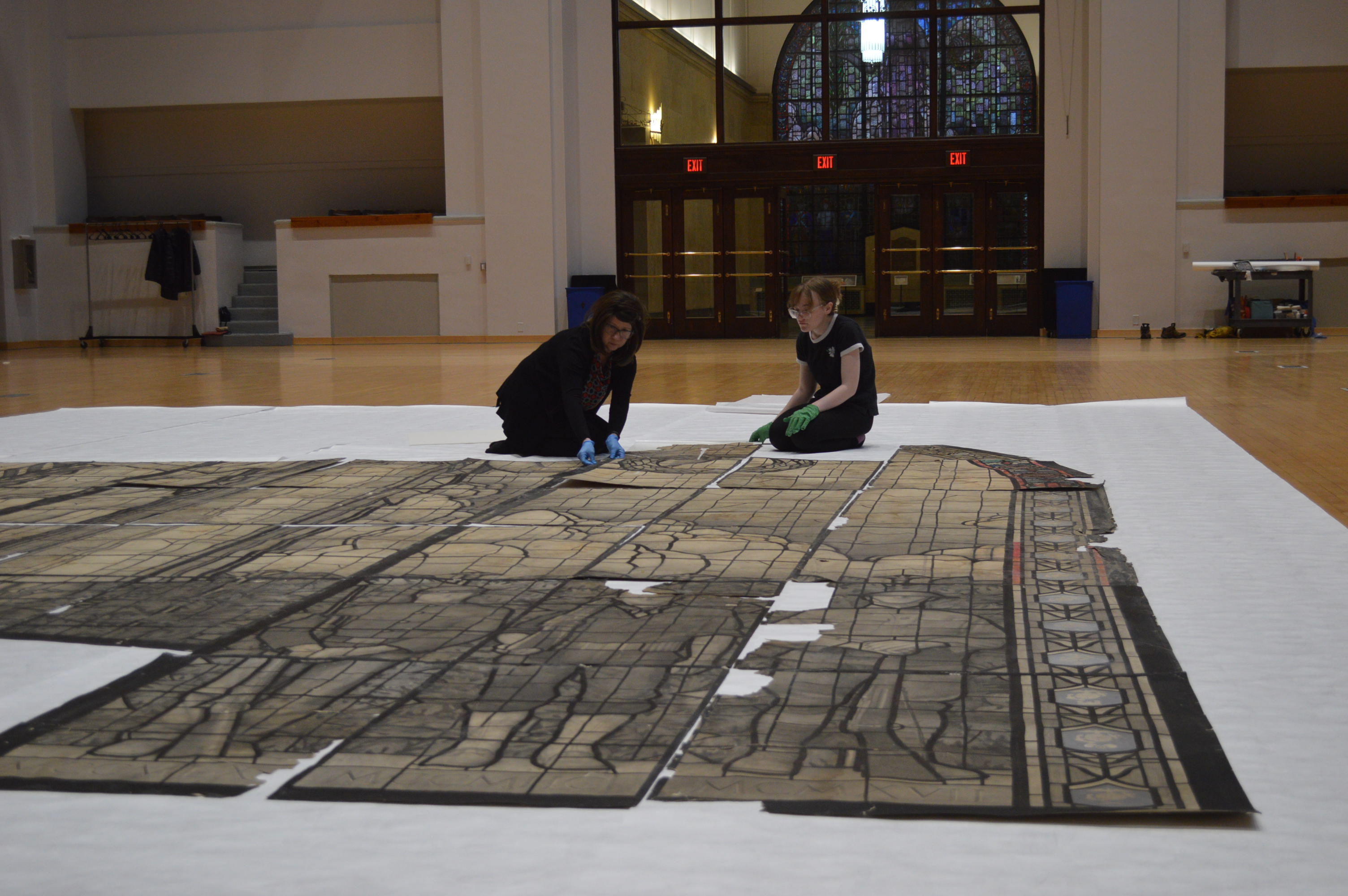 In stocking feet and gloved hands, the three carefully removed the fragile pieces from two flat boxes and placed them on the floor to form the full-sized window model.