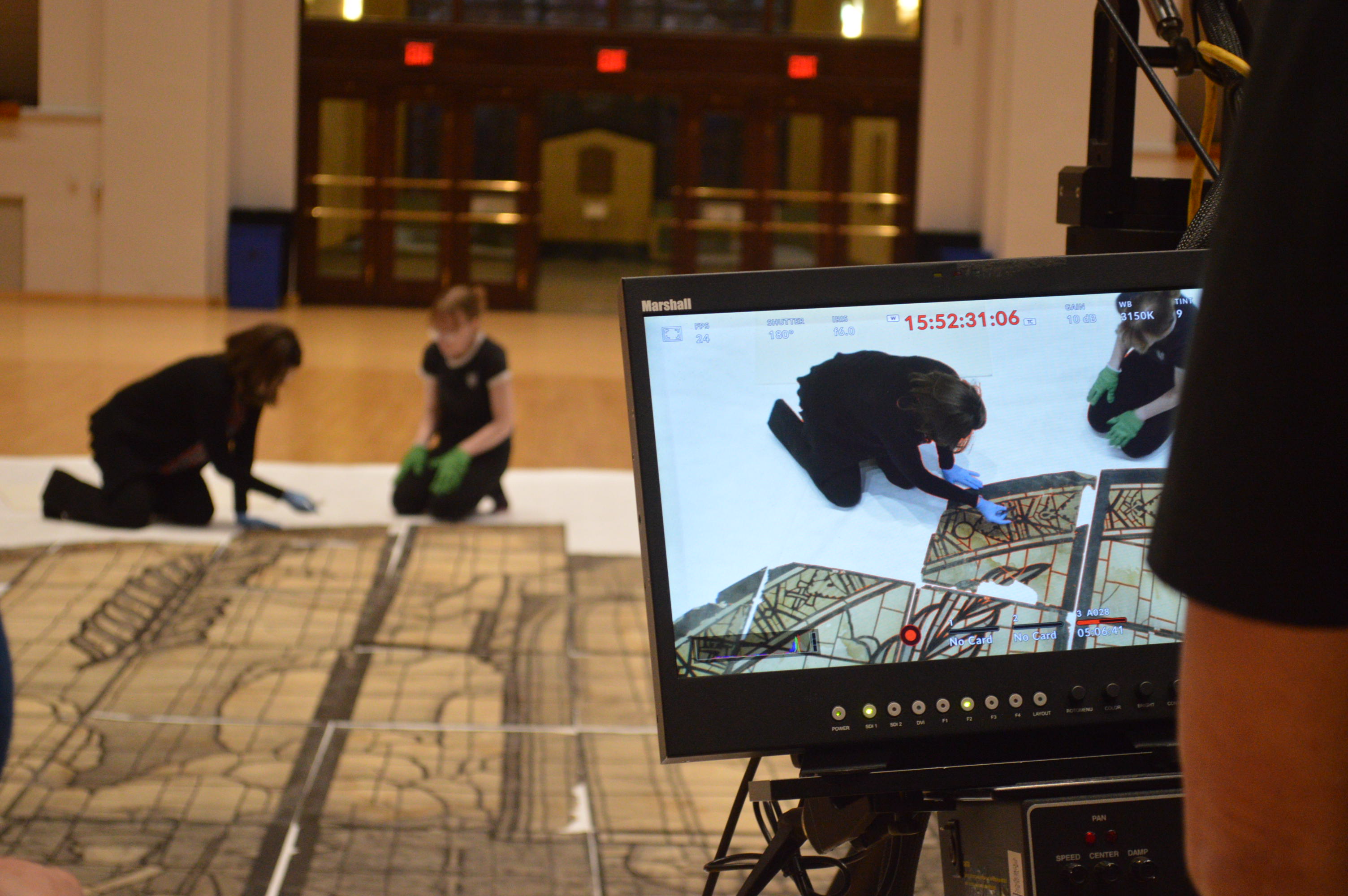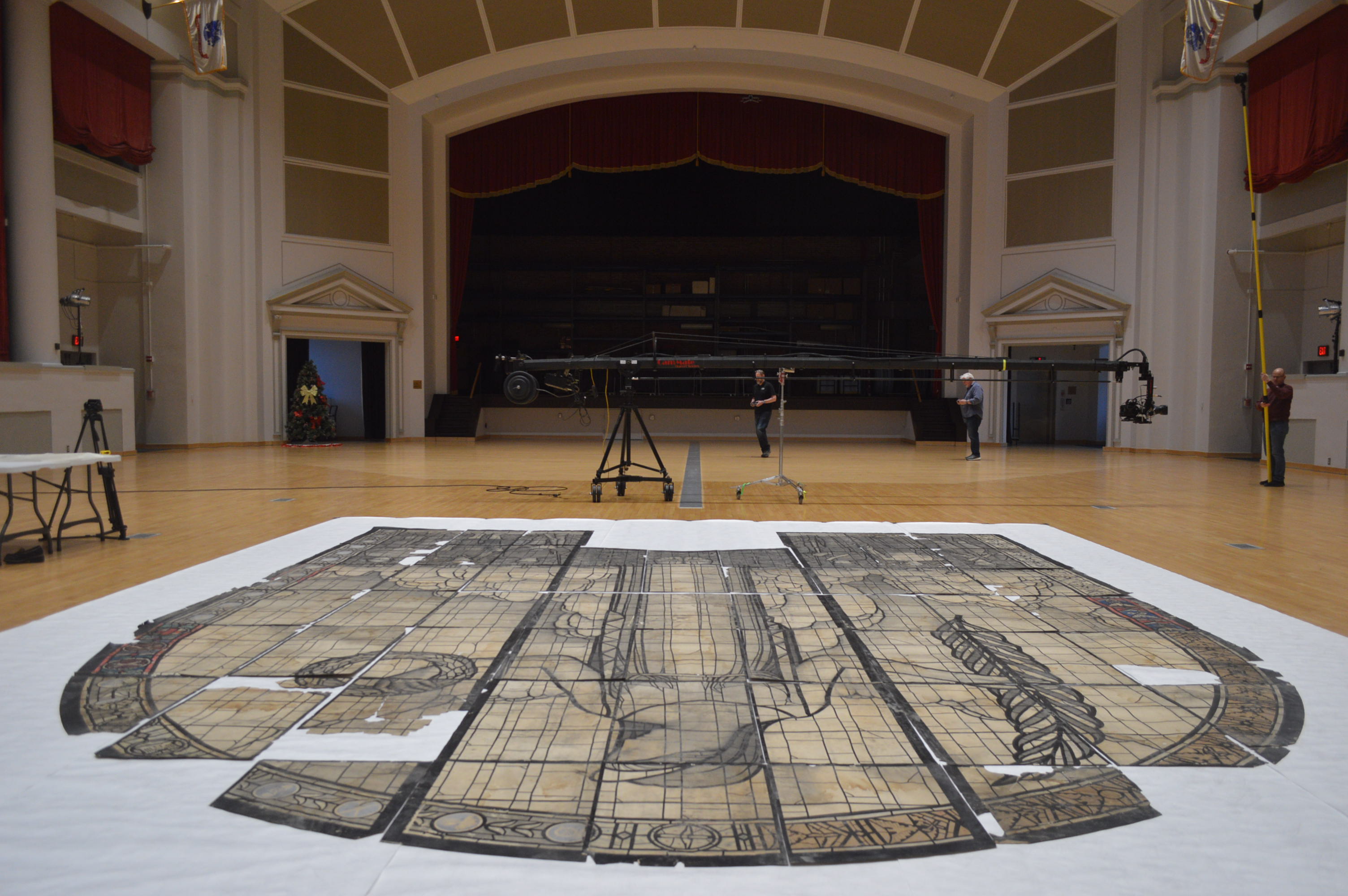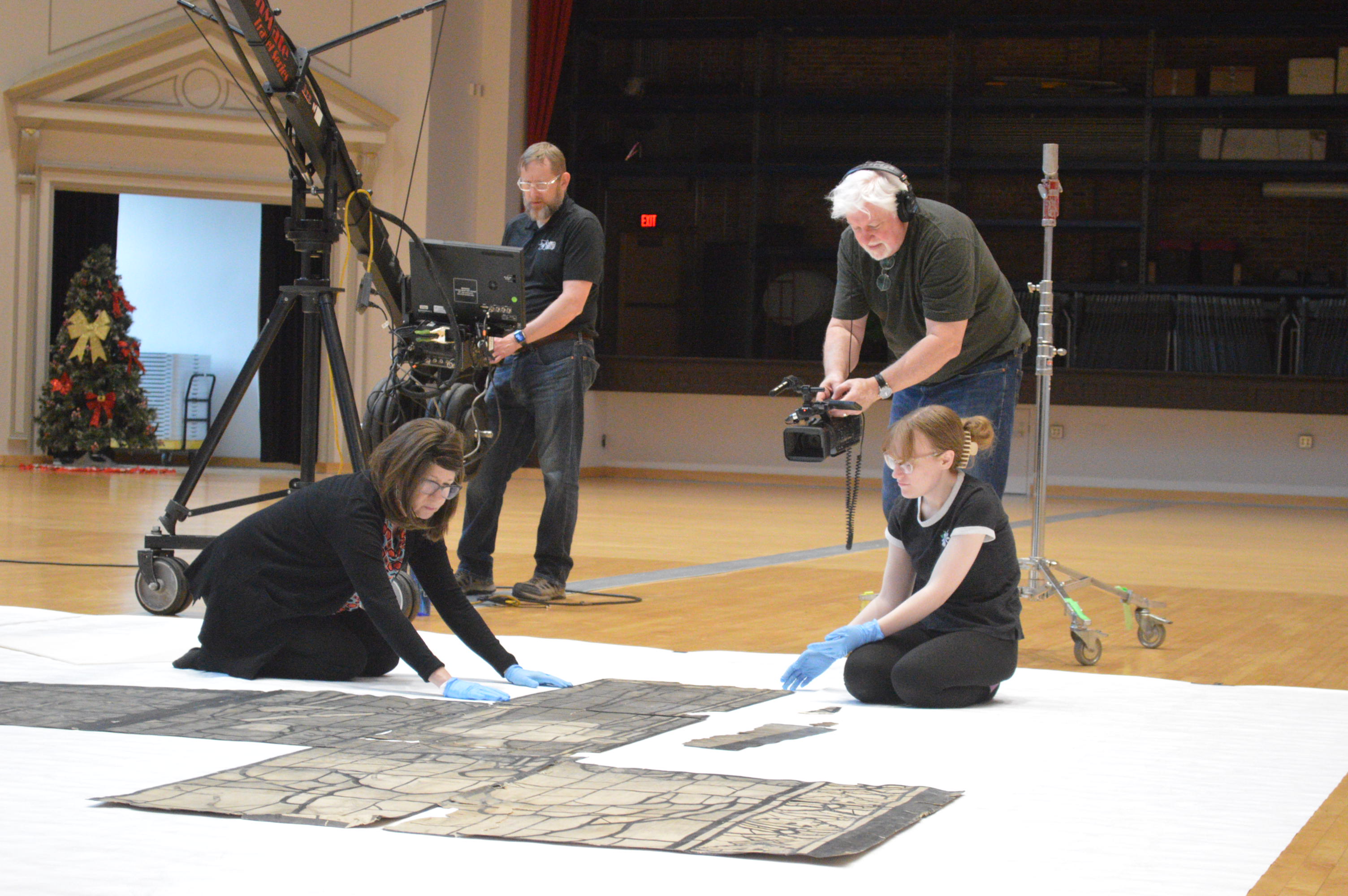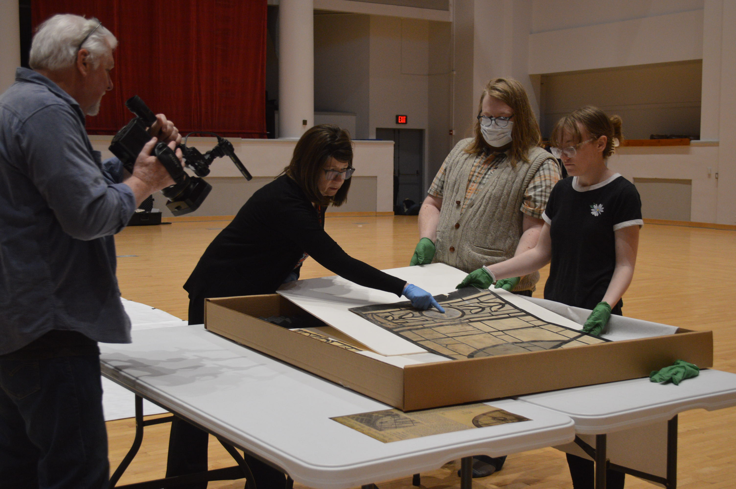 Documentary filmmaker Kevin Kelley records the Grant Wood drawings being reassembled by Teri Van Dorston and her assistants at the Veterans Memorial Building in Cedar Rapids. (photo/Cindy Hadish)