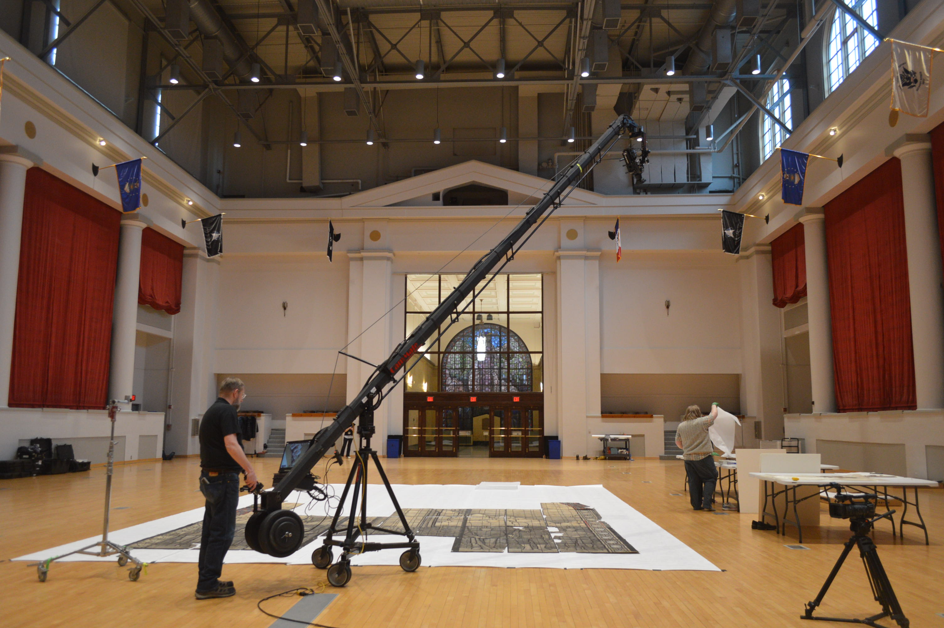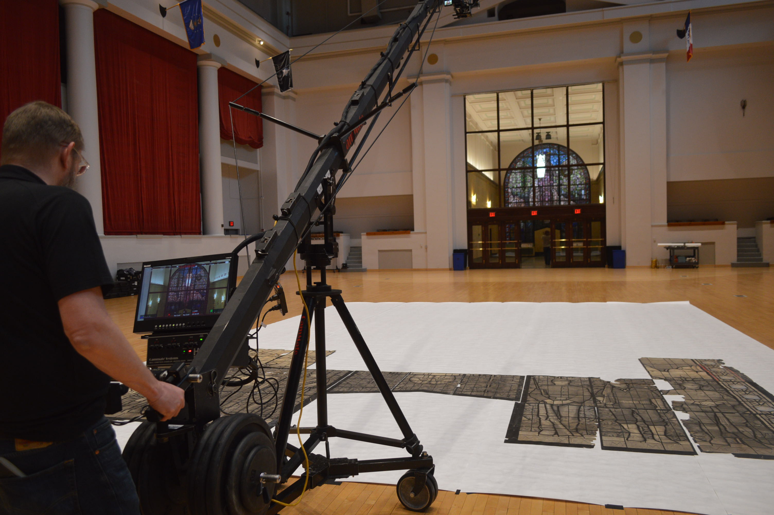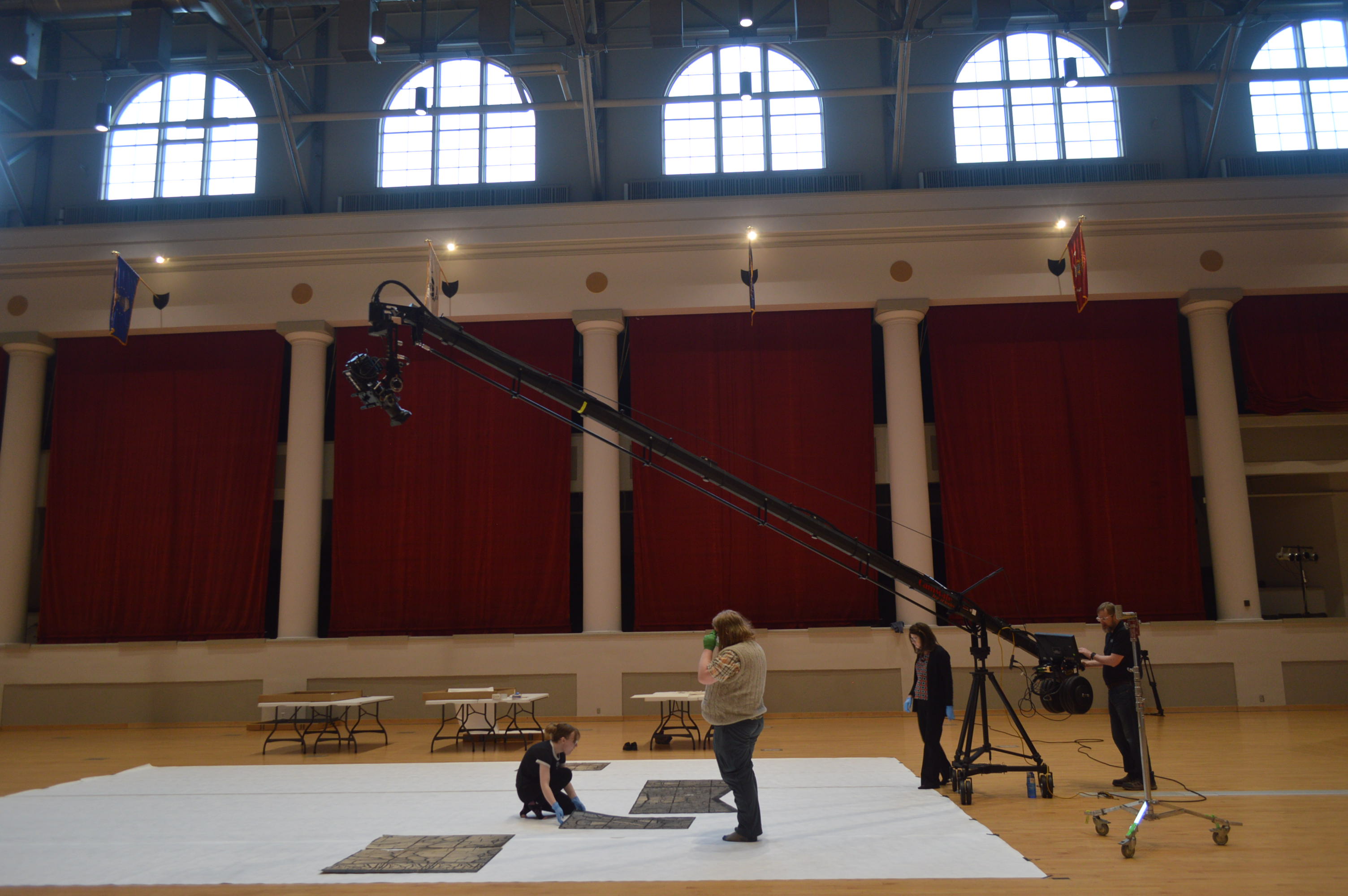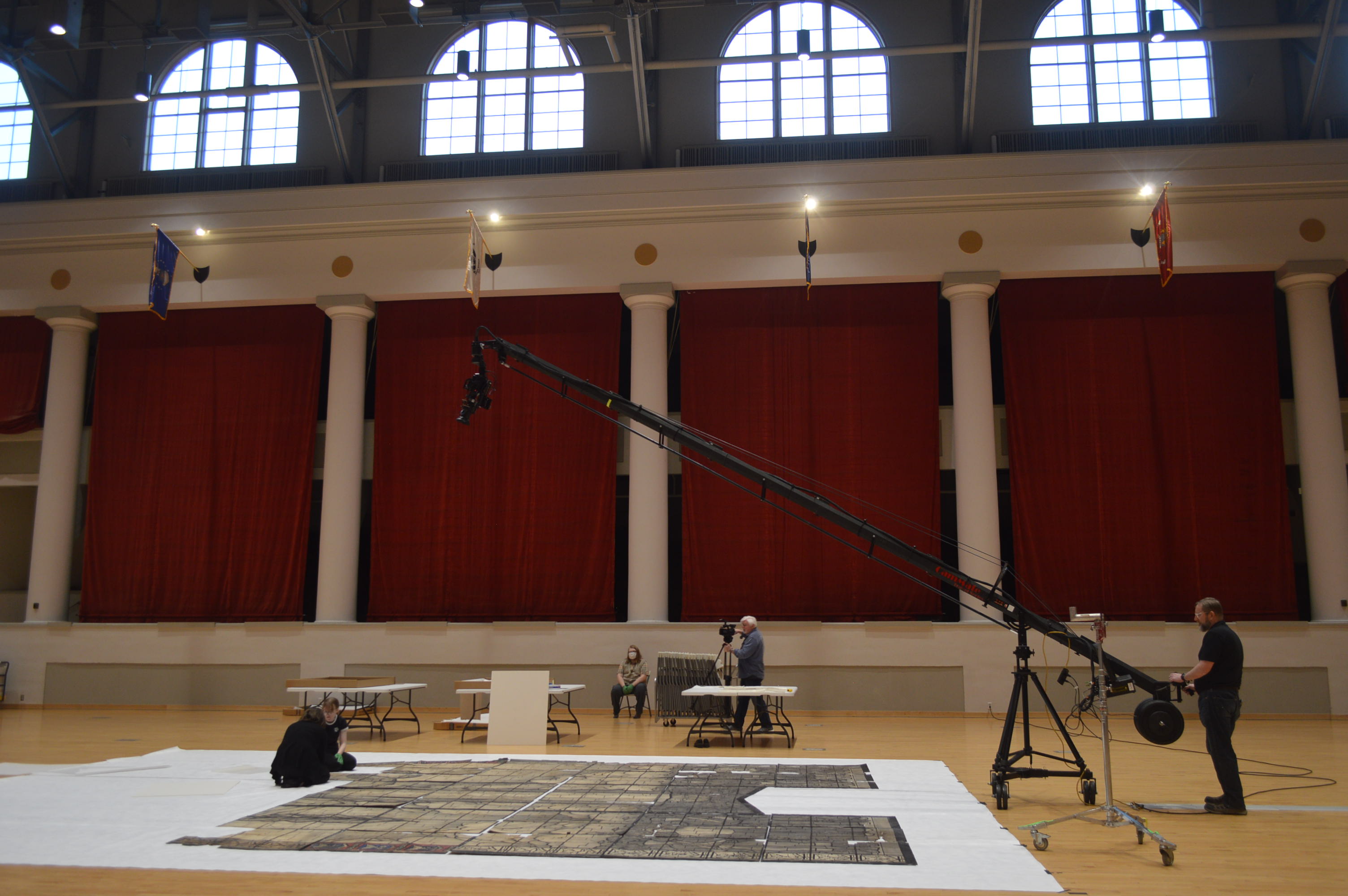 Documentary filmmaker Kevin Kelley records the Grant Wood drawings being reassembled by Teri Van Dorston and her assistants at the Veterans Memorial Building in Cedar Rapids. (photo/Cindy Hadish)