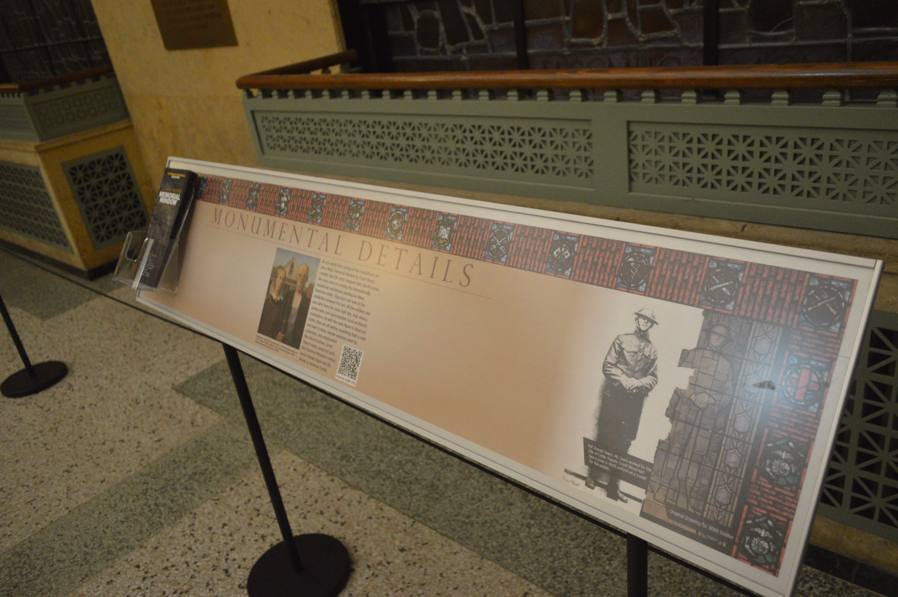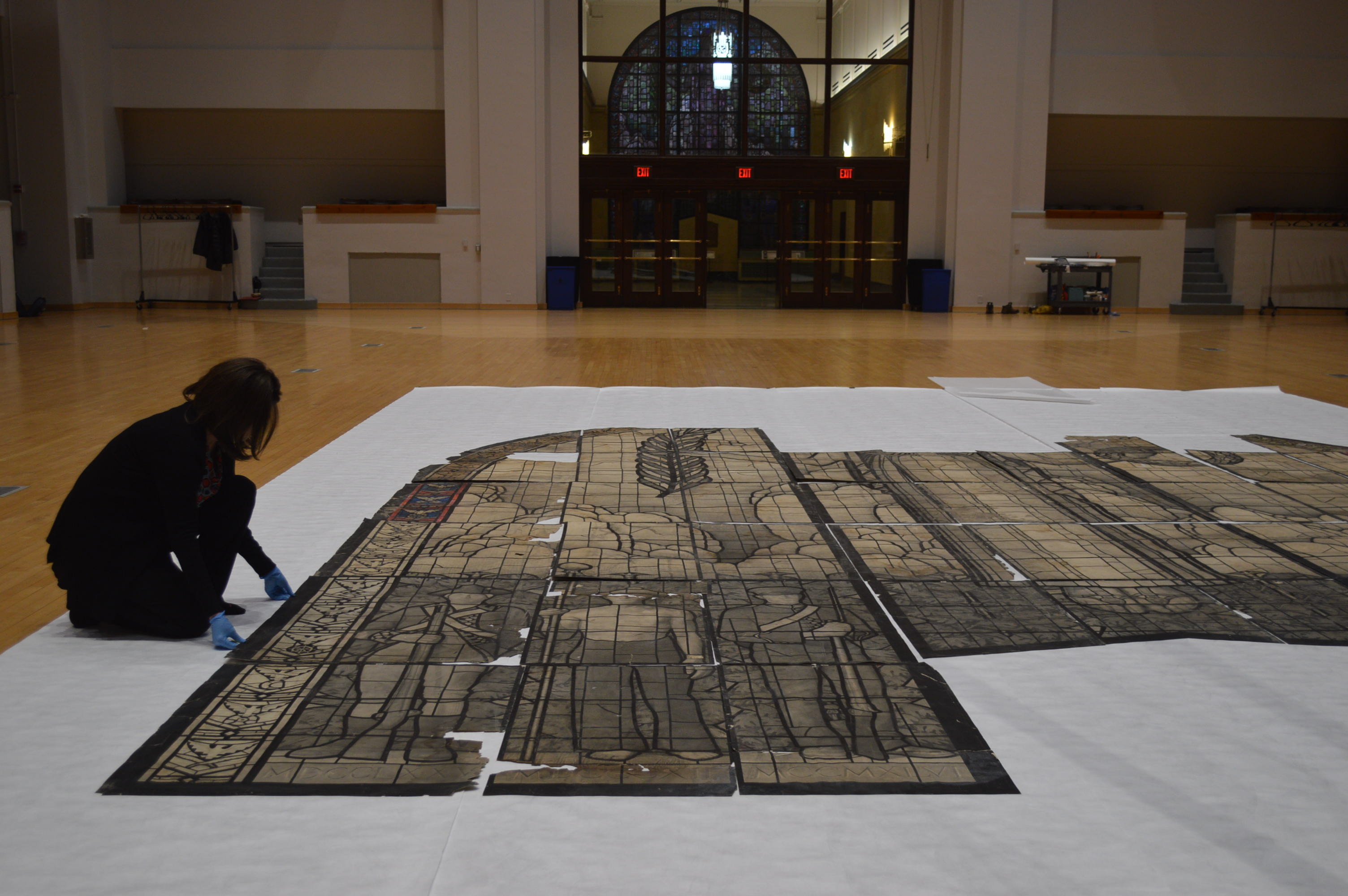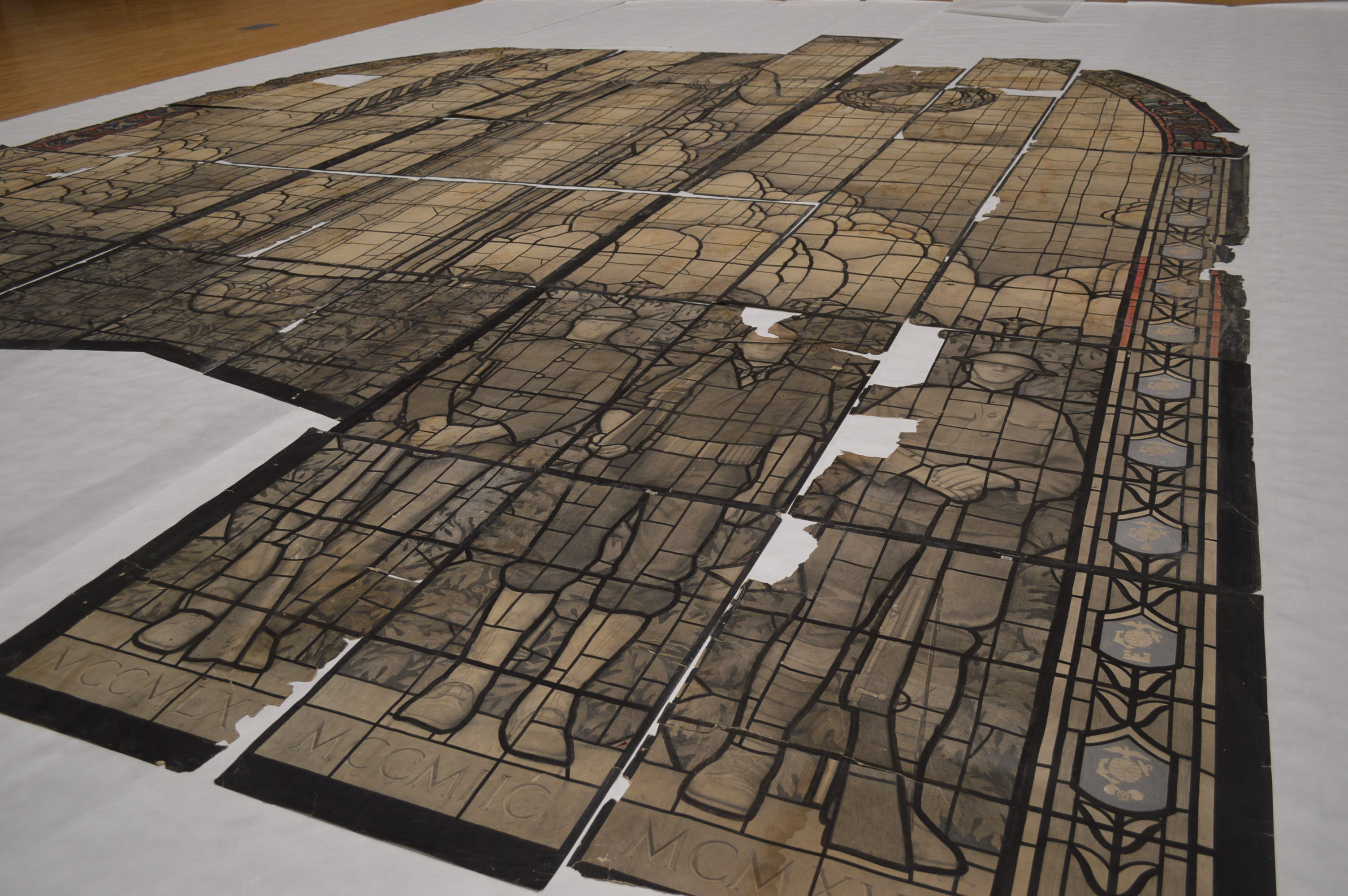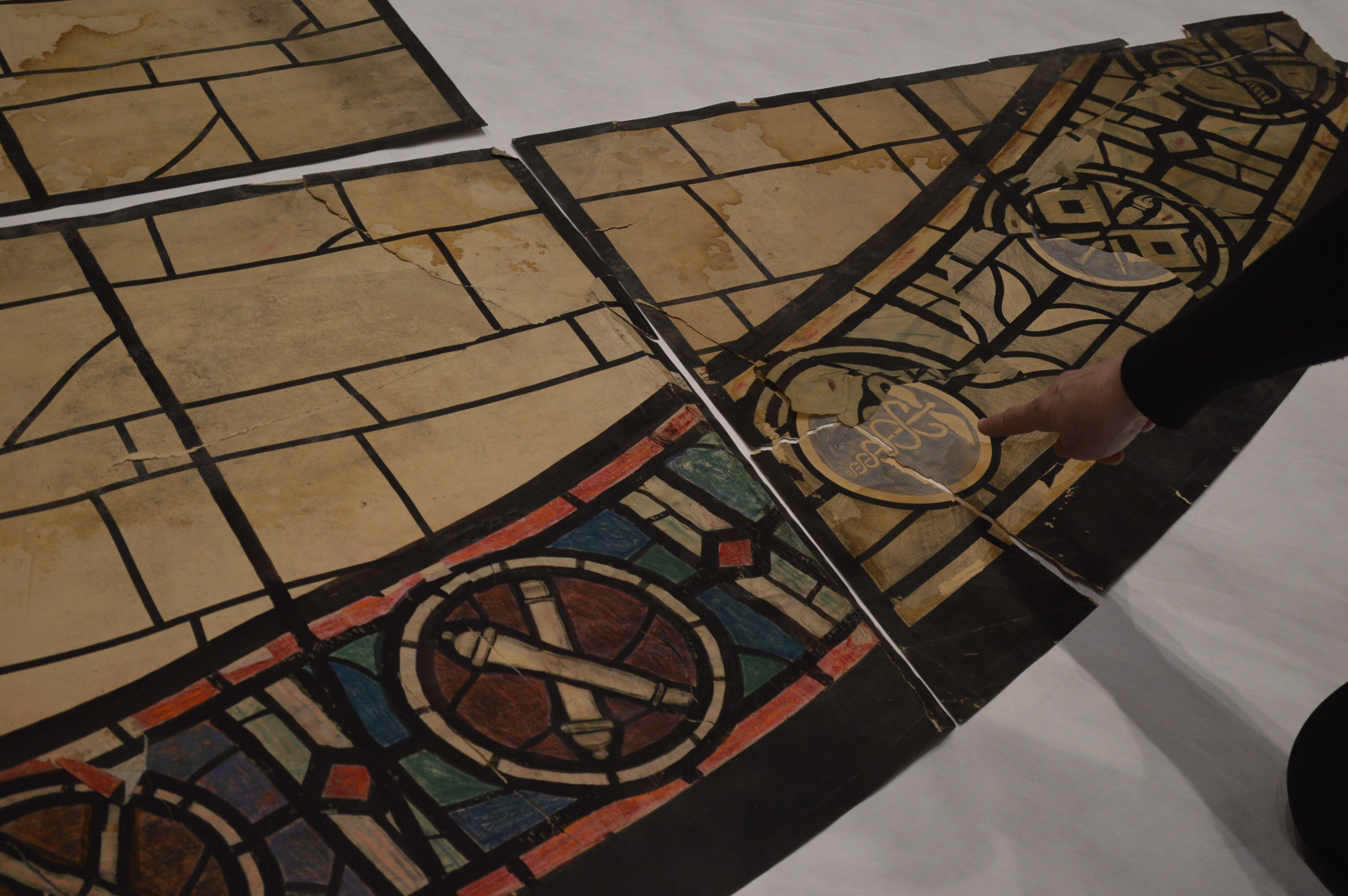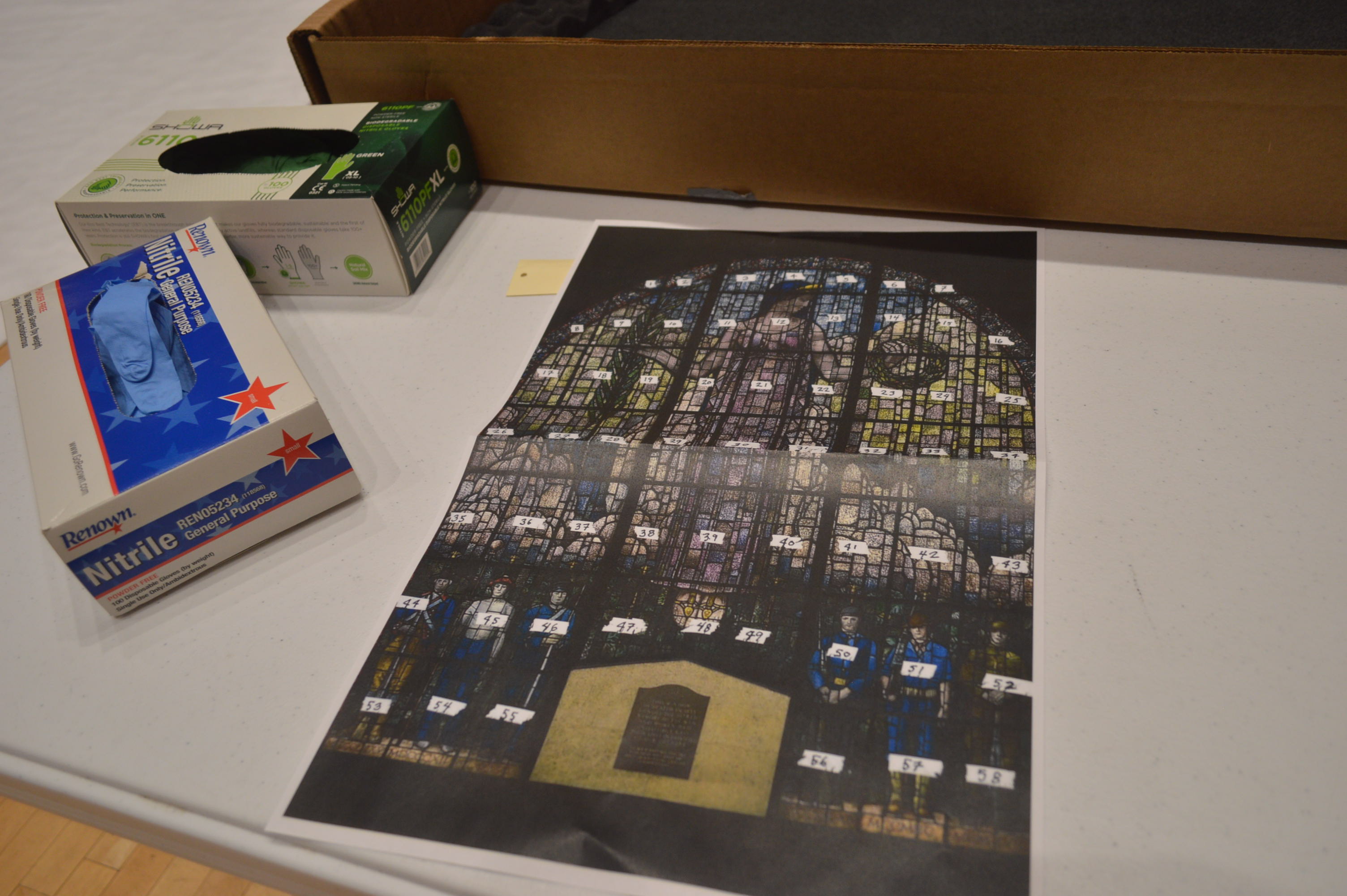 “These were found stuffed above the steam pipes,” said Teri Van Dorston, museum manager for the Veterans Memorial Building & Commission, pointing to full-scale original drawings the renowned artist drew to create the celebrated window.
