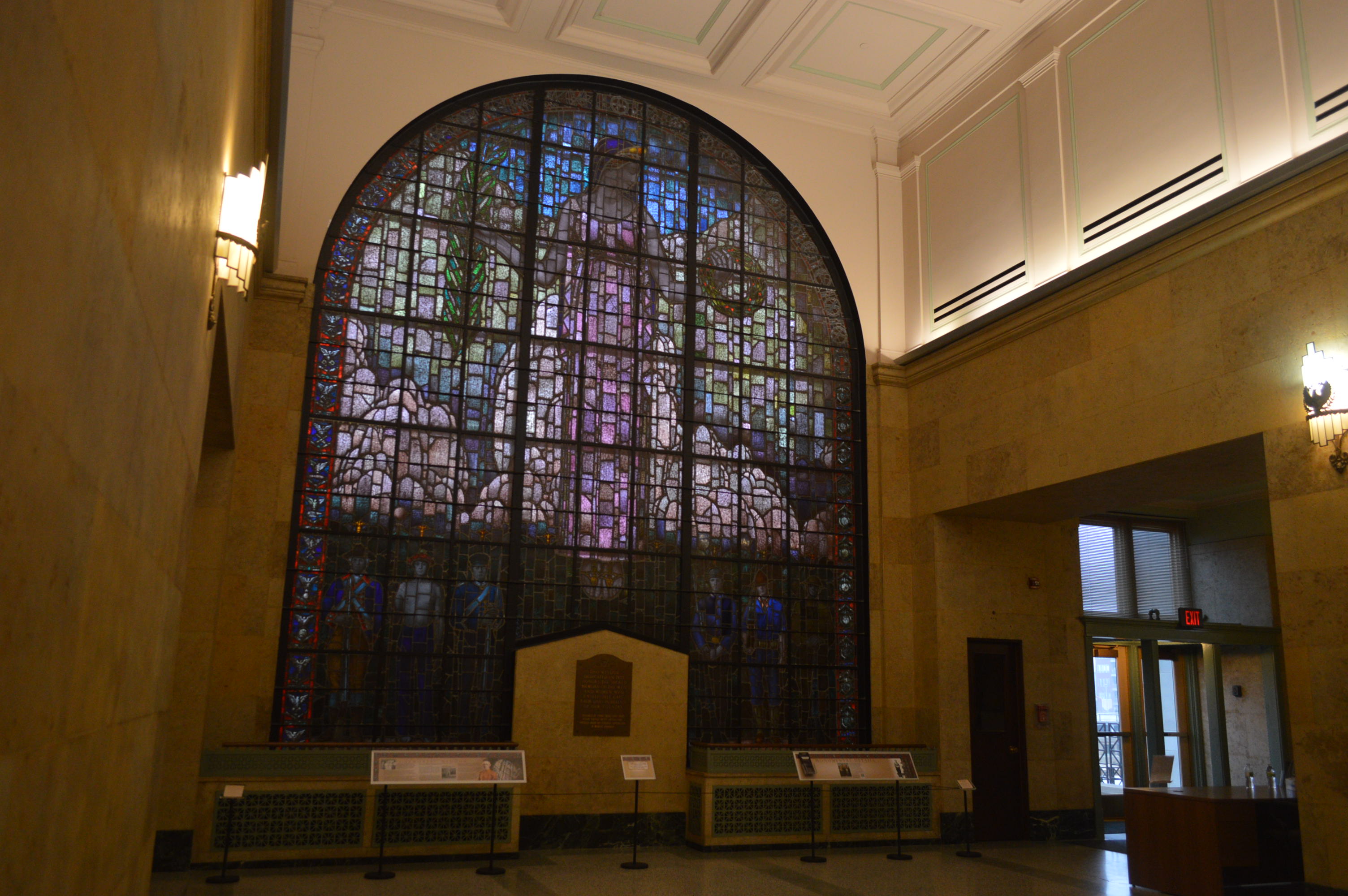 The window pays tribute to the memory of veterans of the six wars Americans had fought to that time, with Wood’s sister, Nan Wood Graham — also Wood’s model in “American Gothic” — serving as the model for the central figure, said to represent the Lady of Peace.