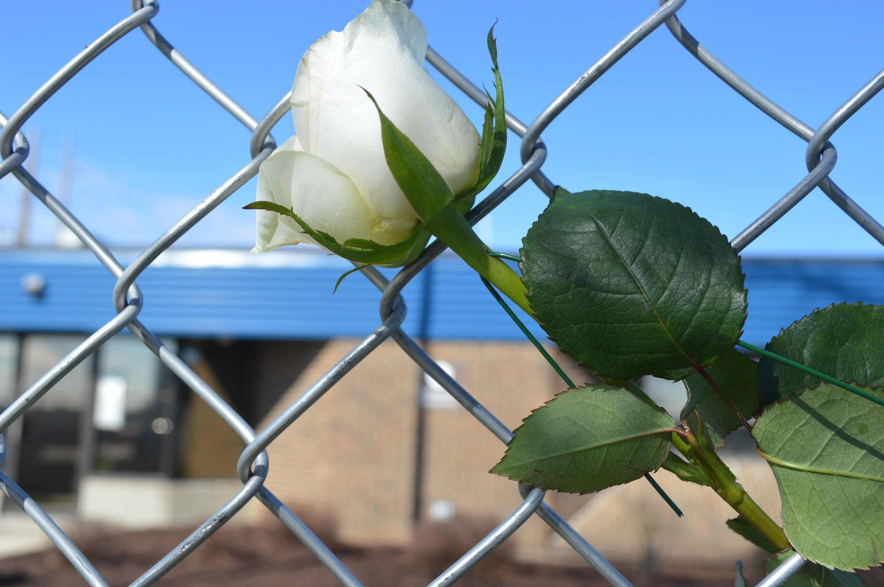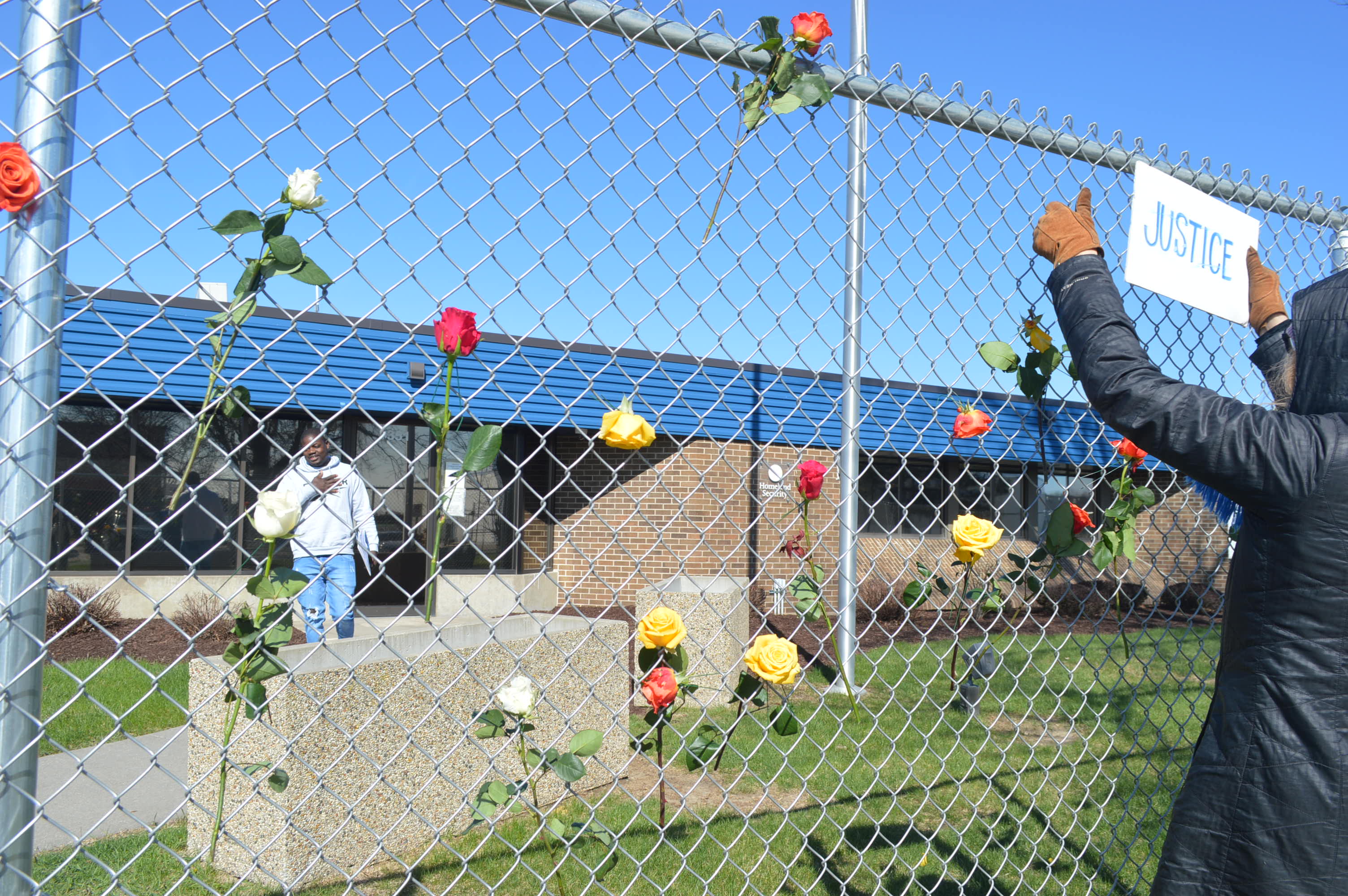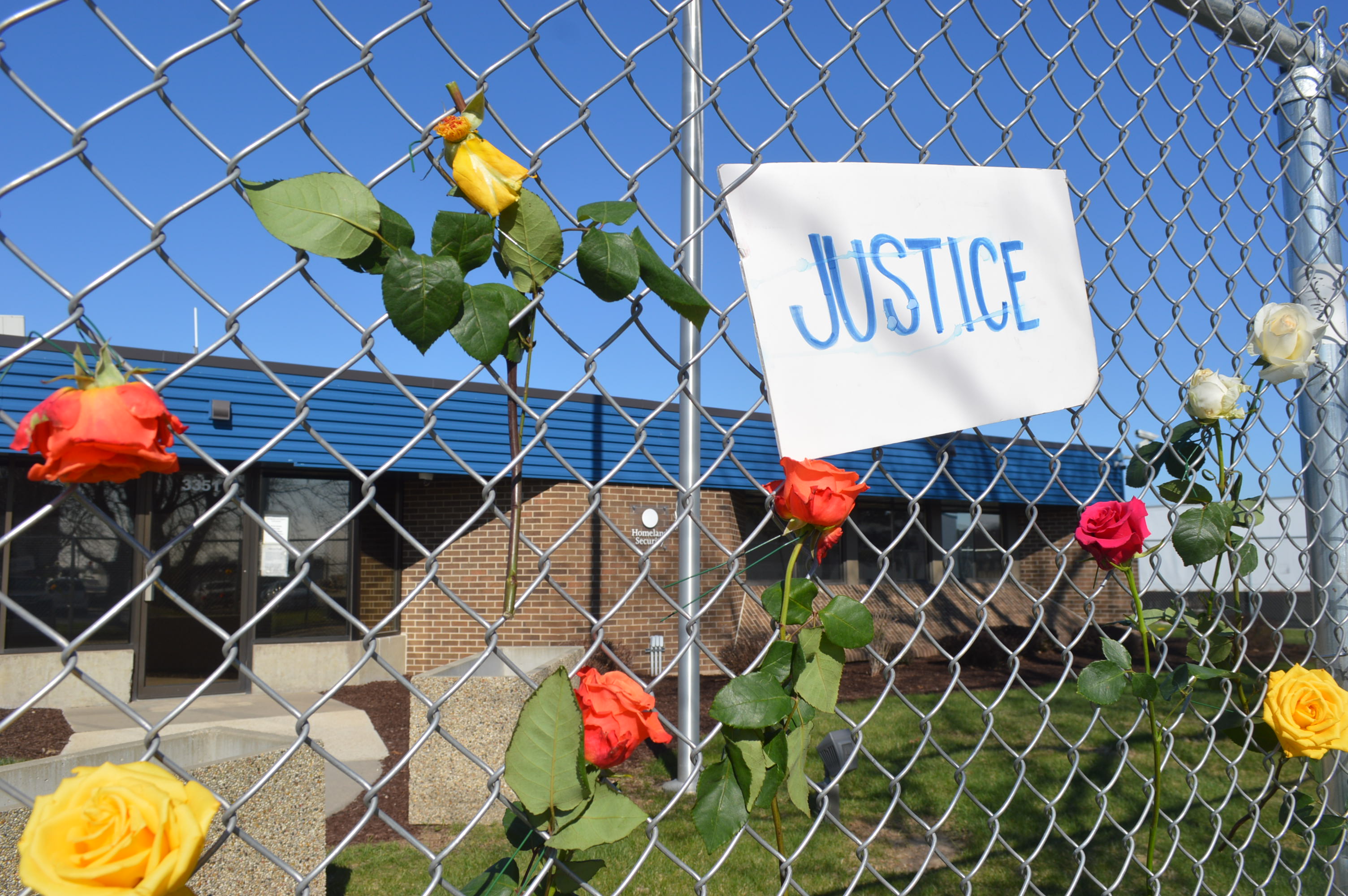 Roses were inserted in the new fence outside of the ICE office in Cedar Rapids, Iowa. (photo/Cindy Hadish)