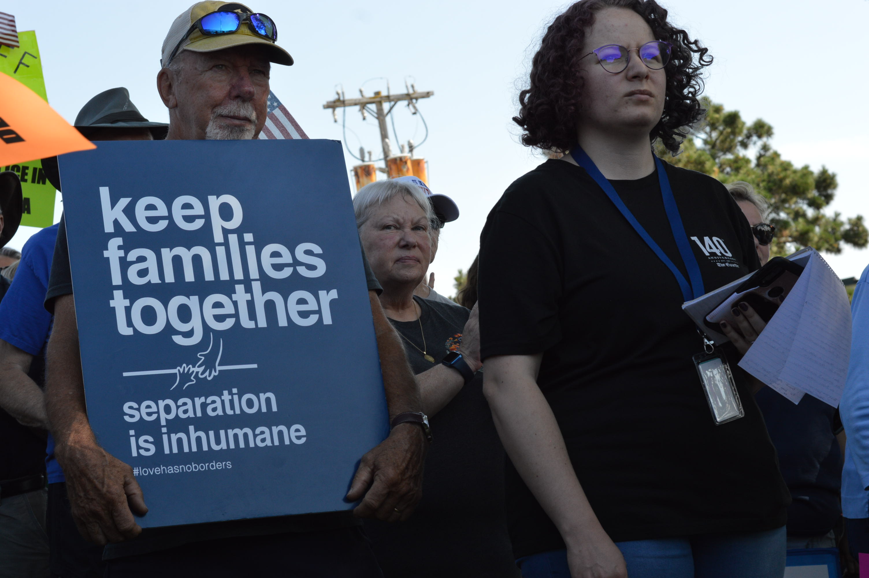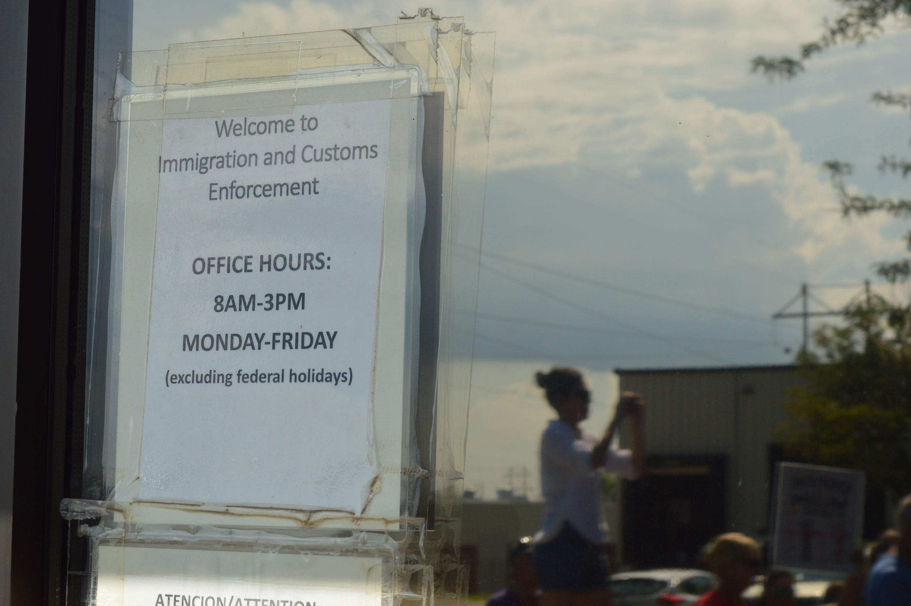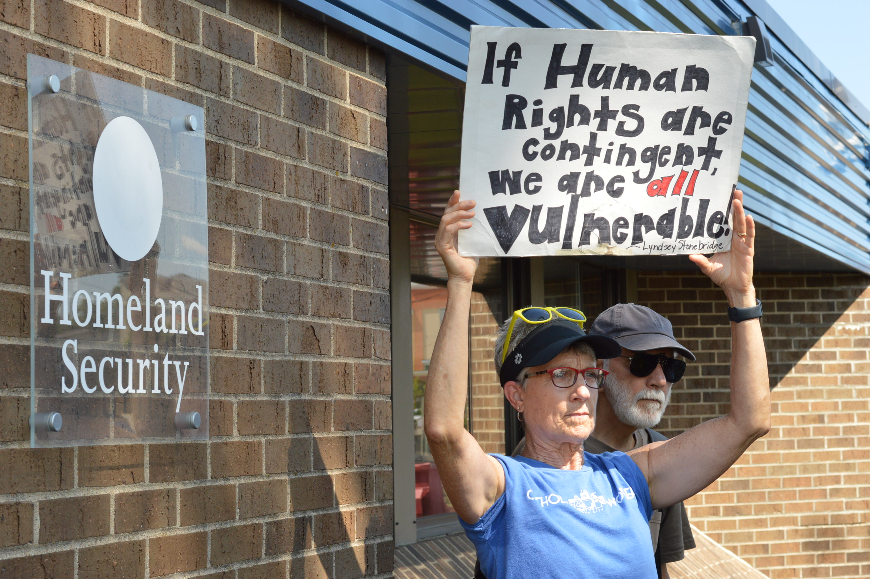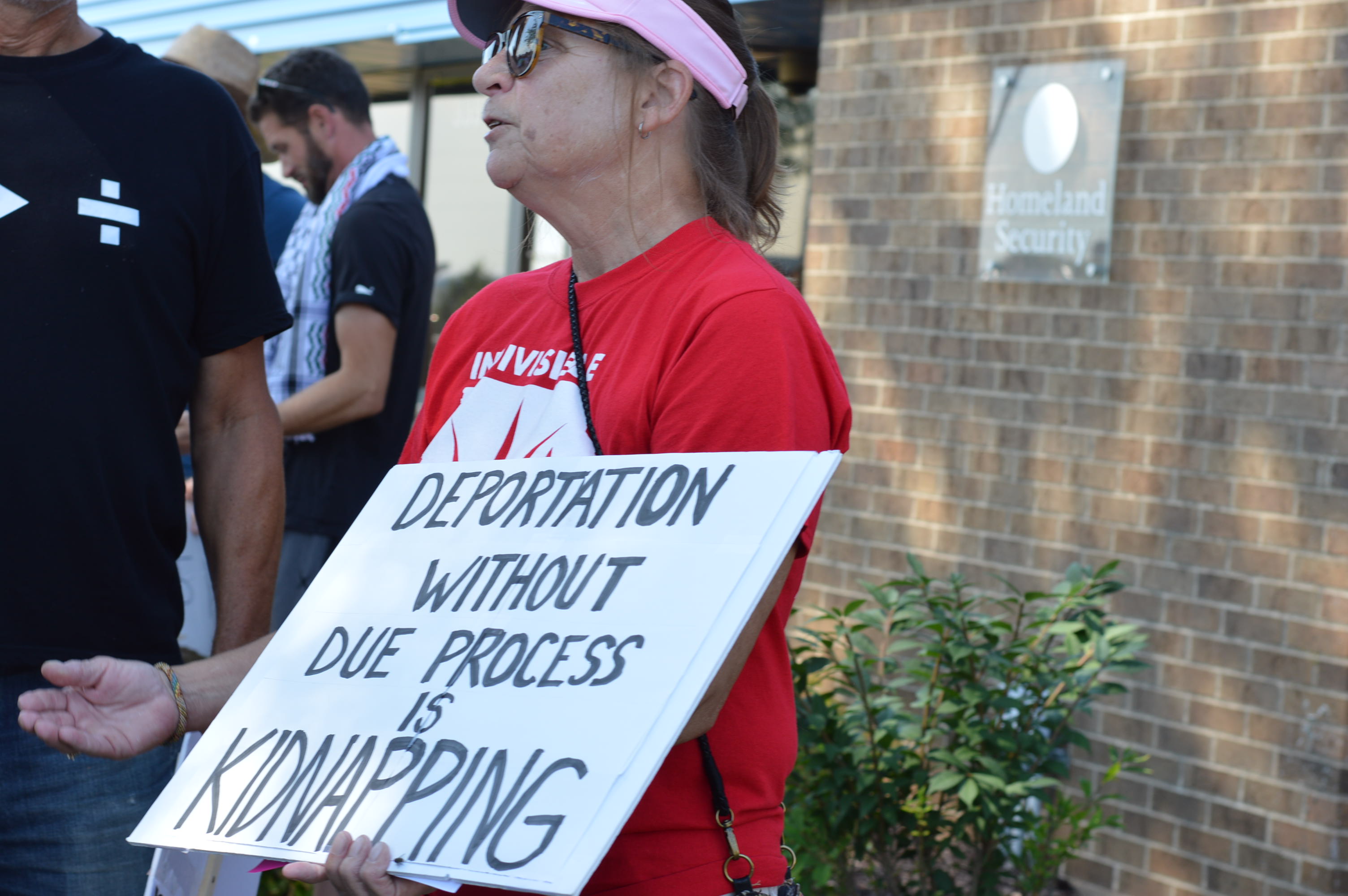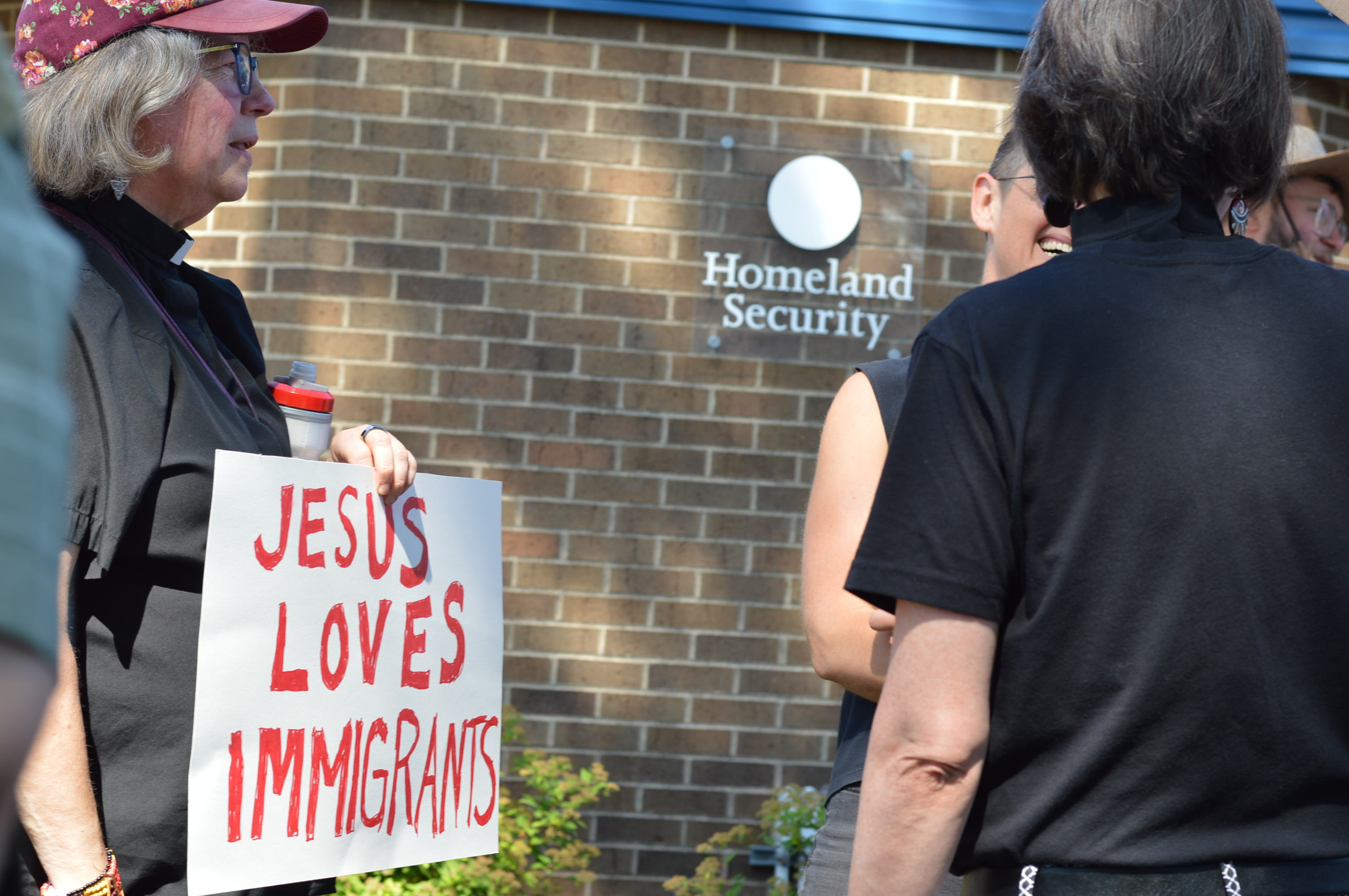 The Rev. Peggy Garrigues, of Solon United Methodist Church, held a sign outside of the ICE office reading “Jesus Loves Immigrants.”
