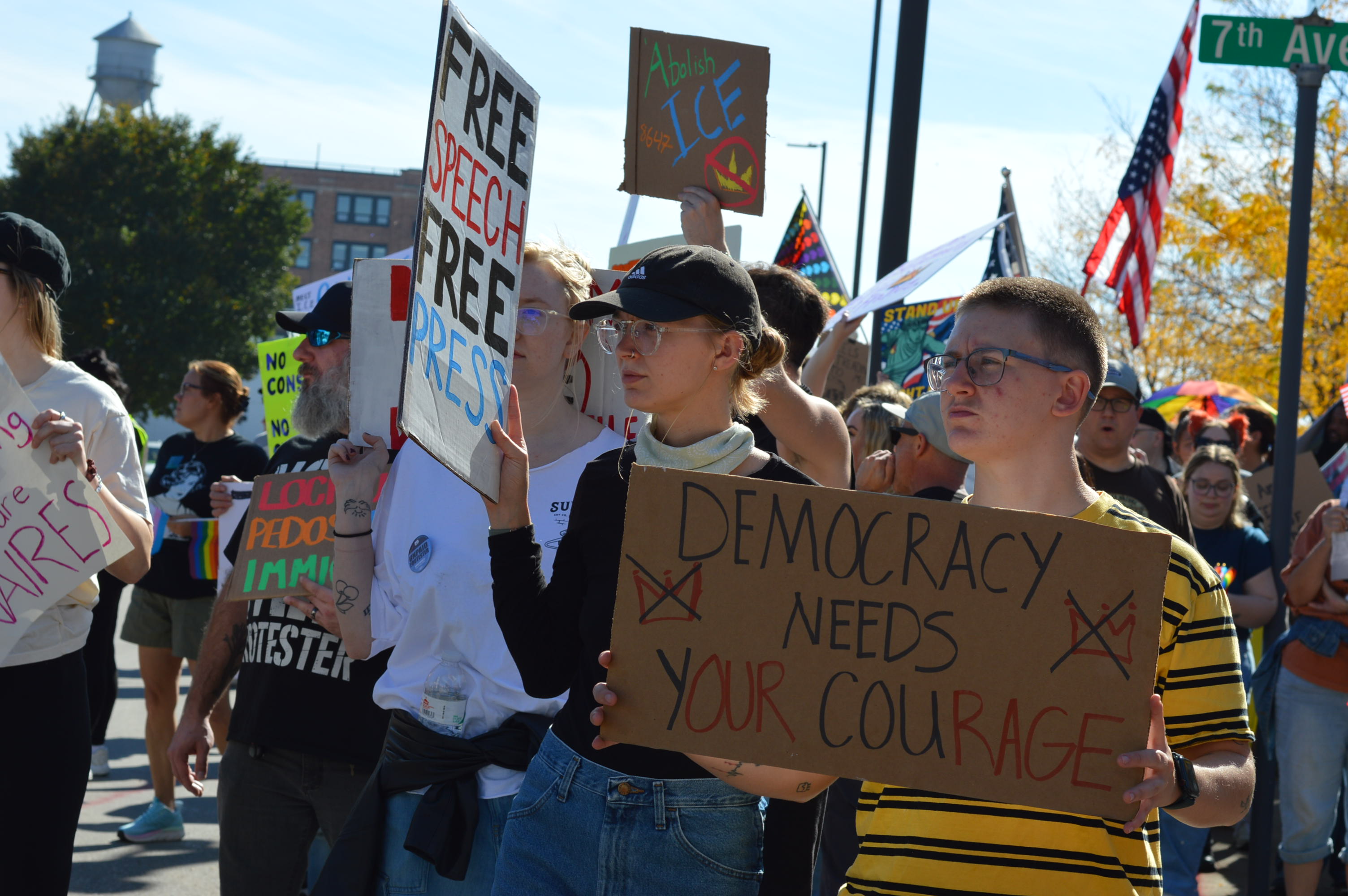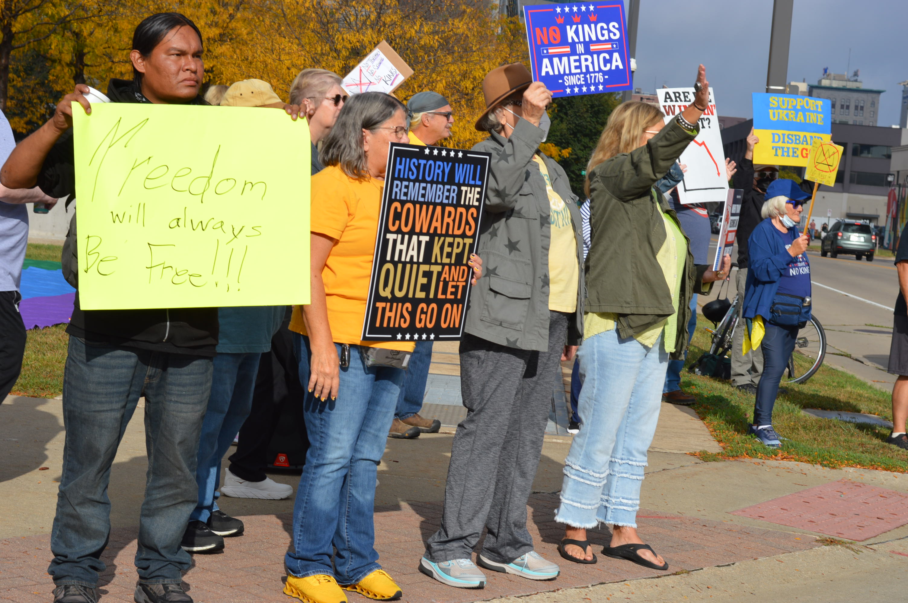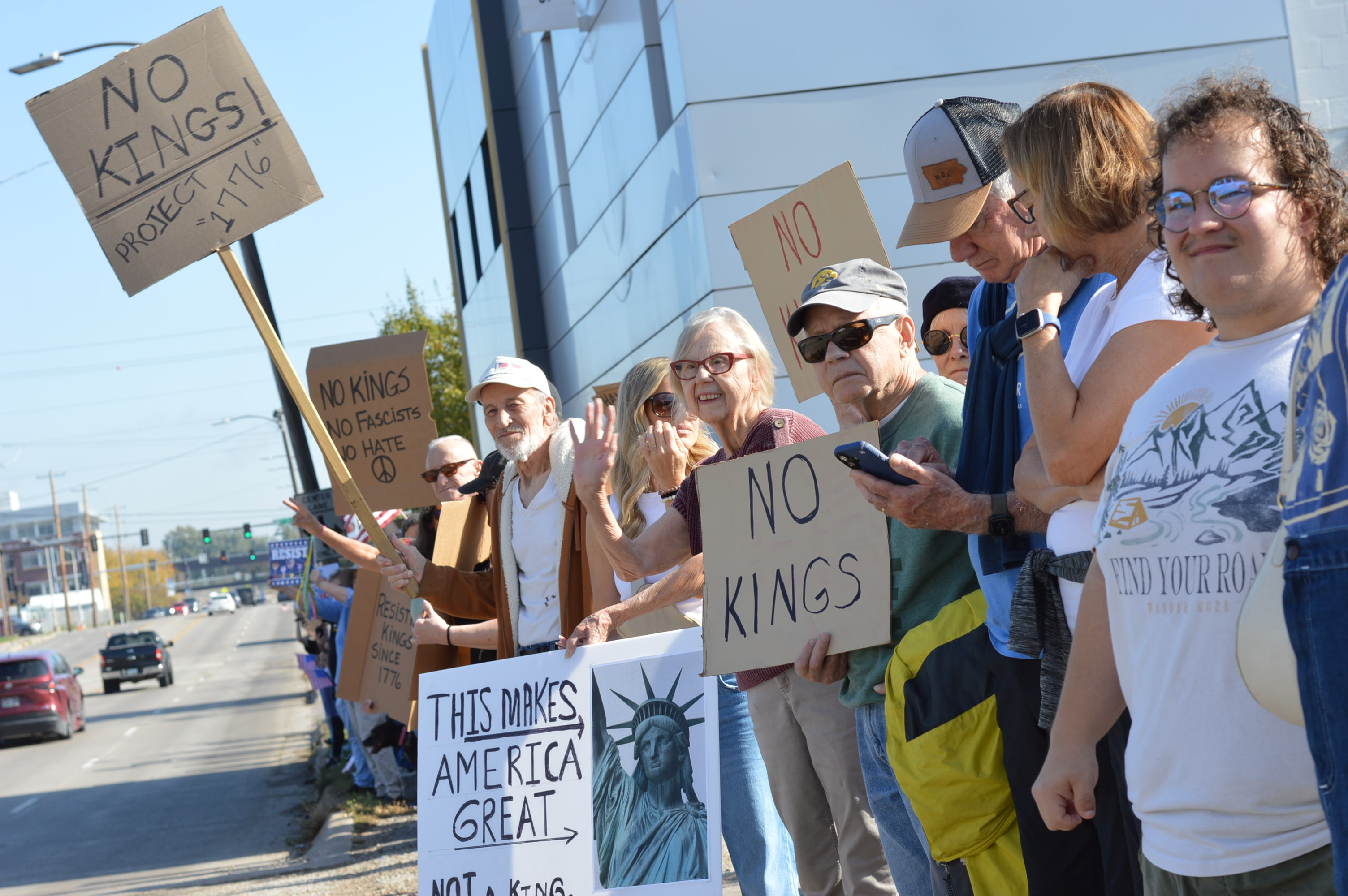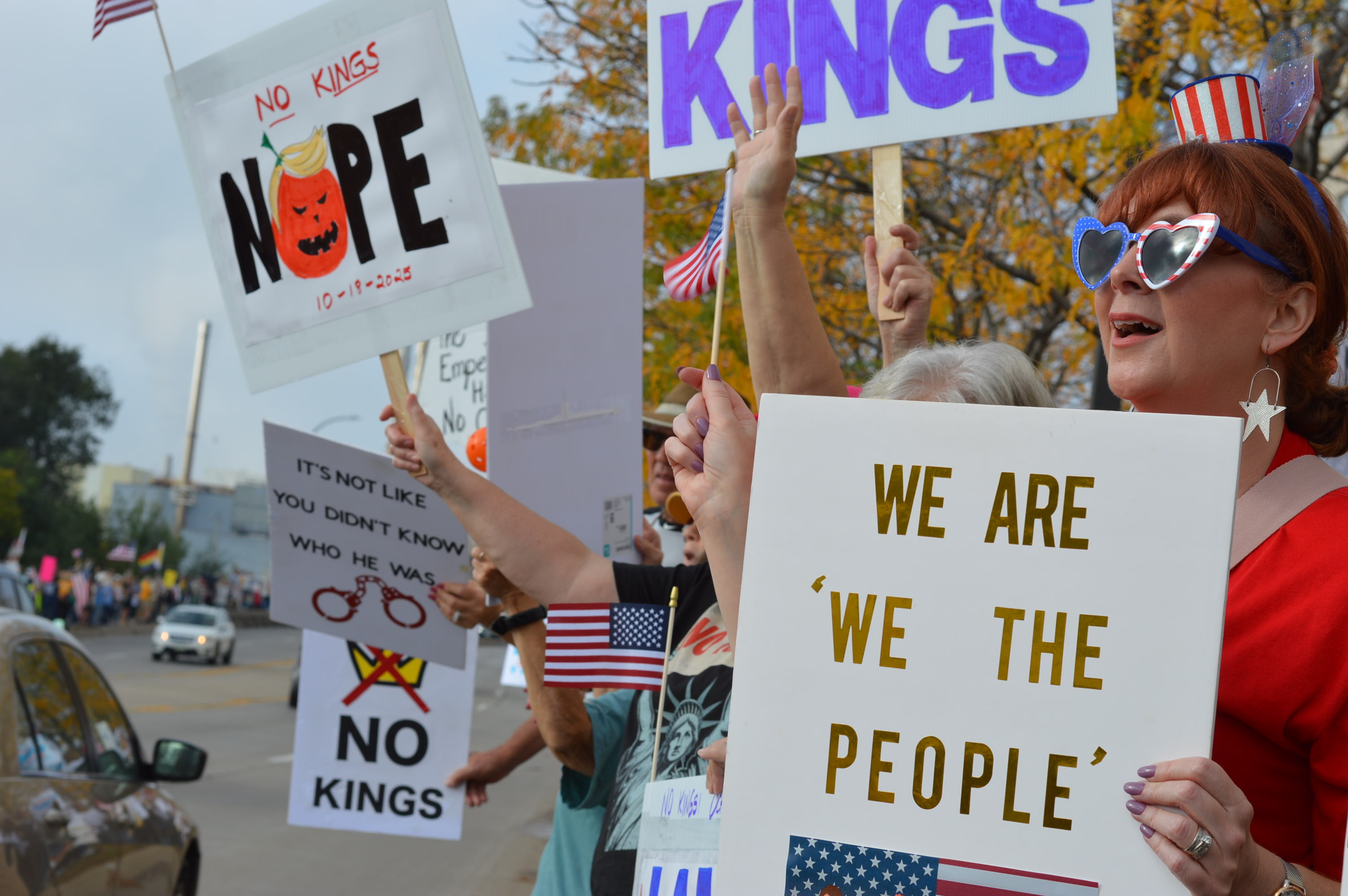 CEDAR RAPIDS, Iowa — Thousands of demonstrators lined Eighth Avenue SE in Cedar Rapids to peacefully protest the Trump administration during a nationwide “No Kings” day on Saturday, Oct. 18, 2025.