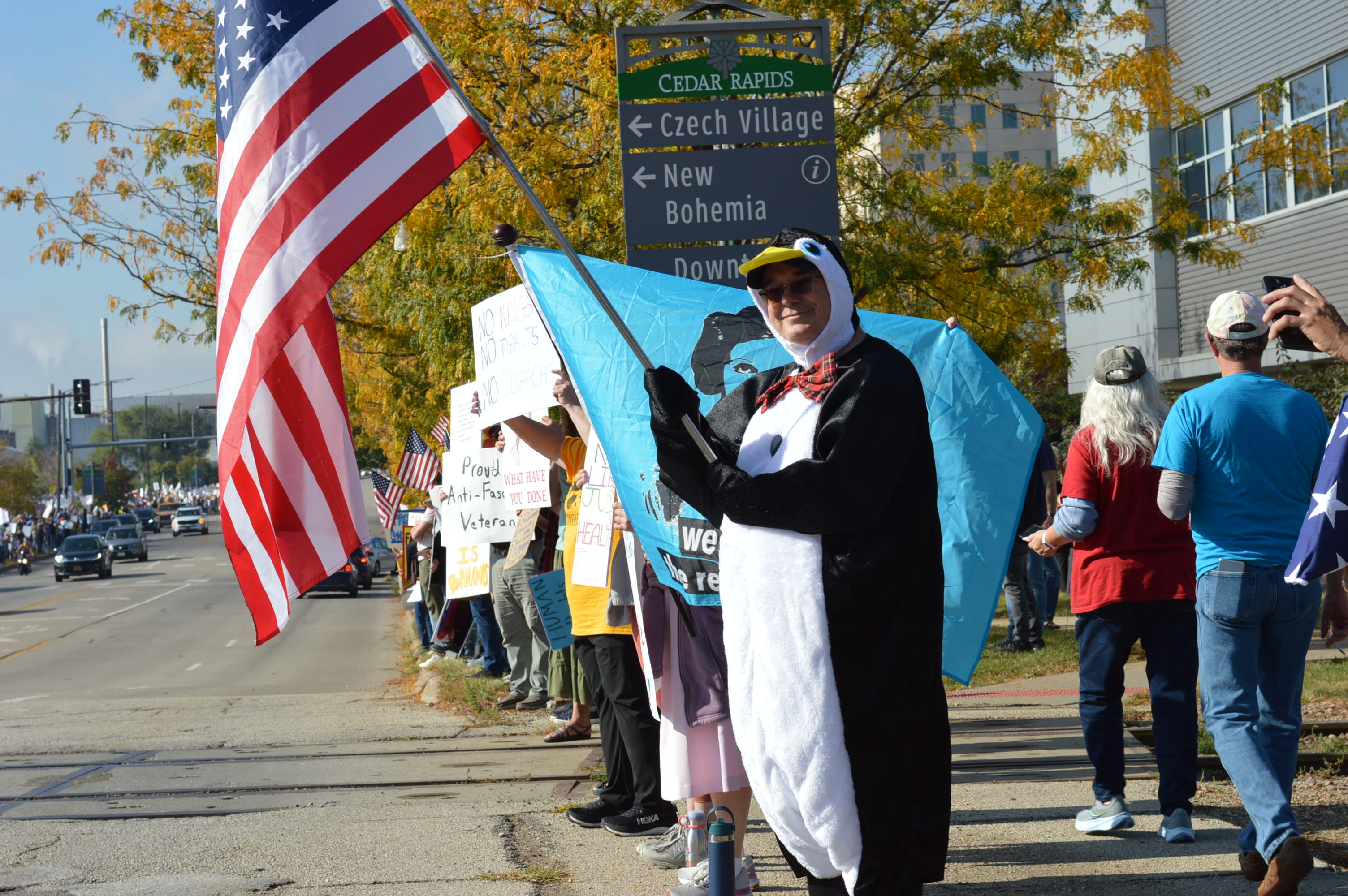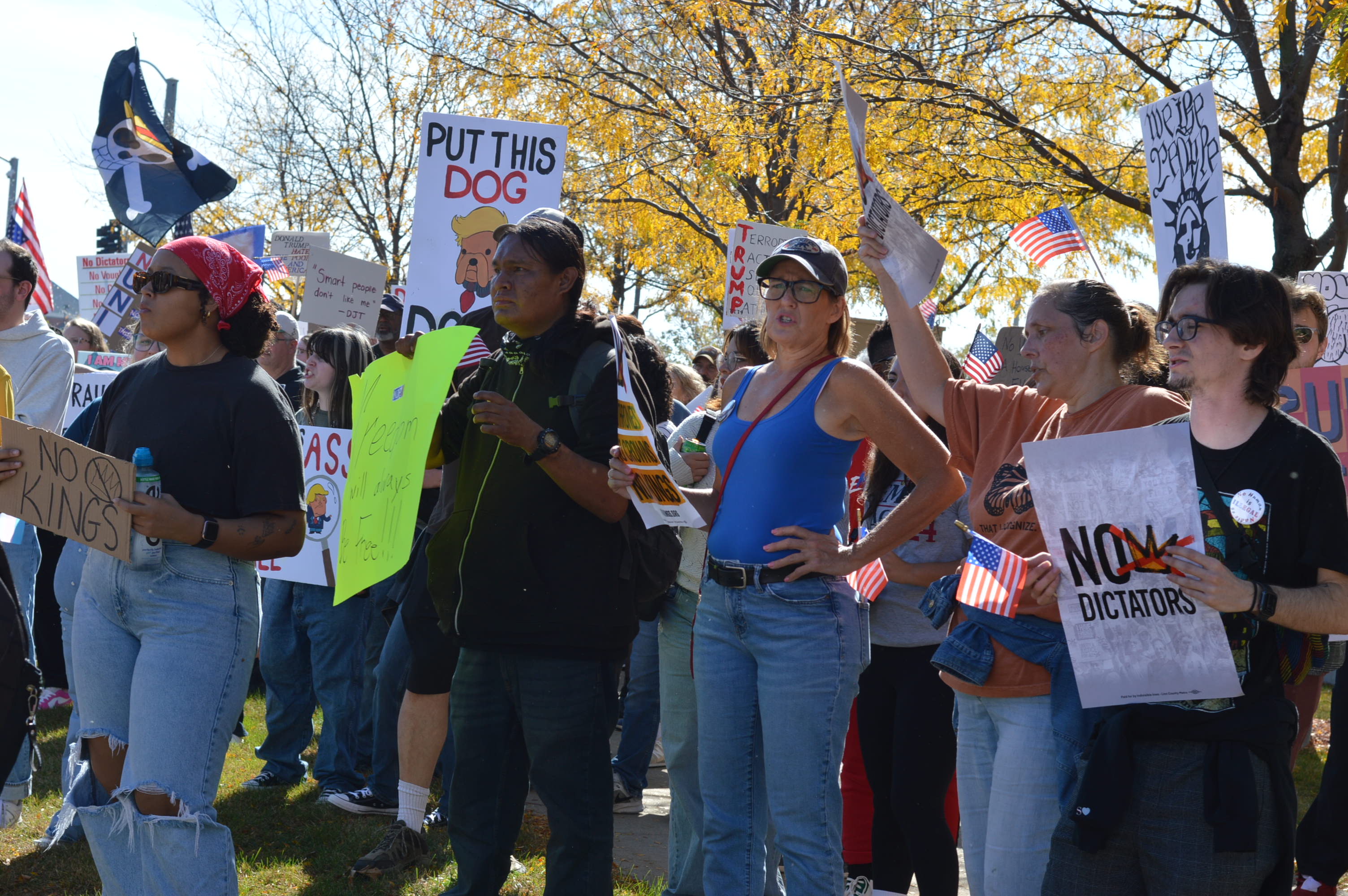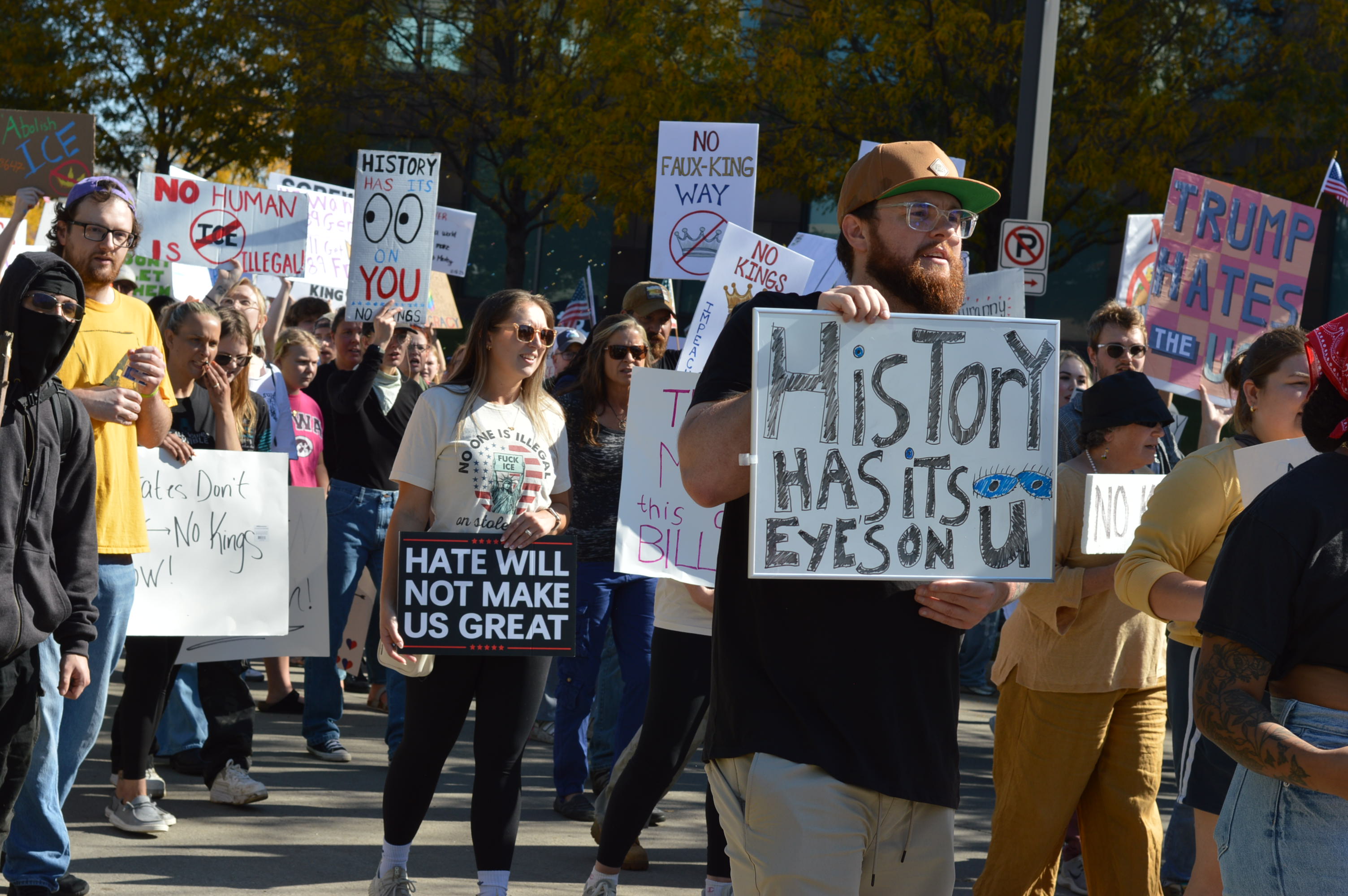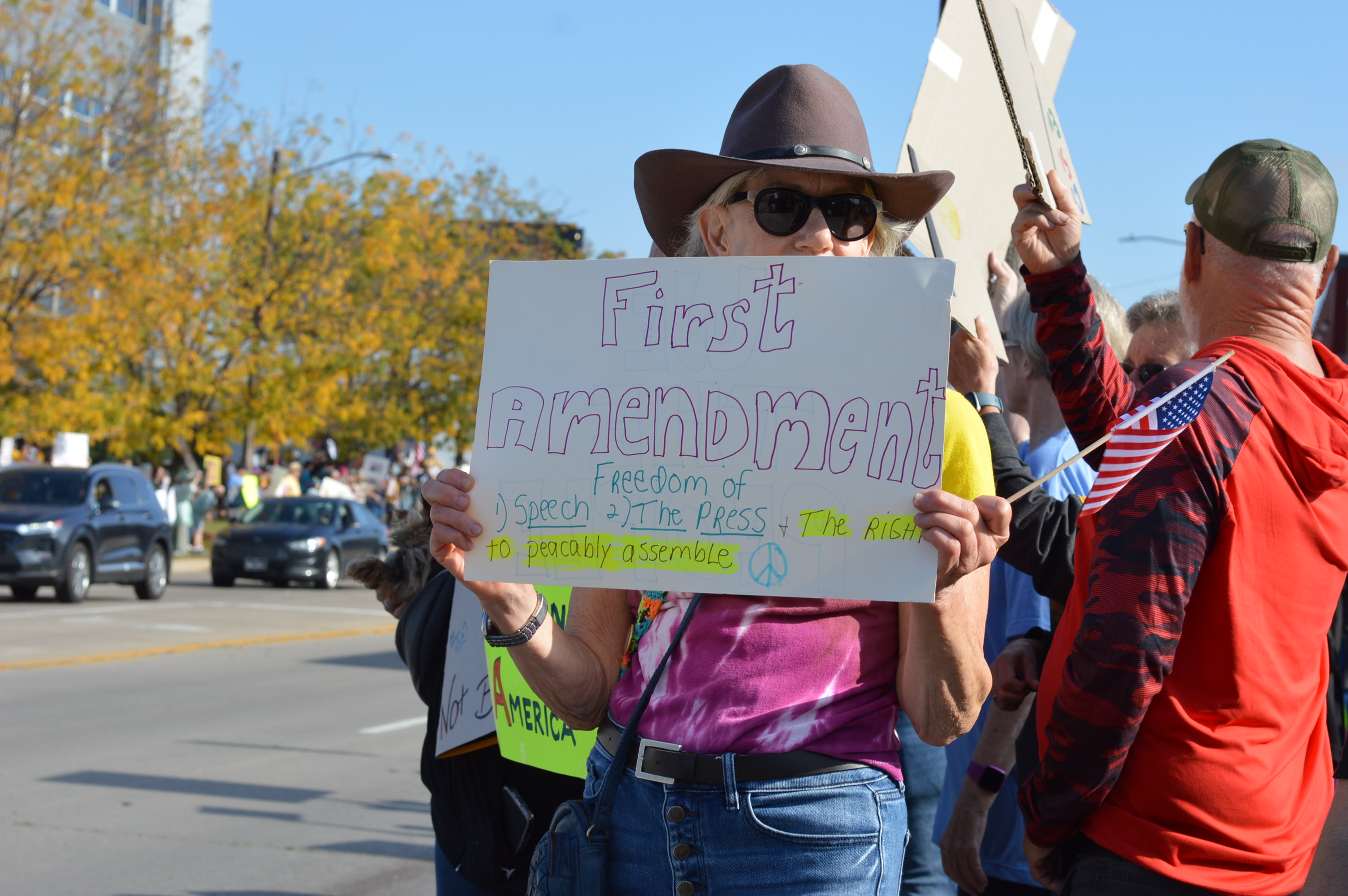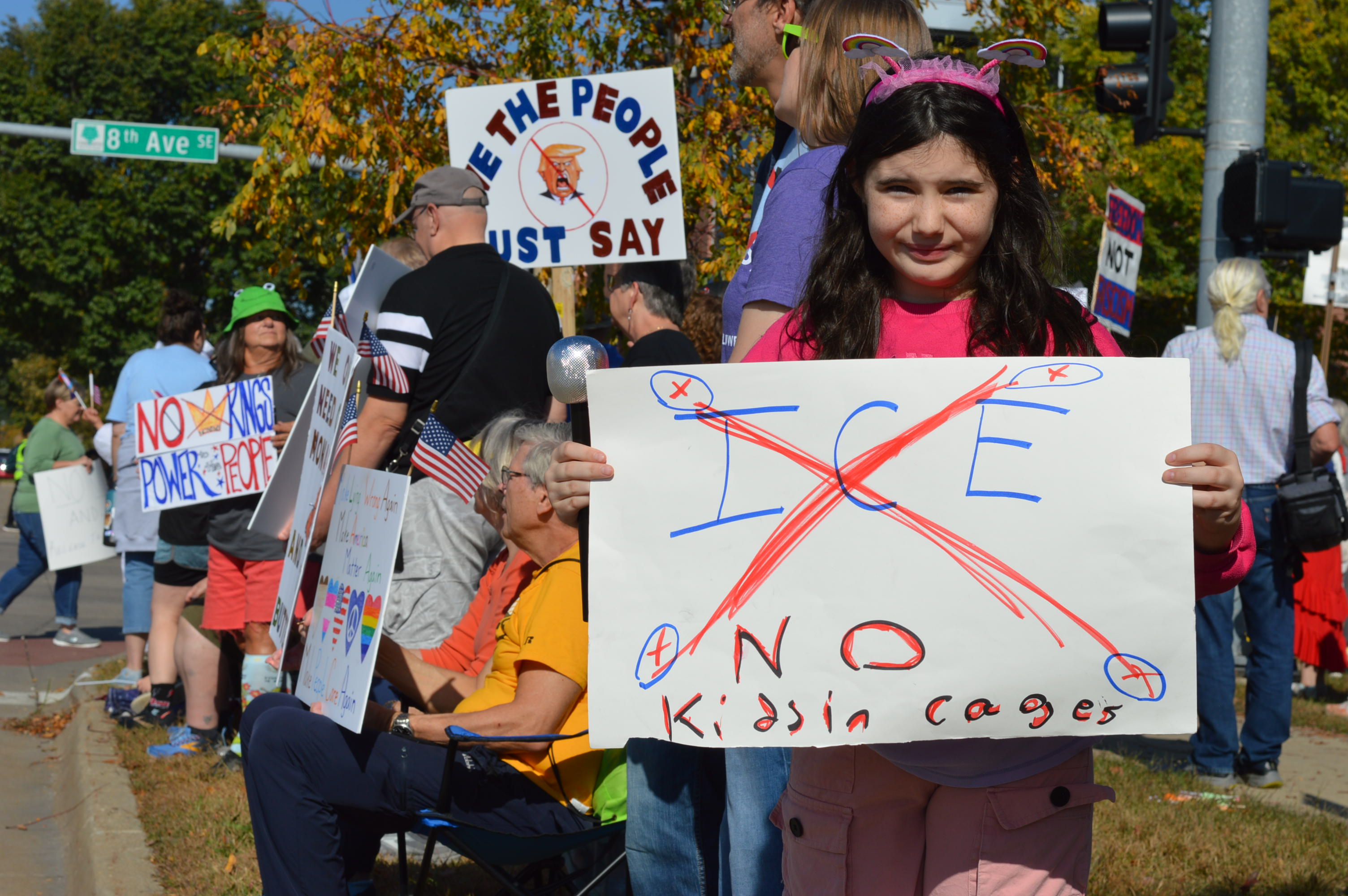 CEDAR RAPIDS, Iowa — Thousands of demonstrators lined Eighth Avenue SE in Cedar Rapids to peacefully protest the Trump administration during a nationwide “No Kings” day on Saturday, Oct. 18, 2025.