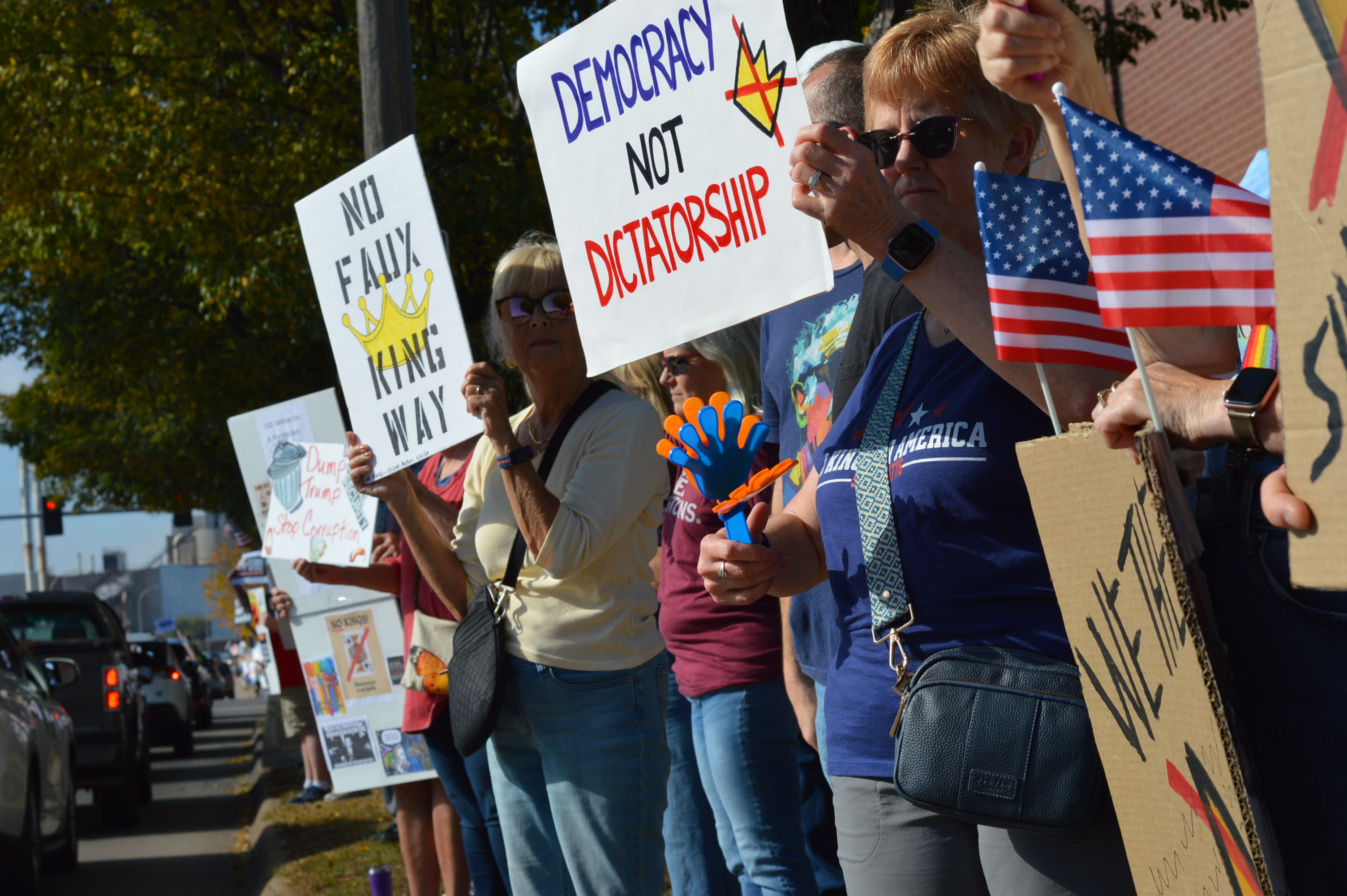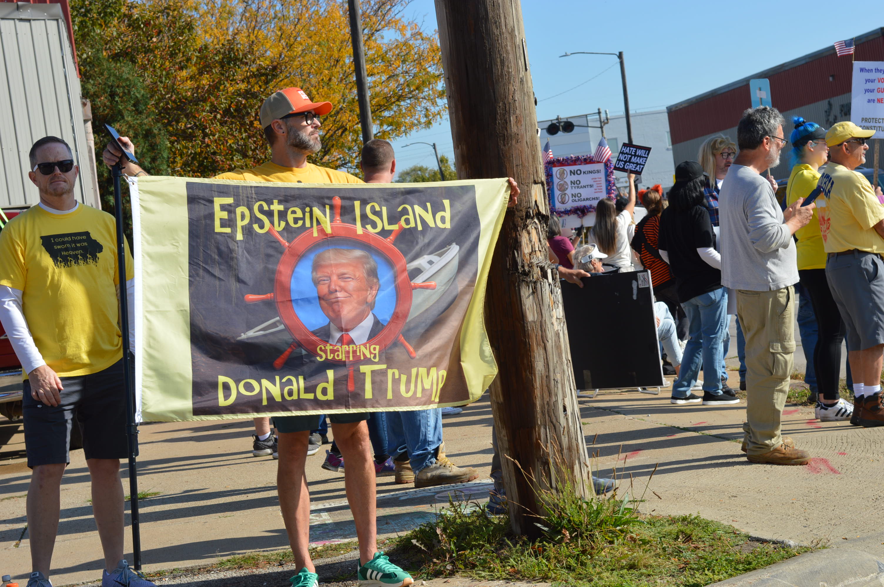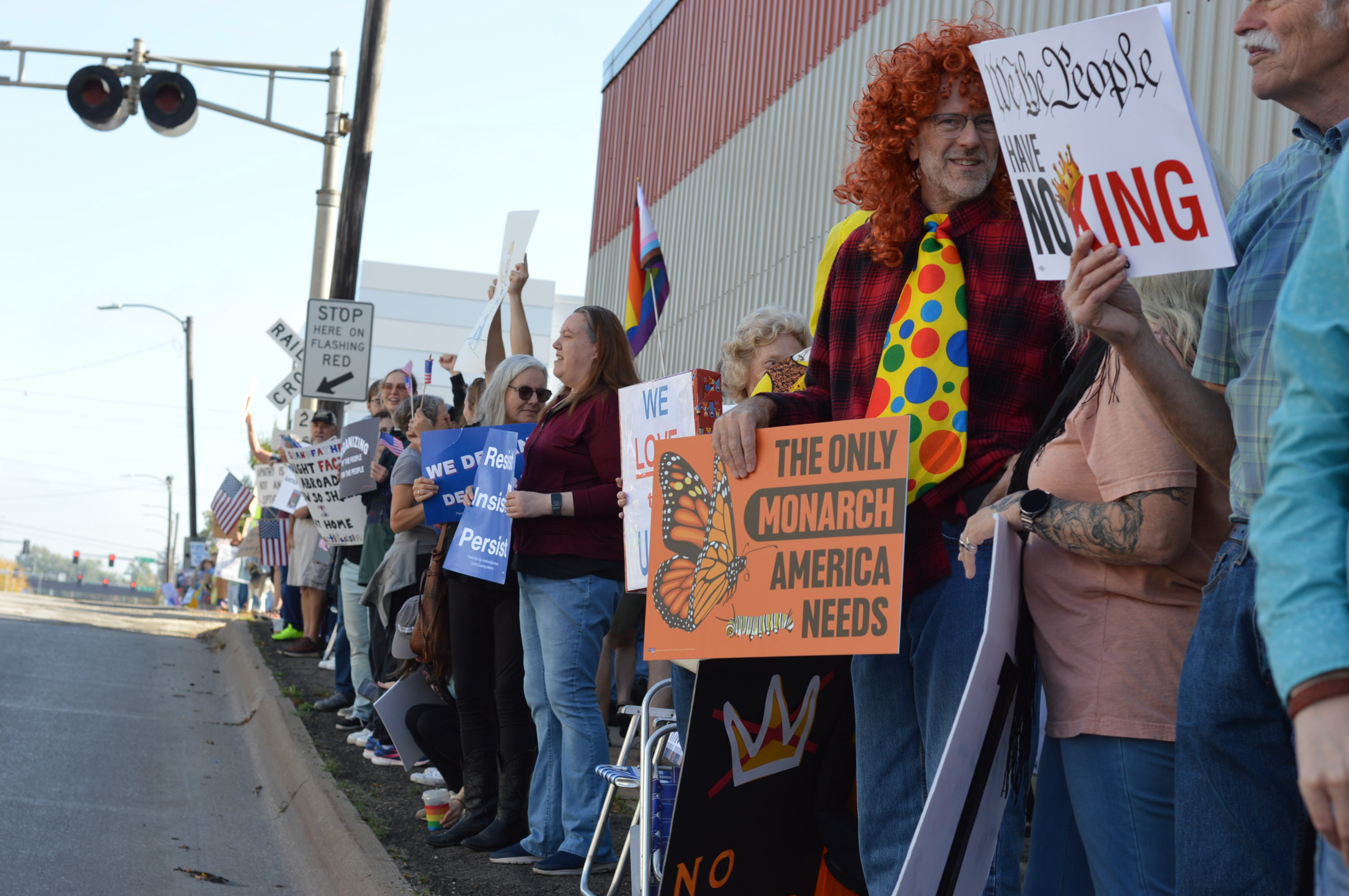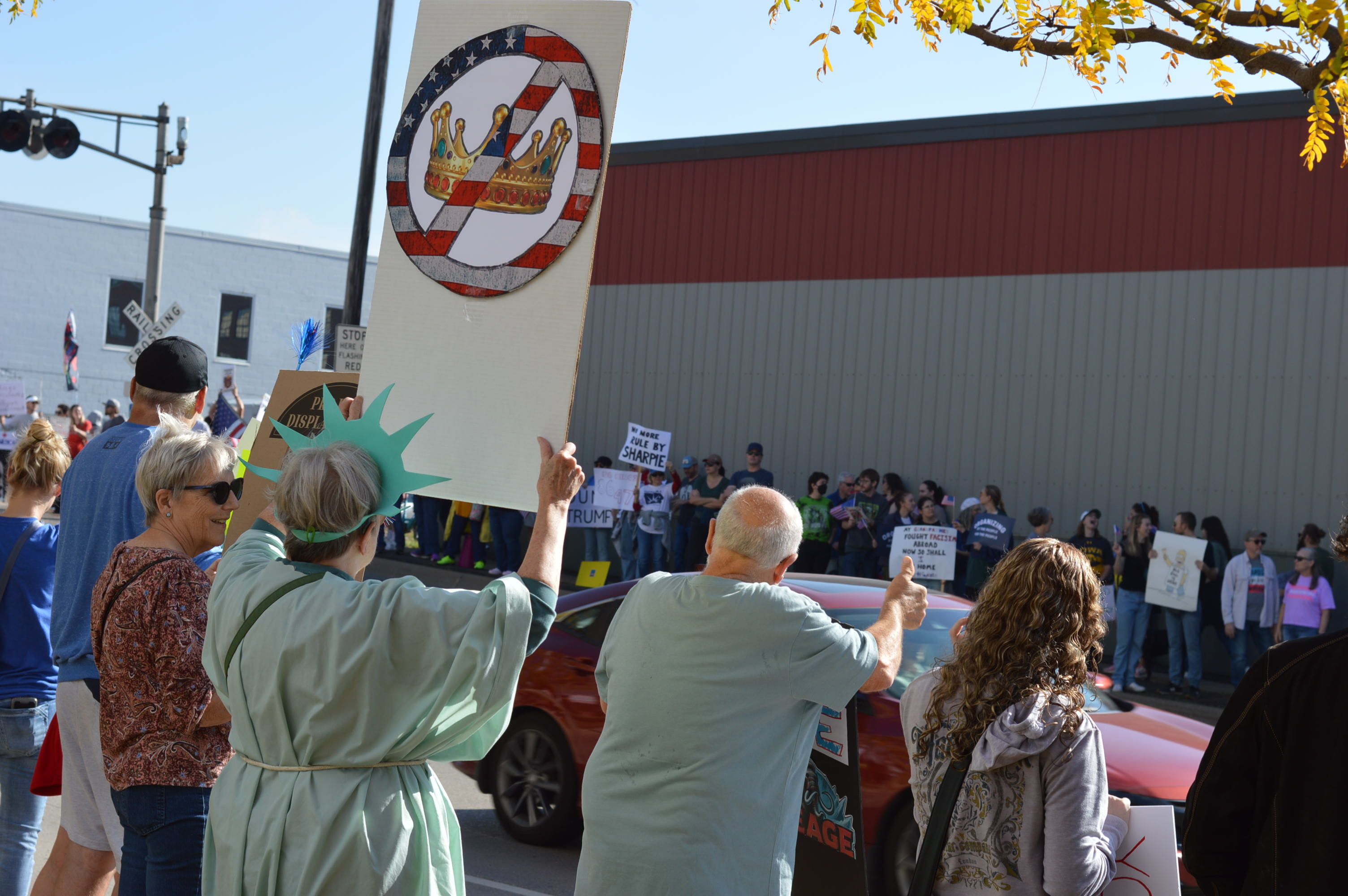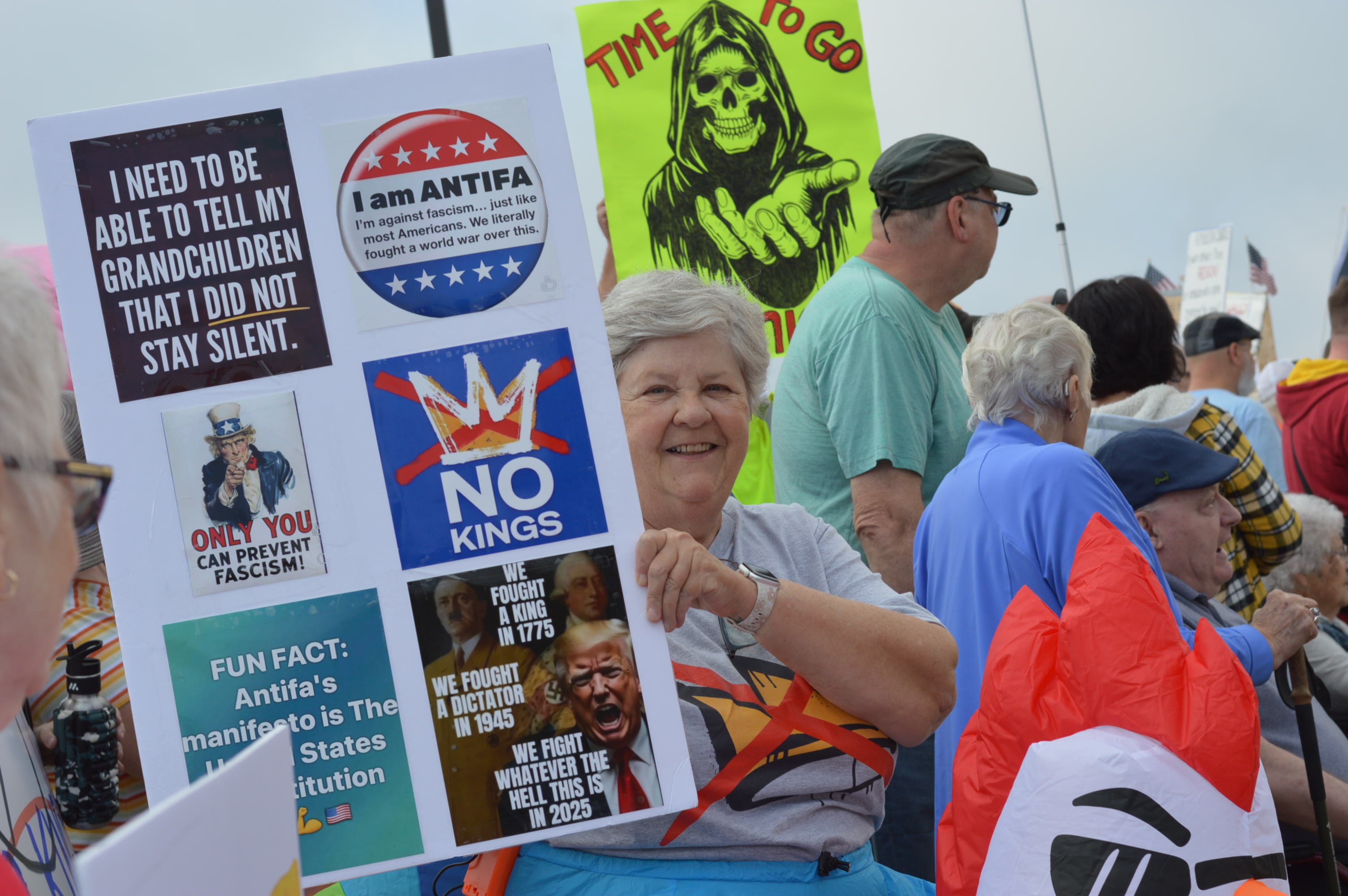 Chanting “this is what democracy looks like,” an estimated 4,000 people waved American flags and carried signs reading “No kings in America,” “Democracy not dictatorship,” “Trump is a traitor,” “I love my country” and more, while motorists honked in support.