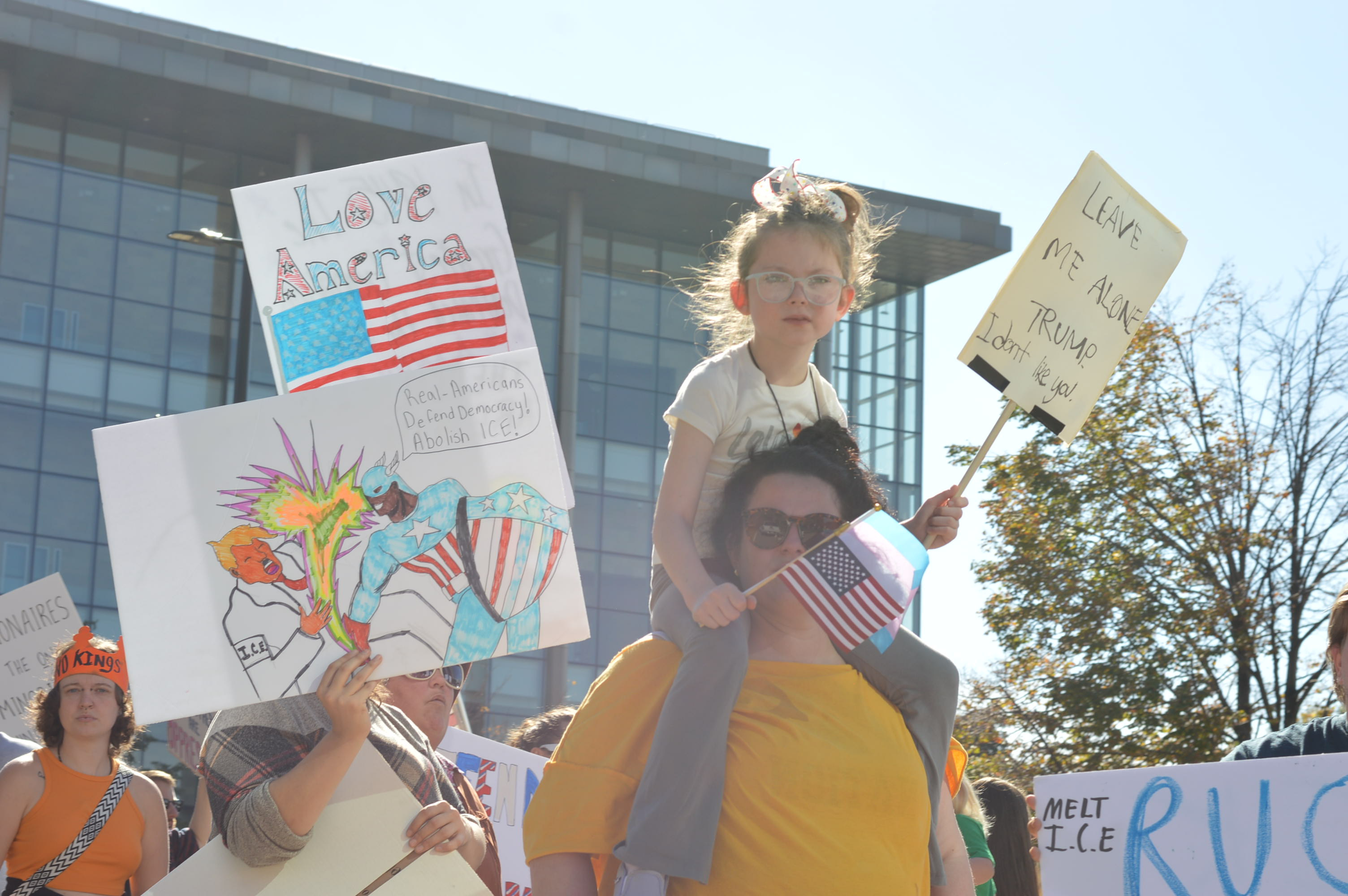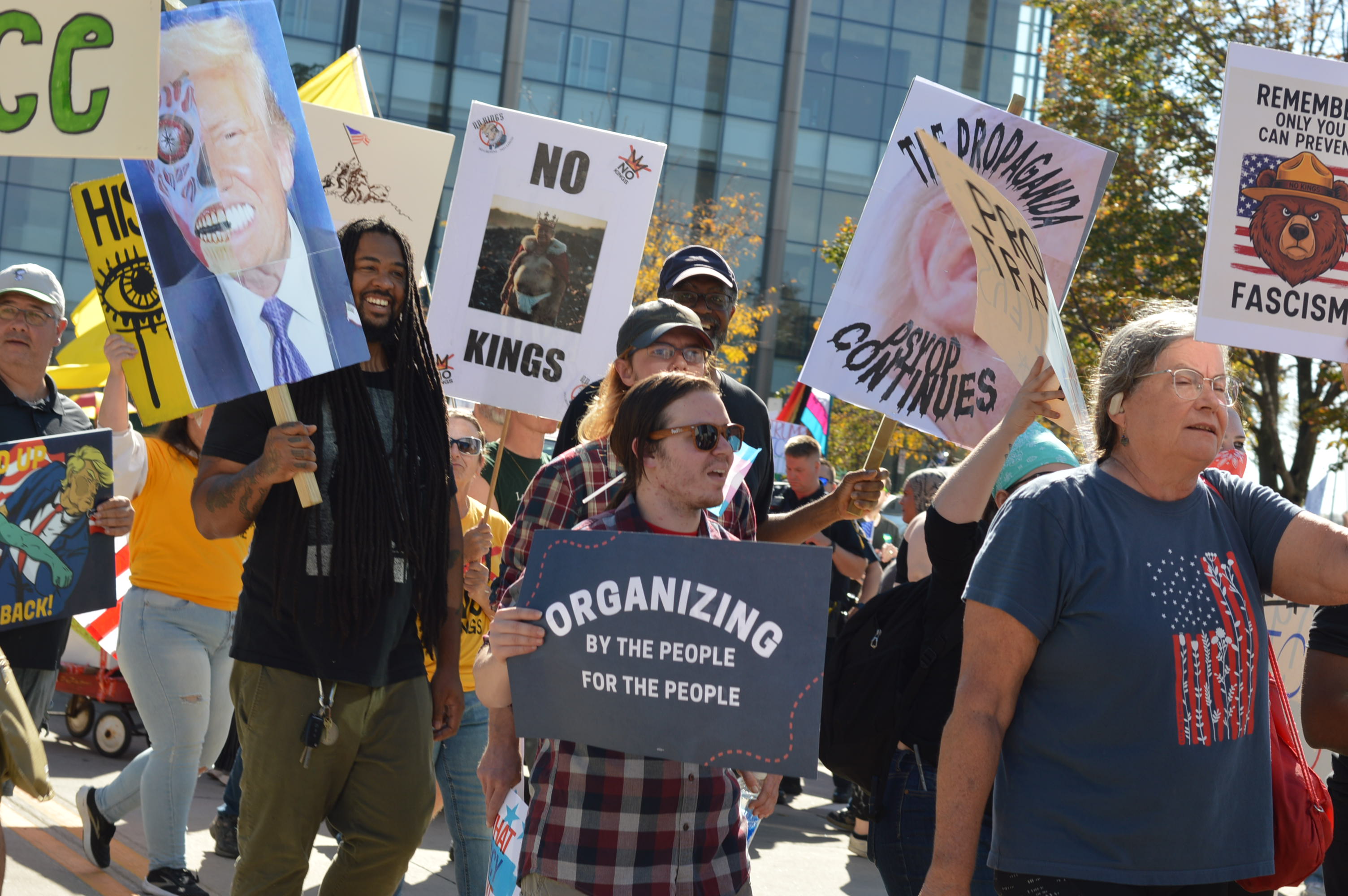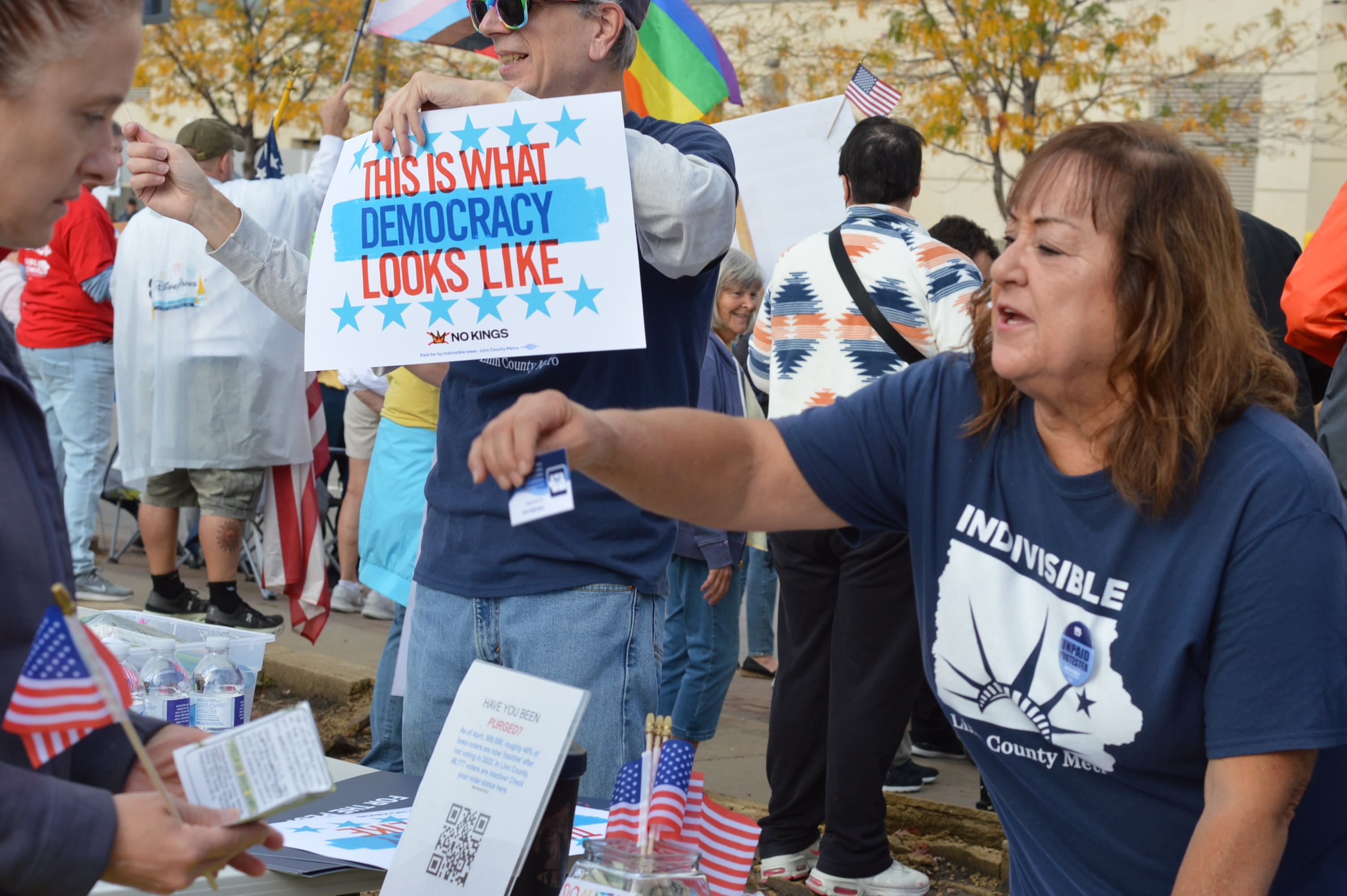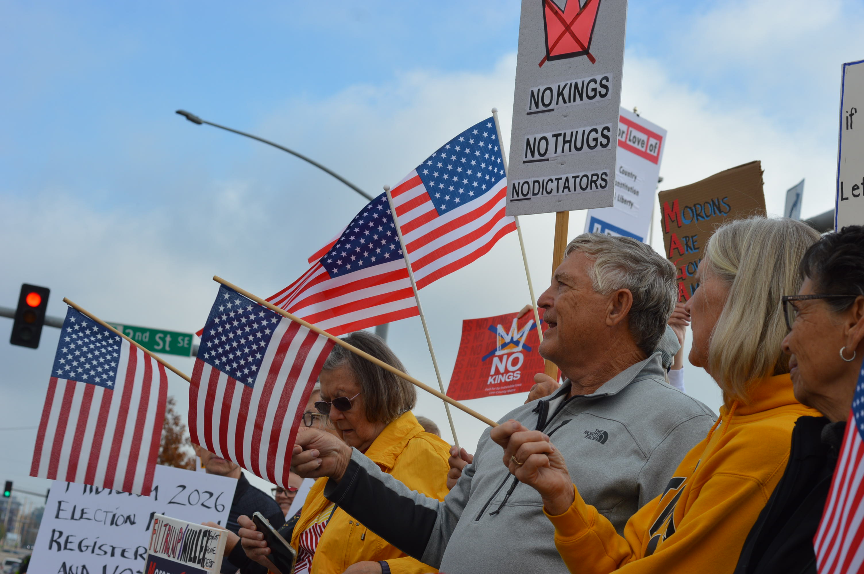 Chanting “this is what democracy looks like,” an estimated 4,000 people waved American flags and carried signs reading “No kings in America,” “Democracy not dictatorship,” “Trump is a traitor,” “I love my country” and more, while motorists honked in support.