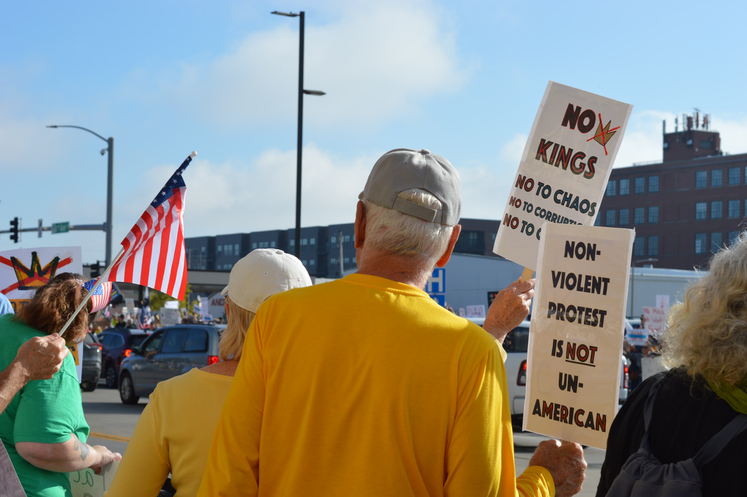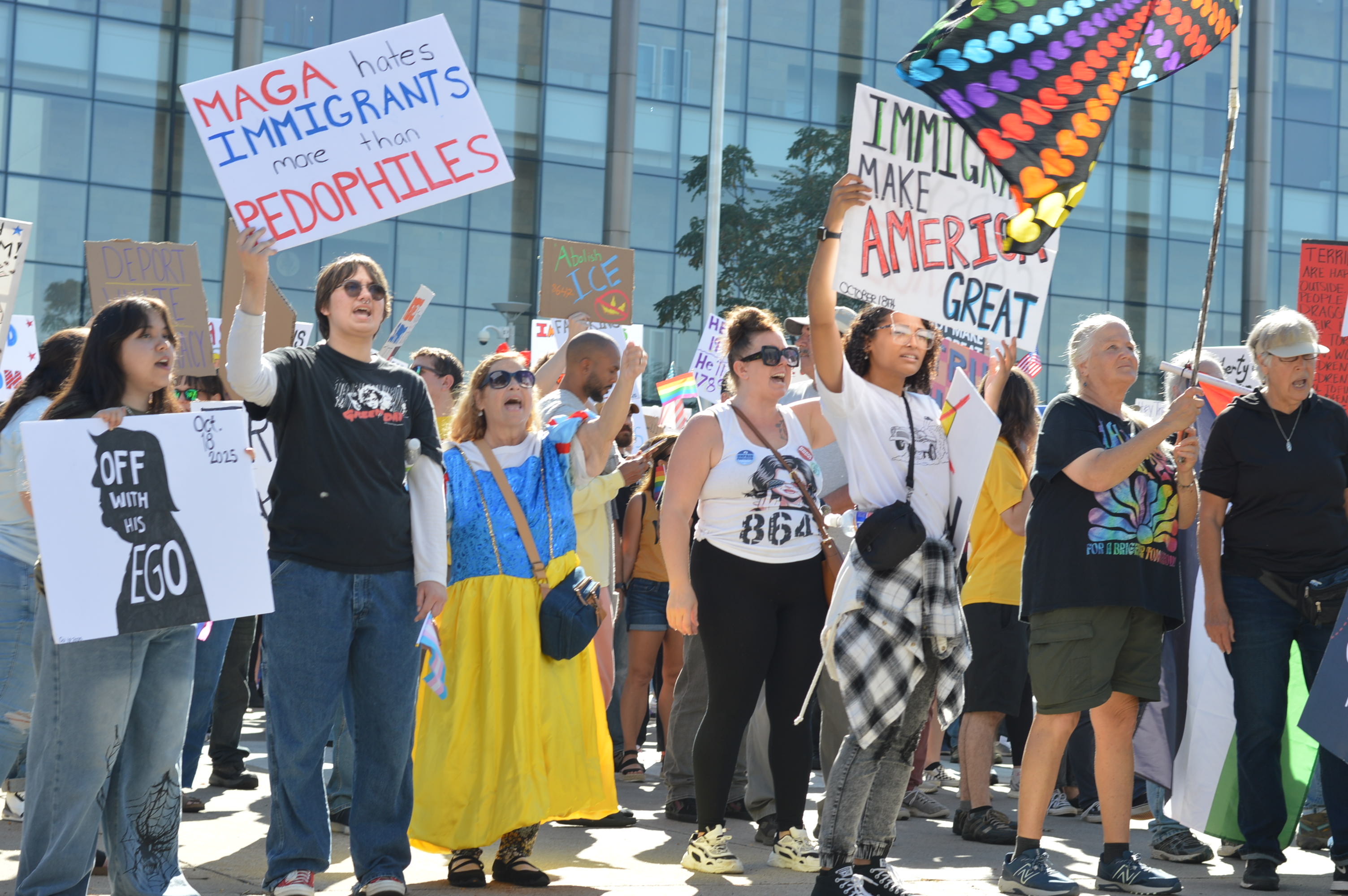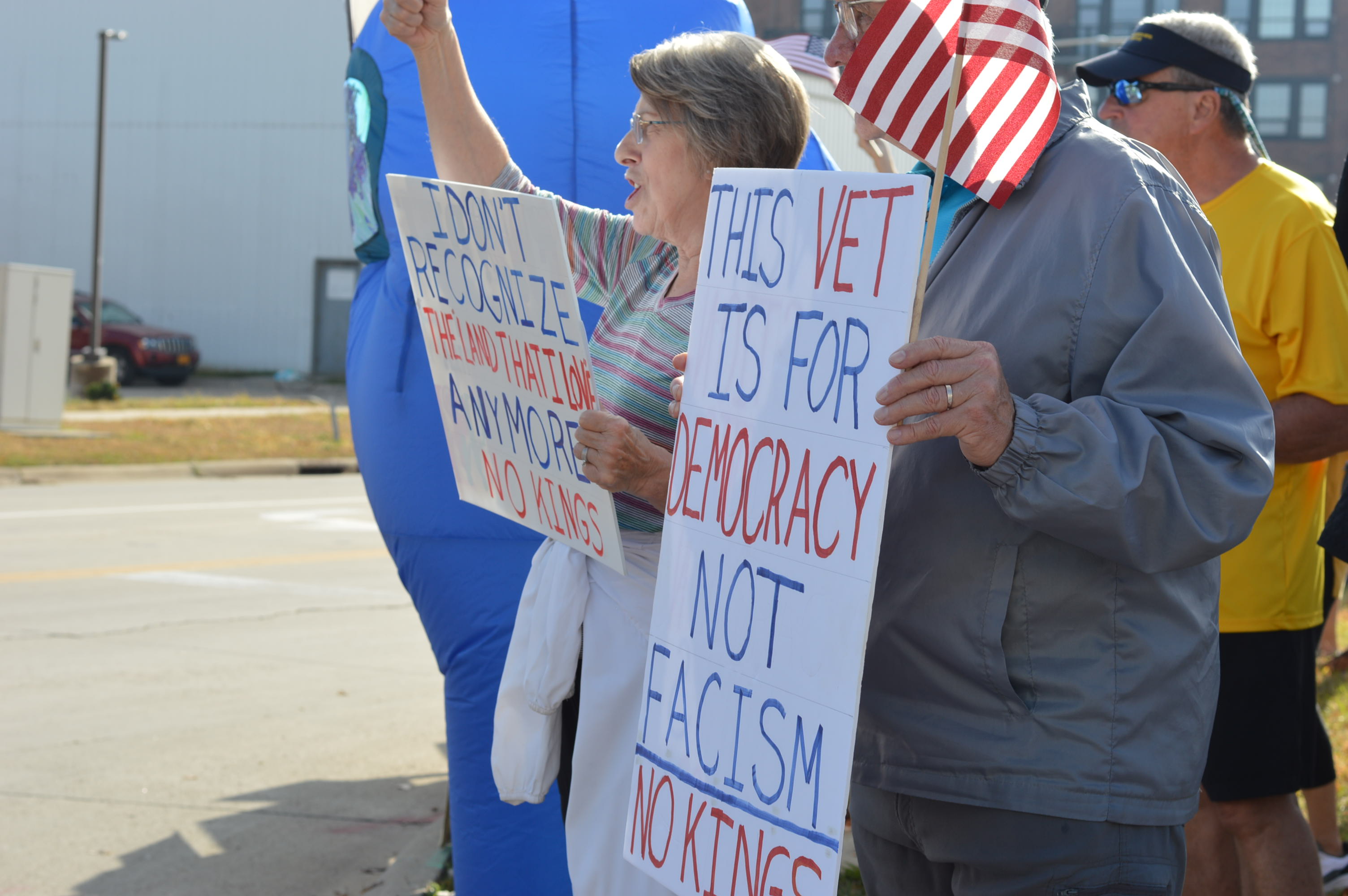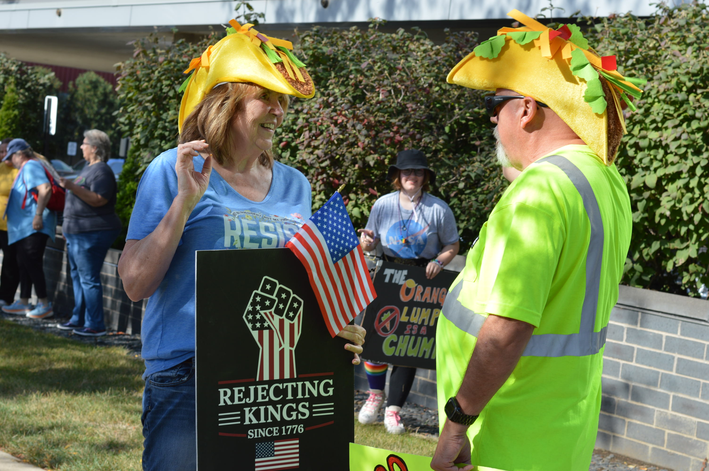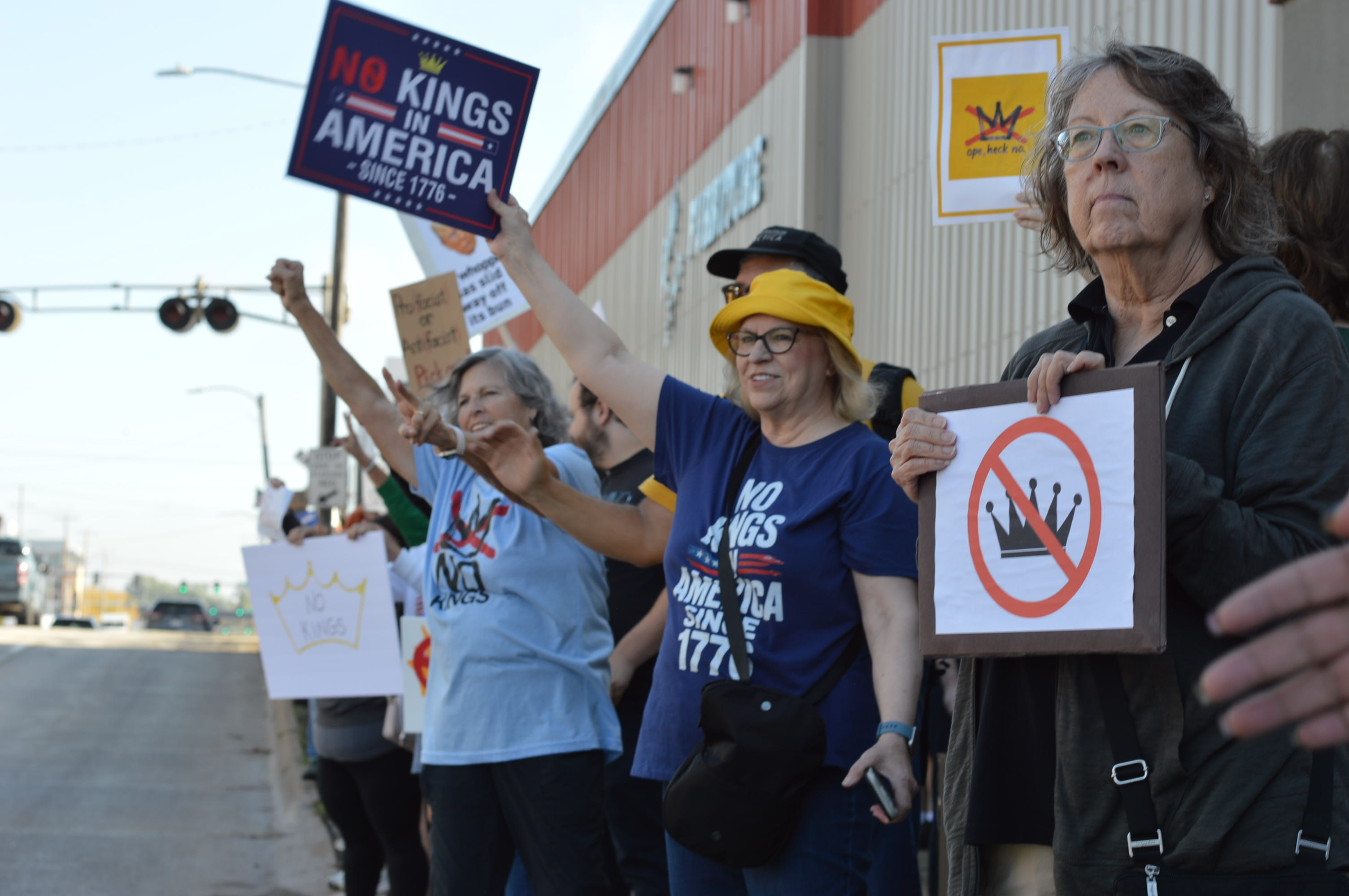 Chanting “this is what democracy looks like,” an estimated 4,000 people waved American flags and carried signs reading “No kings in America,” “Democracy not dictatorship,” “Trump is a traitor,” “I love my country” and more, while motorists honked in support.