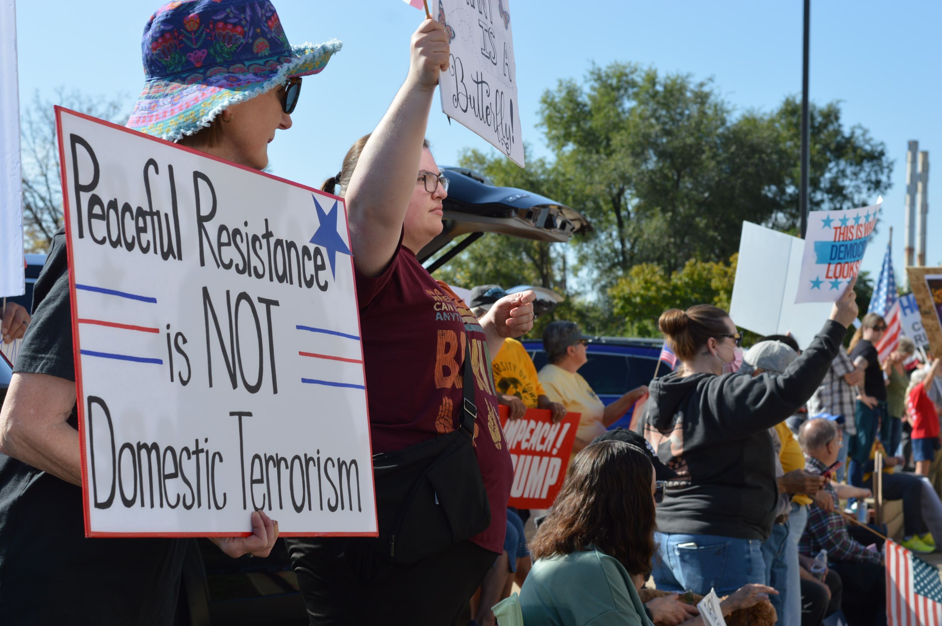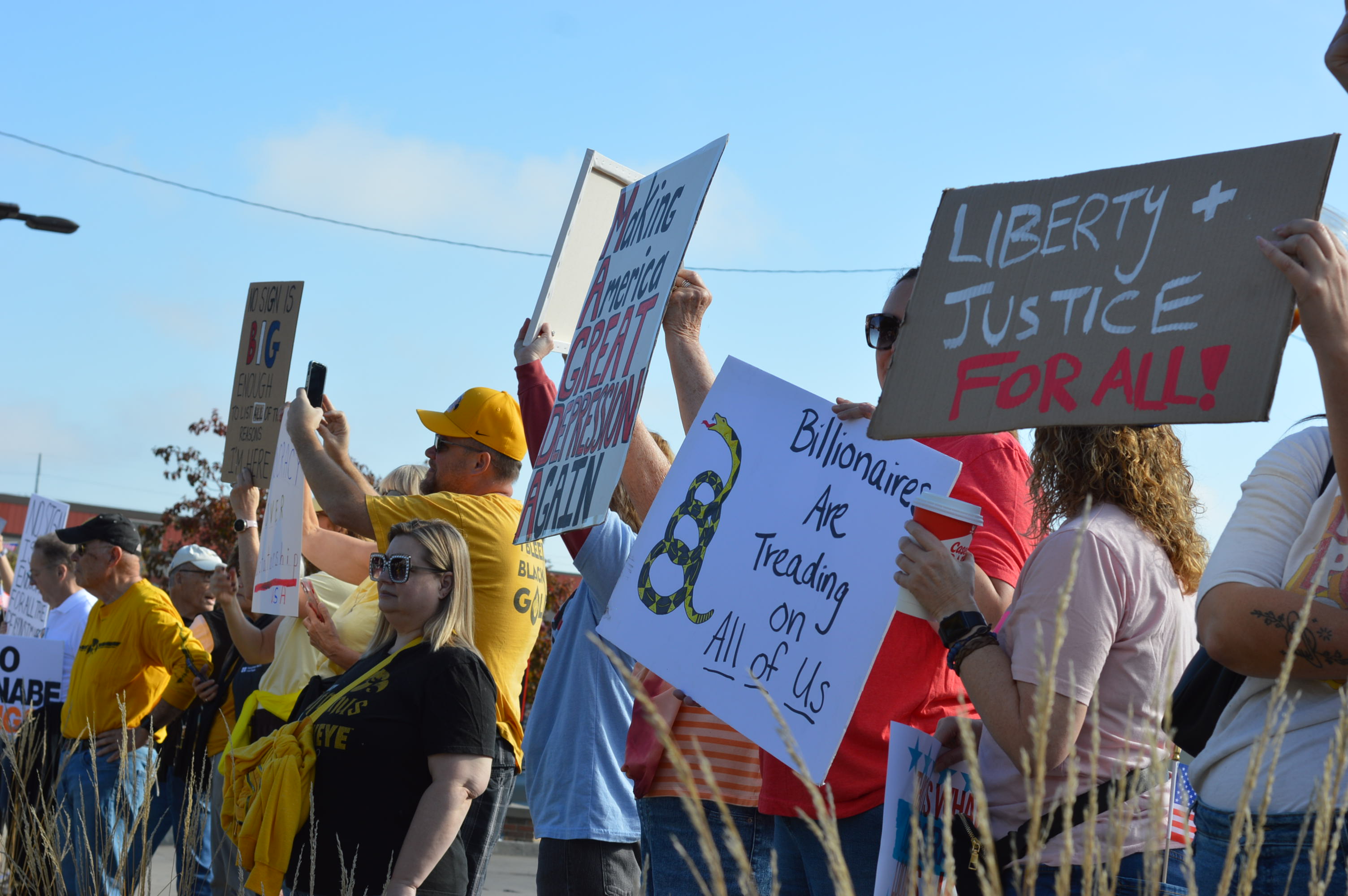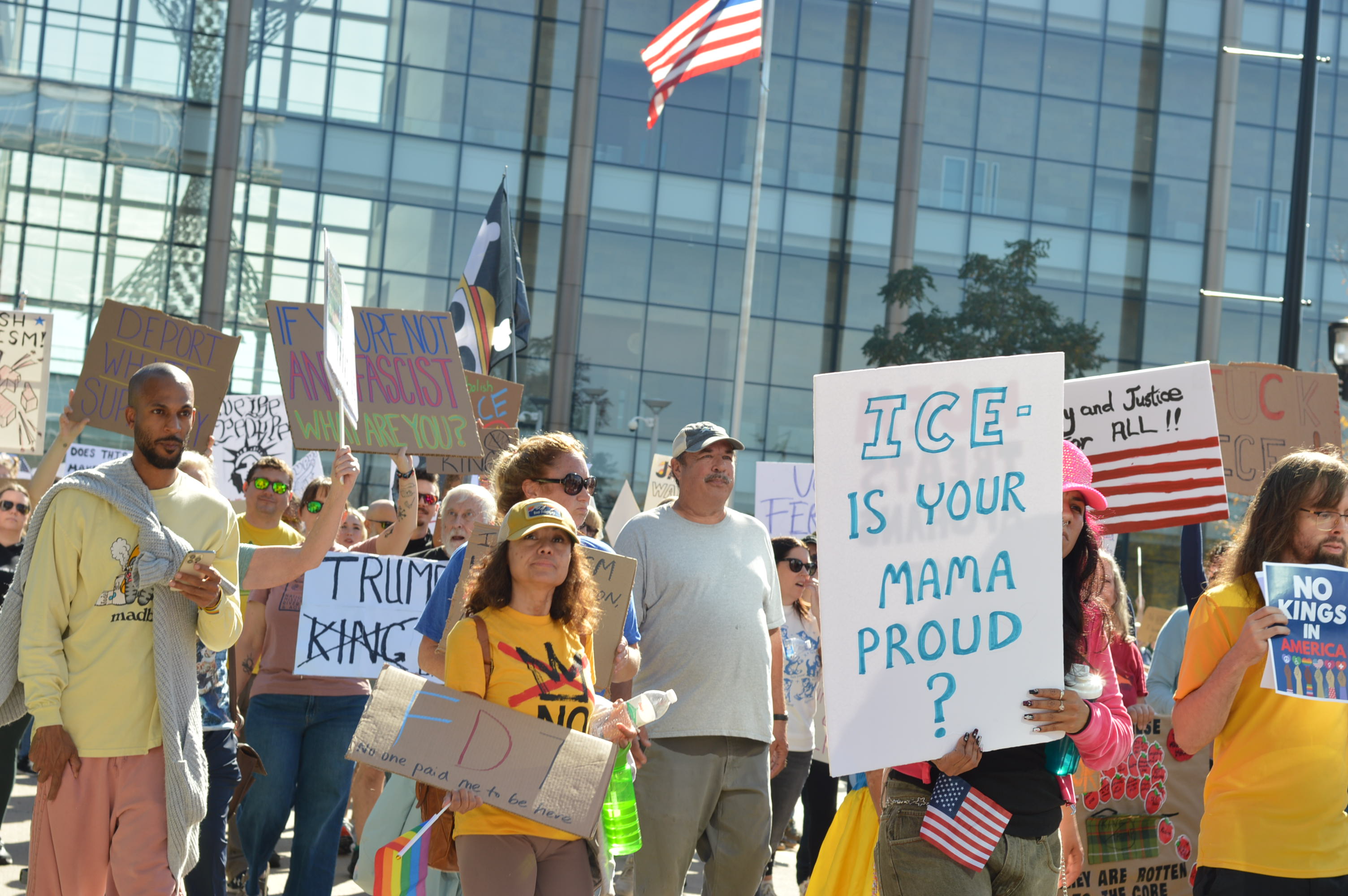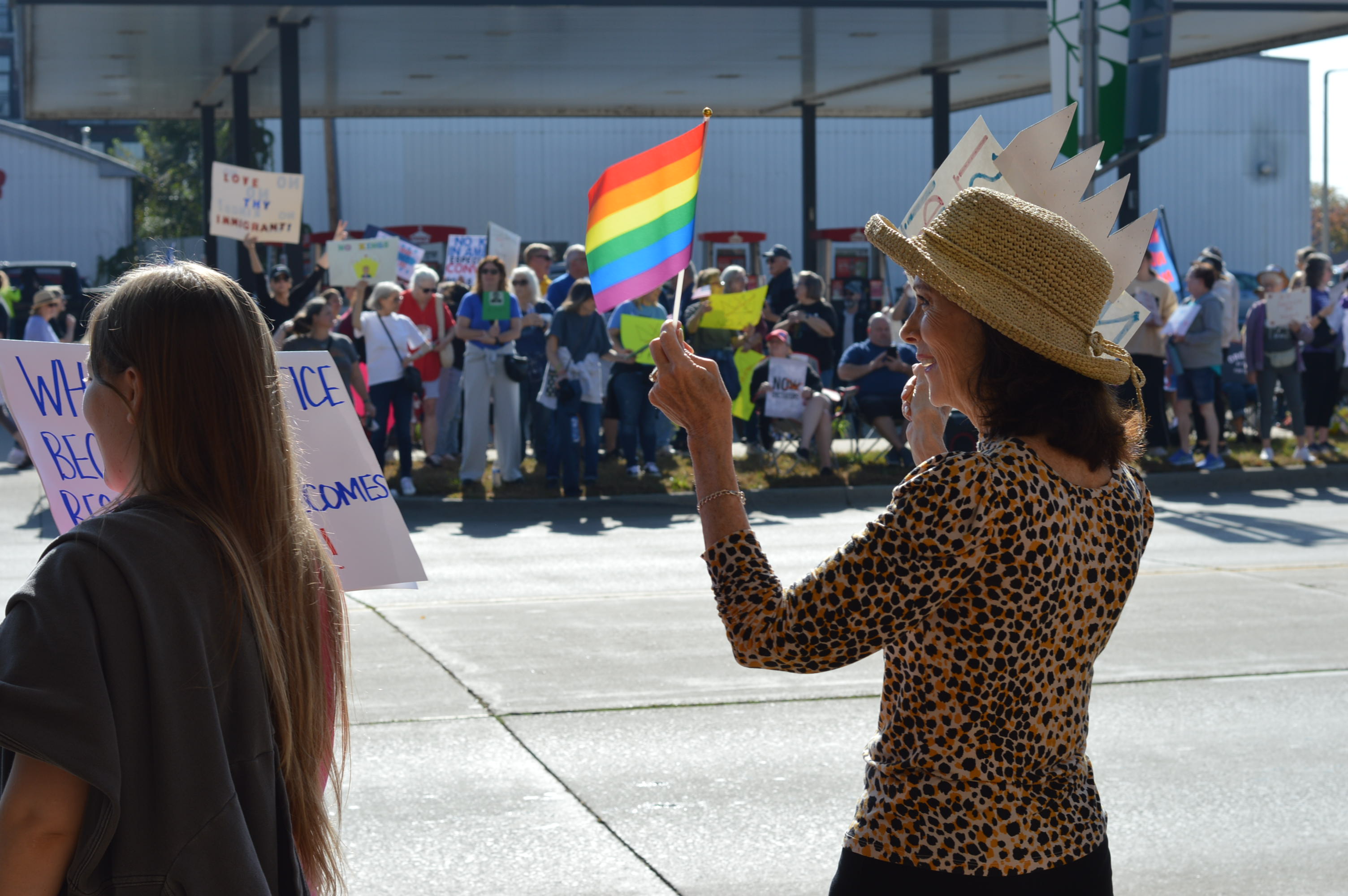 Chanting “this is what democracy looks like,” an estimated 4,000 people waved American flags and carried signs reading “No kings in America,” “Democracy not dictatorship,” “Trump is a traitor,” “I love my country” and more, while motorists honked in support.