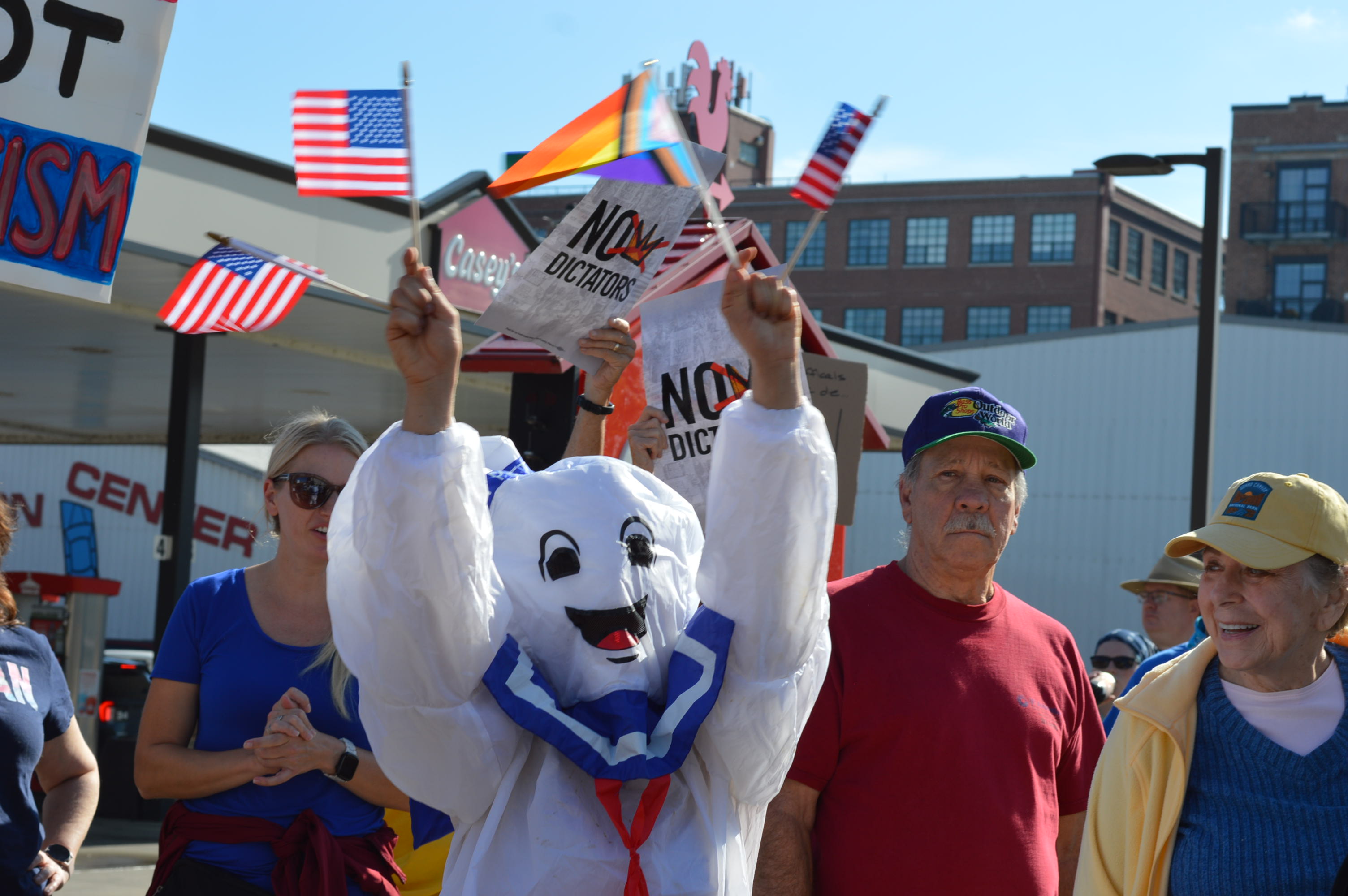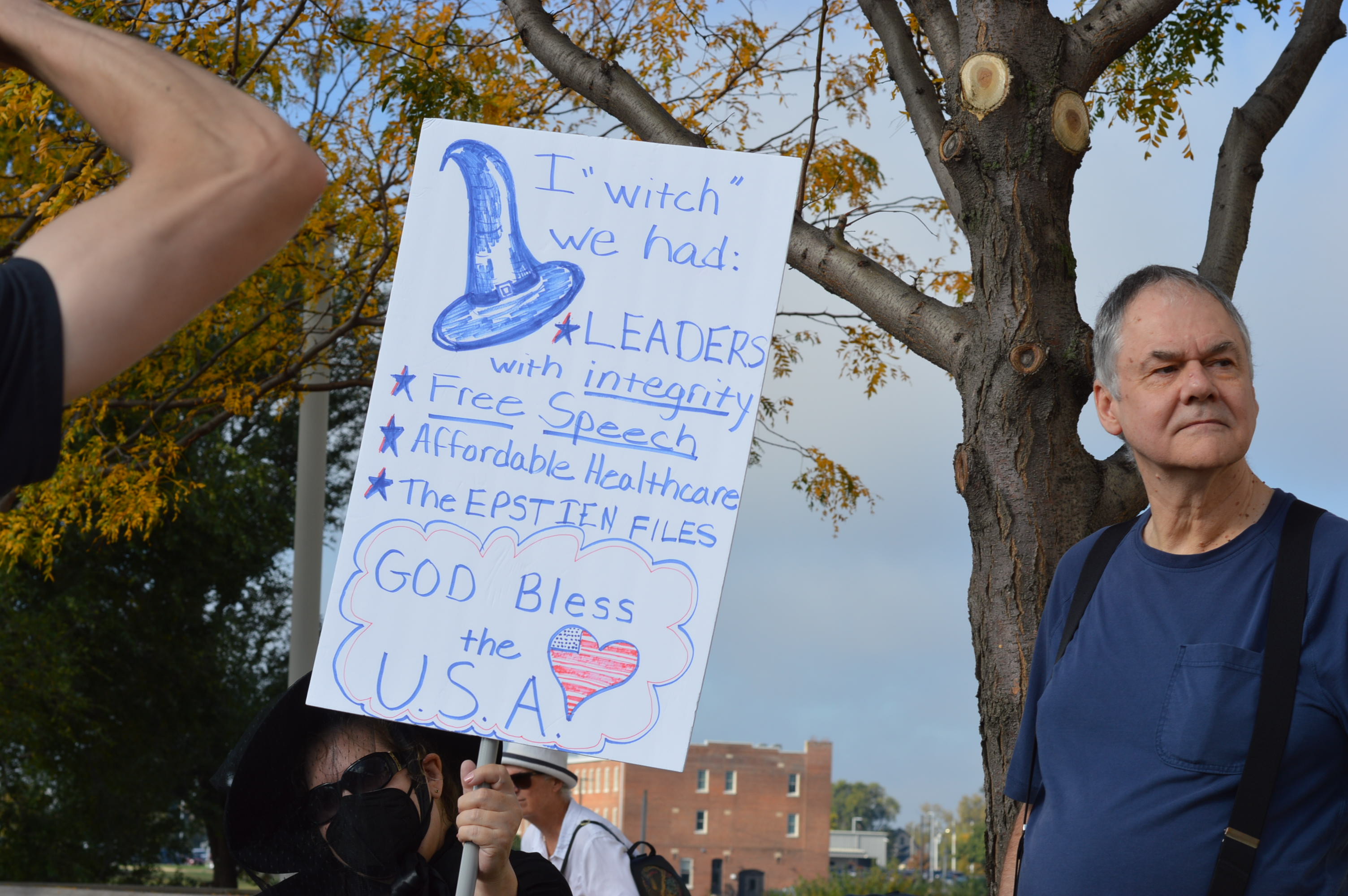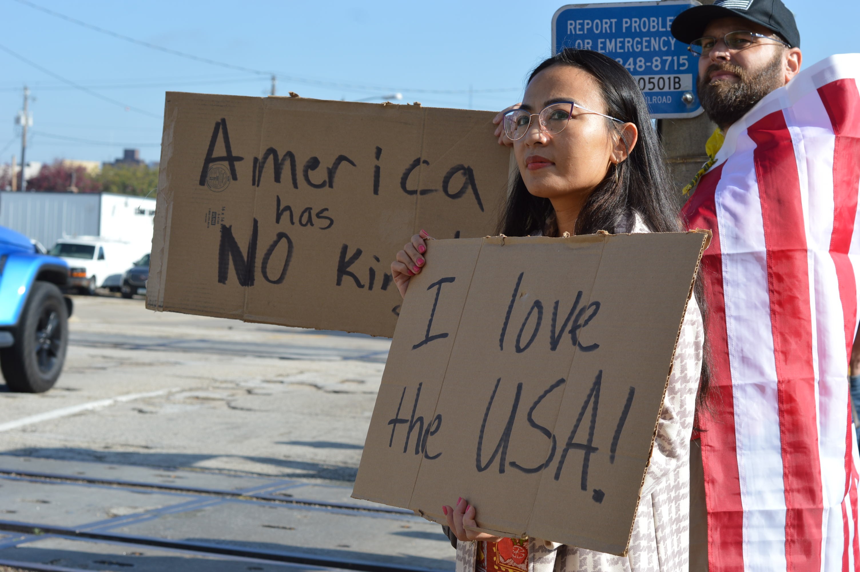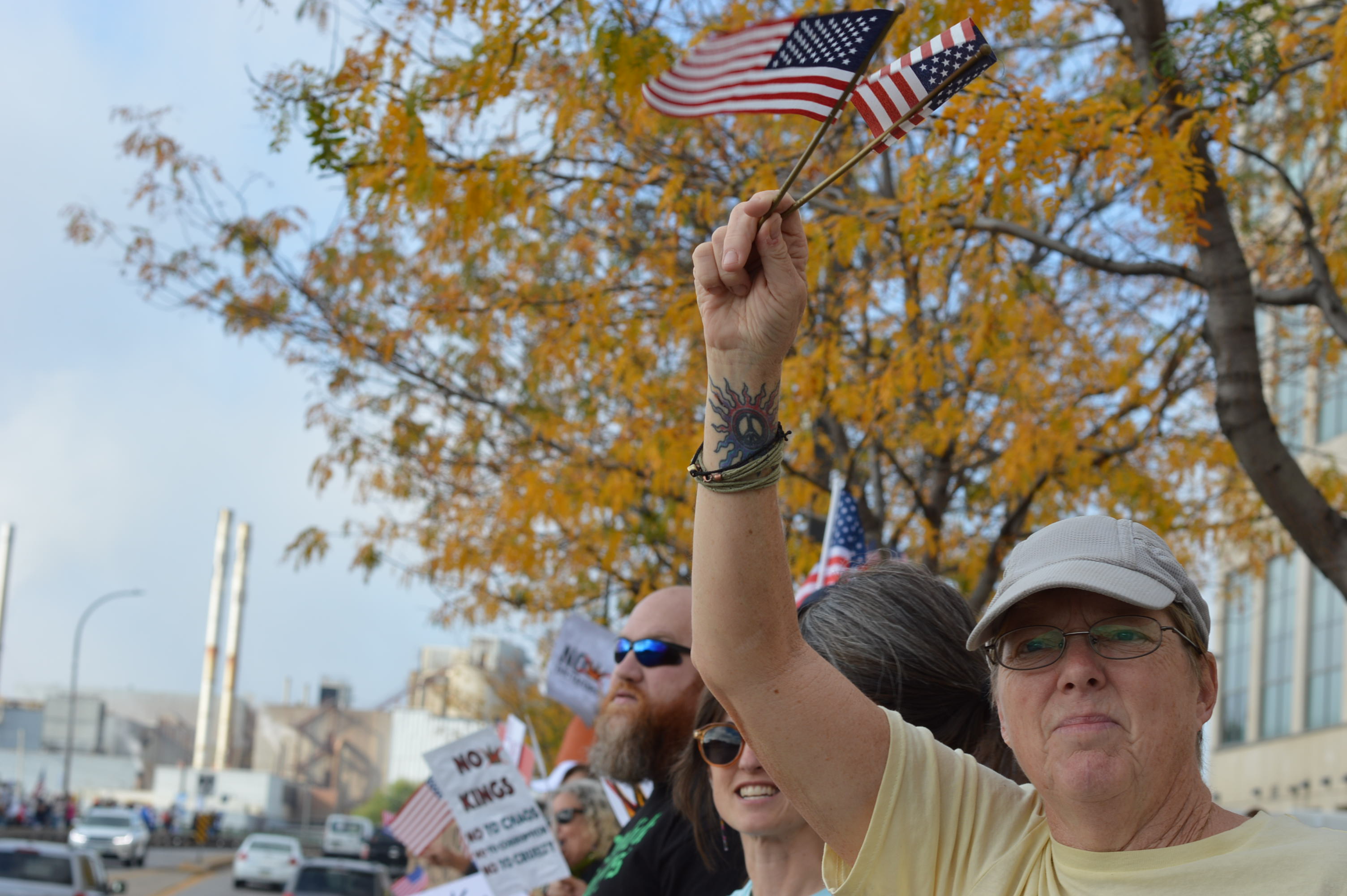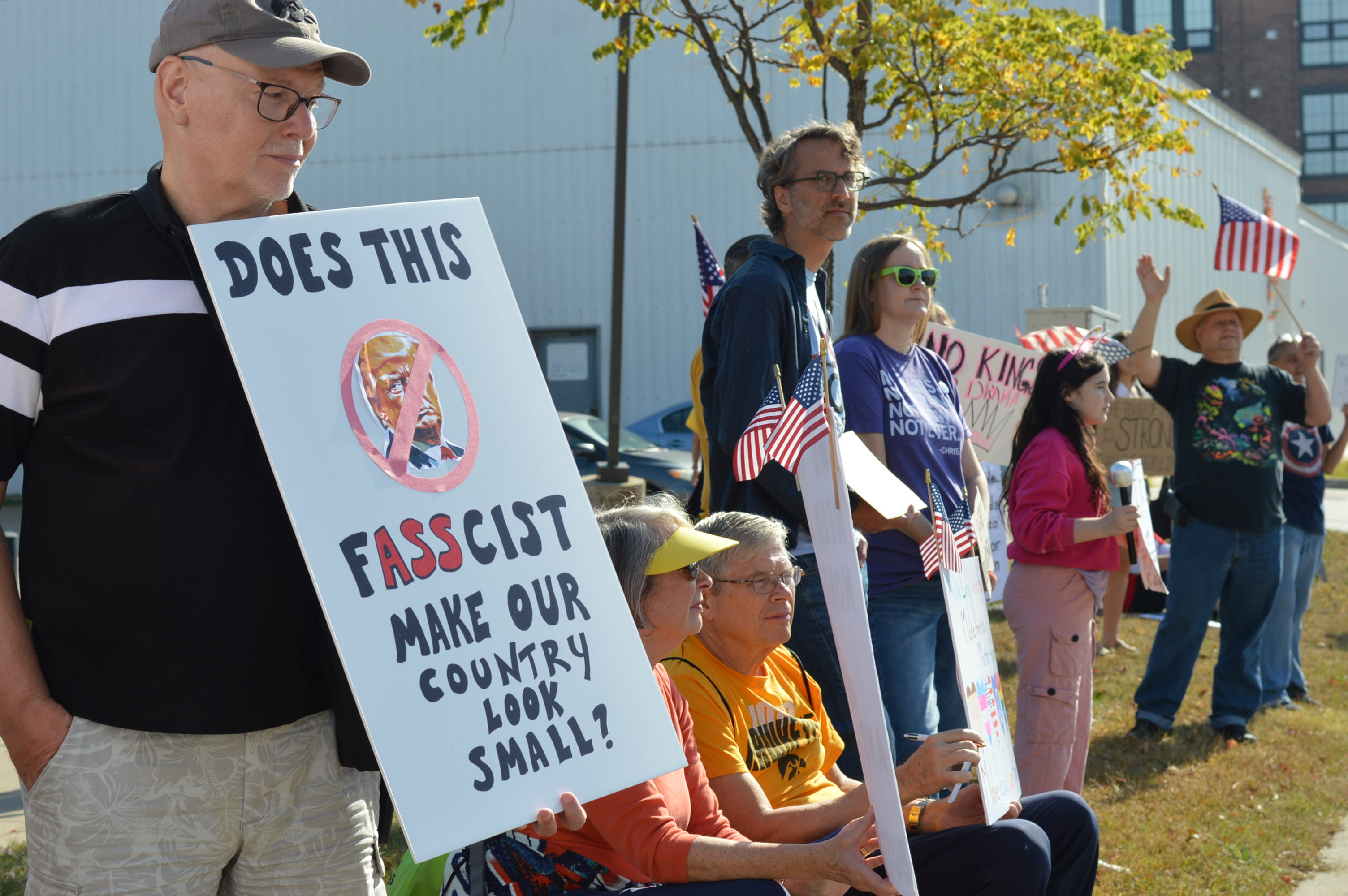 Chanting “this is what democracy looks like,” an estimated 4,000 people waved American flags and carried signs reading “No kings in America,” “Democracy not dictatorship,” “Trump is a traitor,” “I love my country” and more, while motorists honked in support.