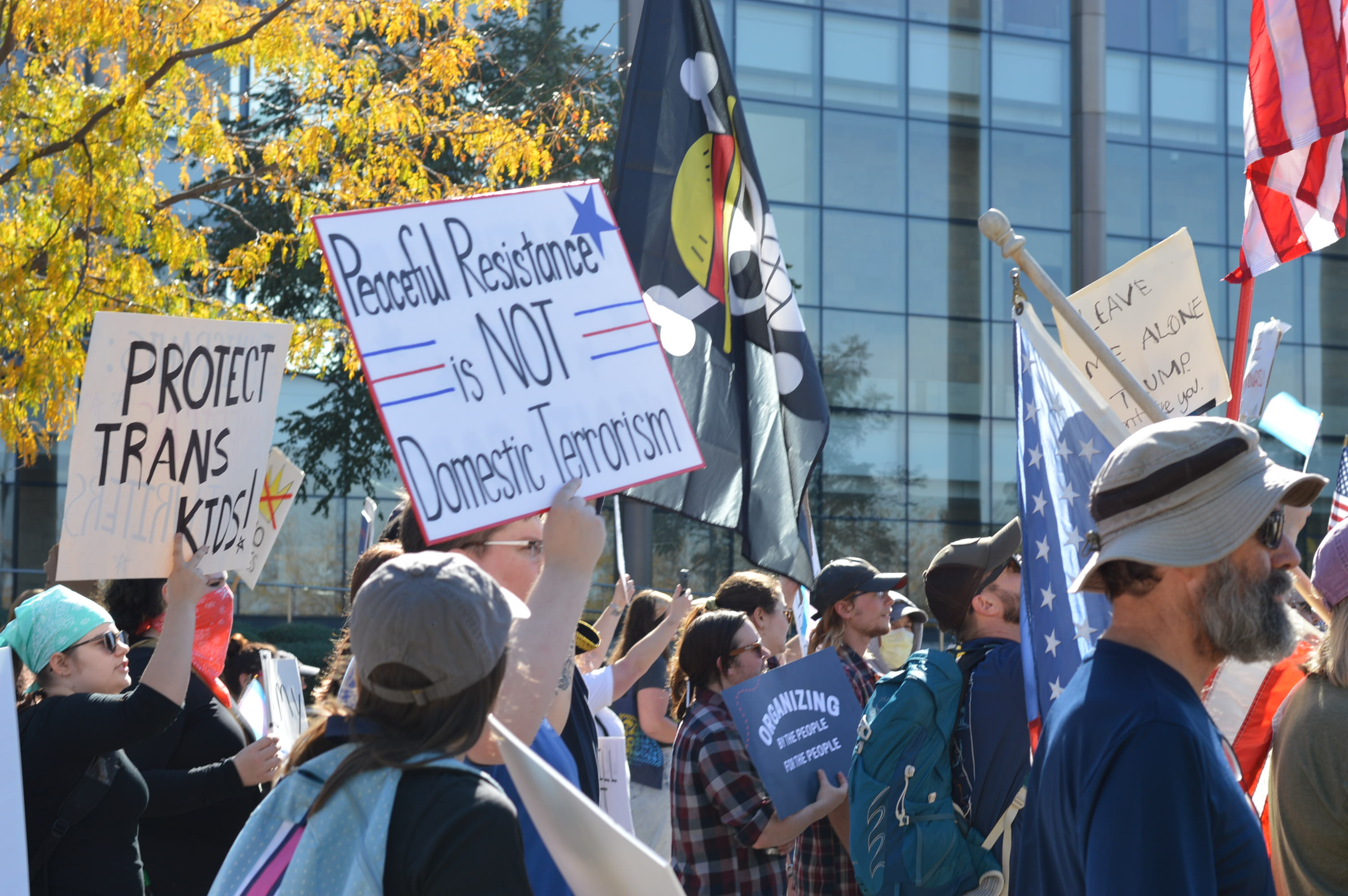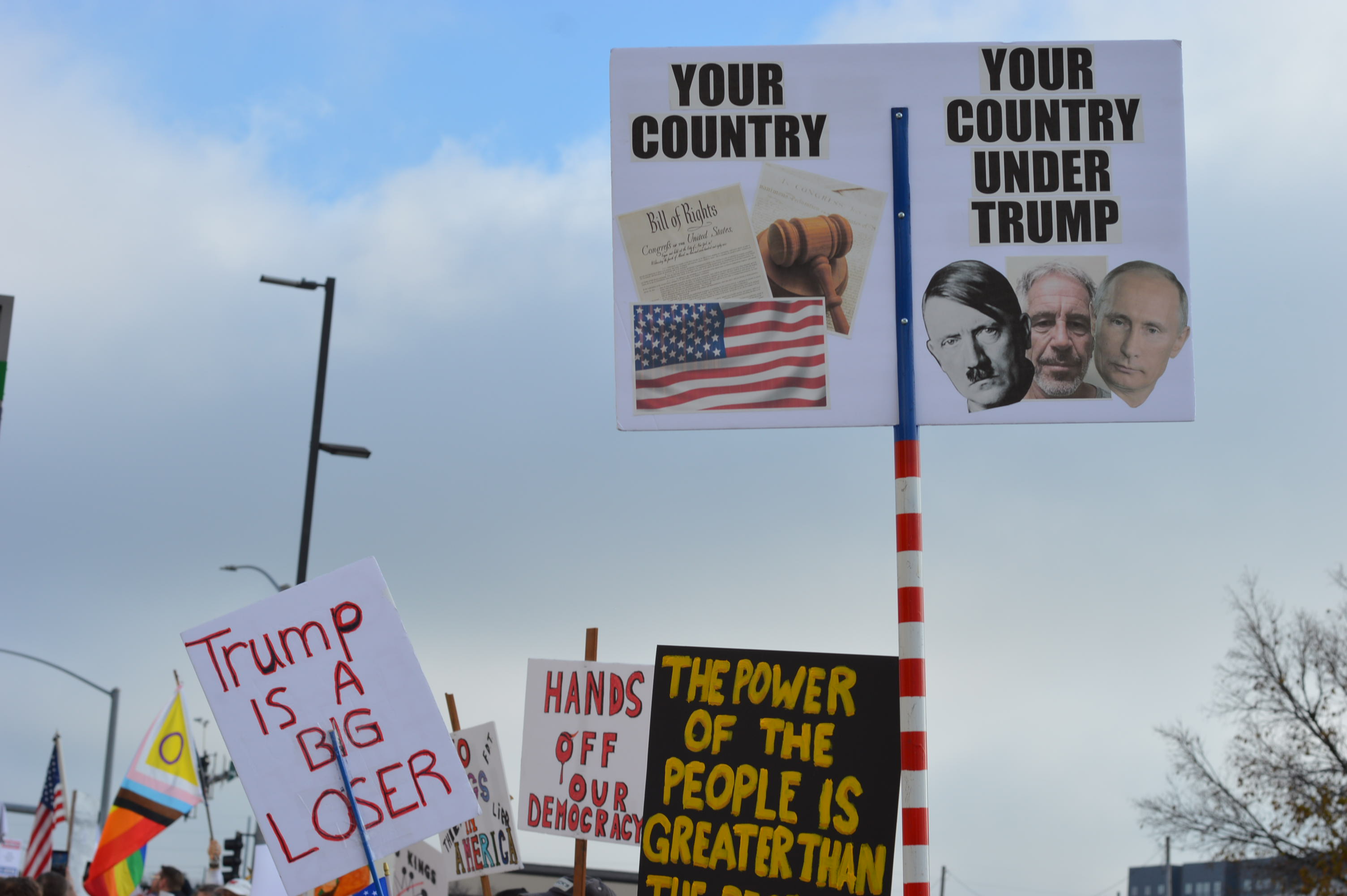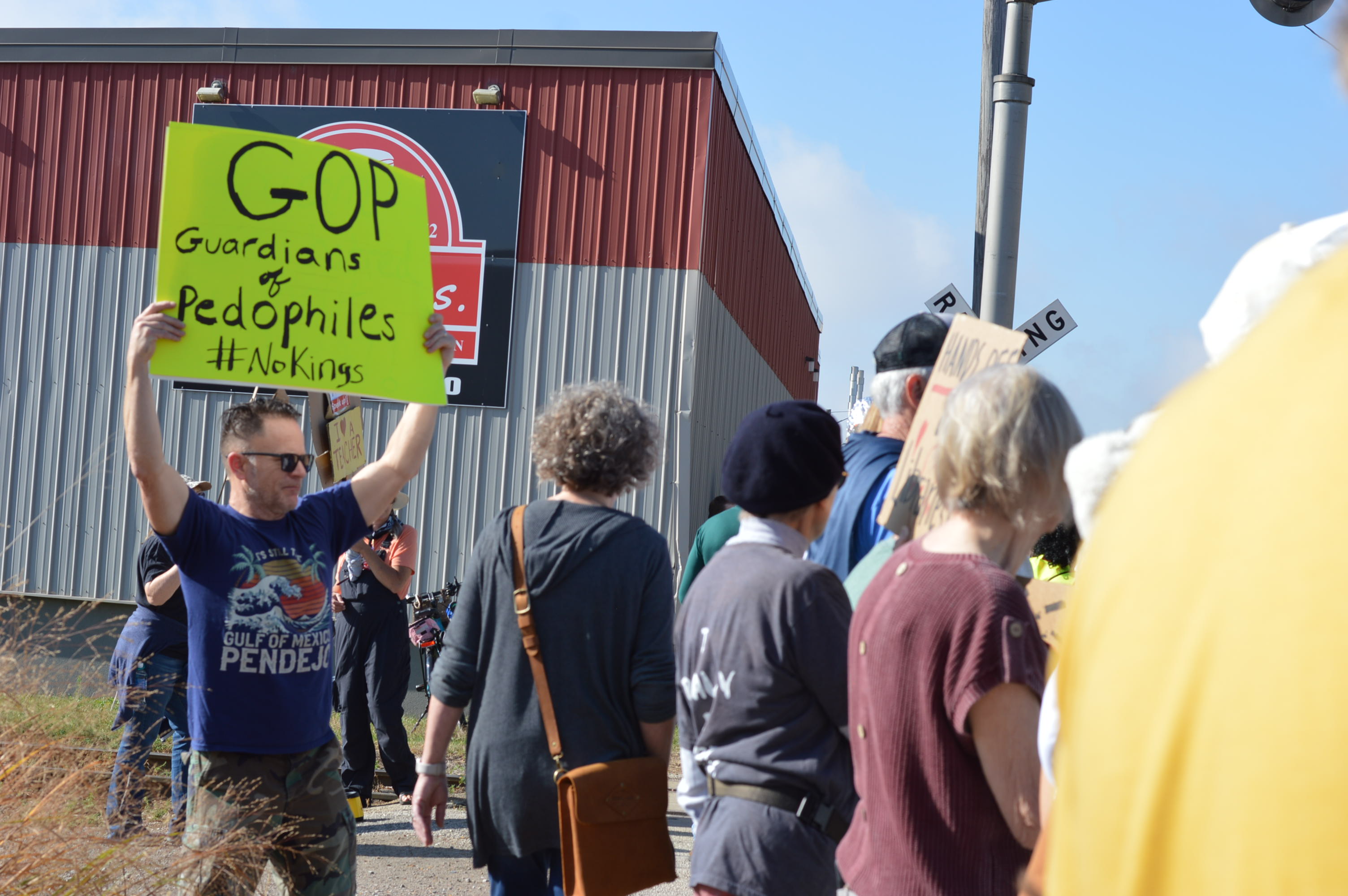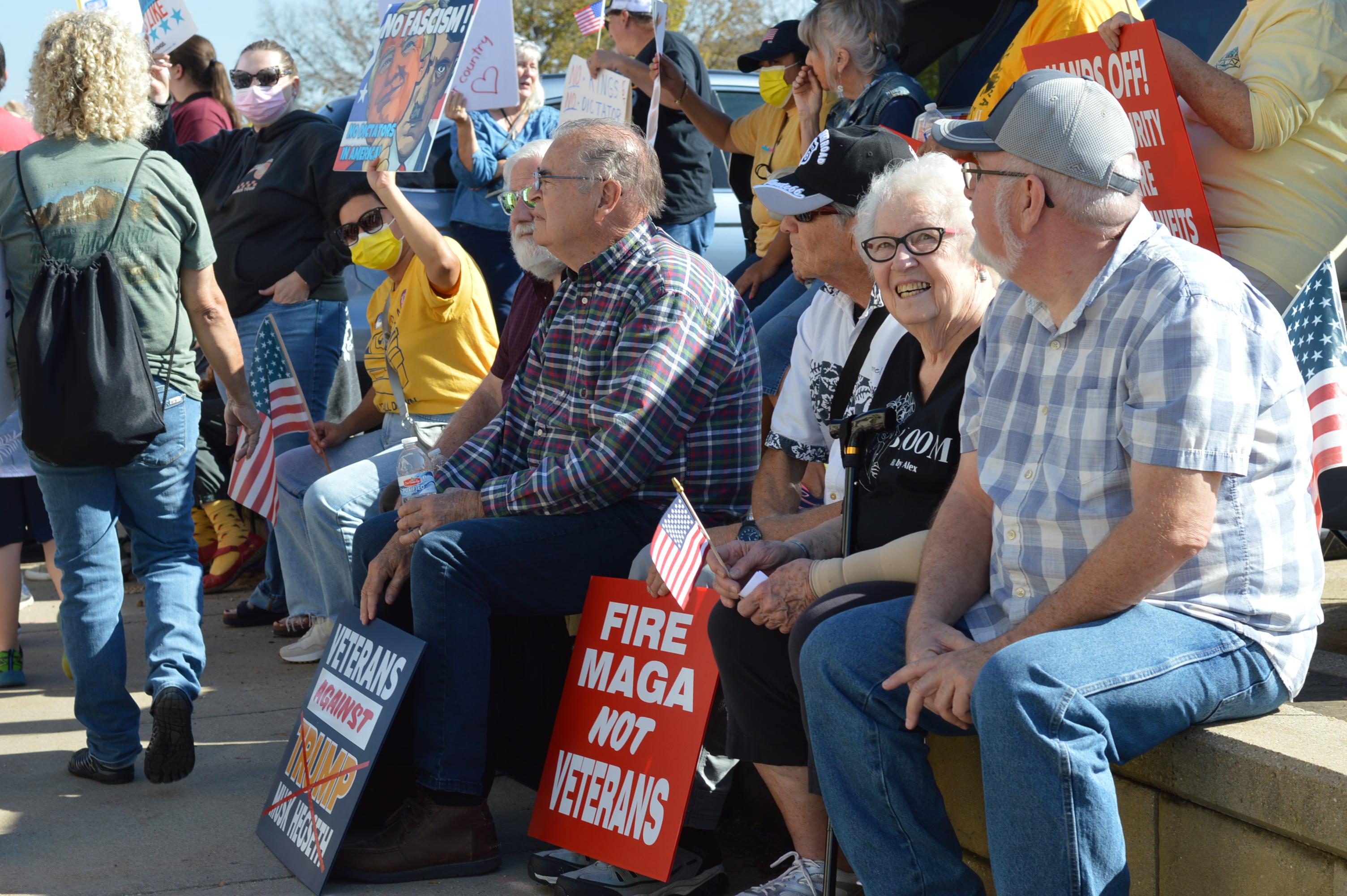 Chanting “this is what democracy looks like,” an estimated 4,000 people waved American flags and carried signs reading “No kings in America,” “Democracy not dictatorship,” “Trump is a traitor,” “I love my country” and more, while motorists honked in support.