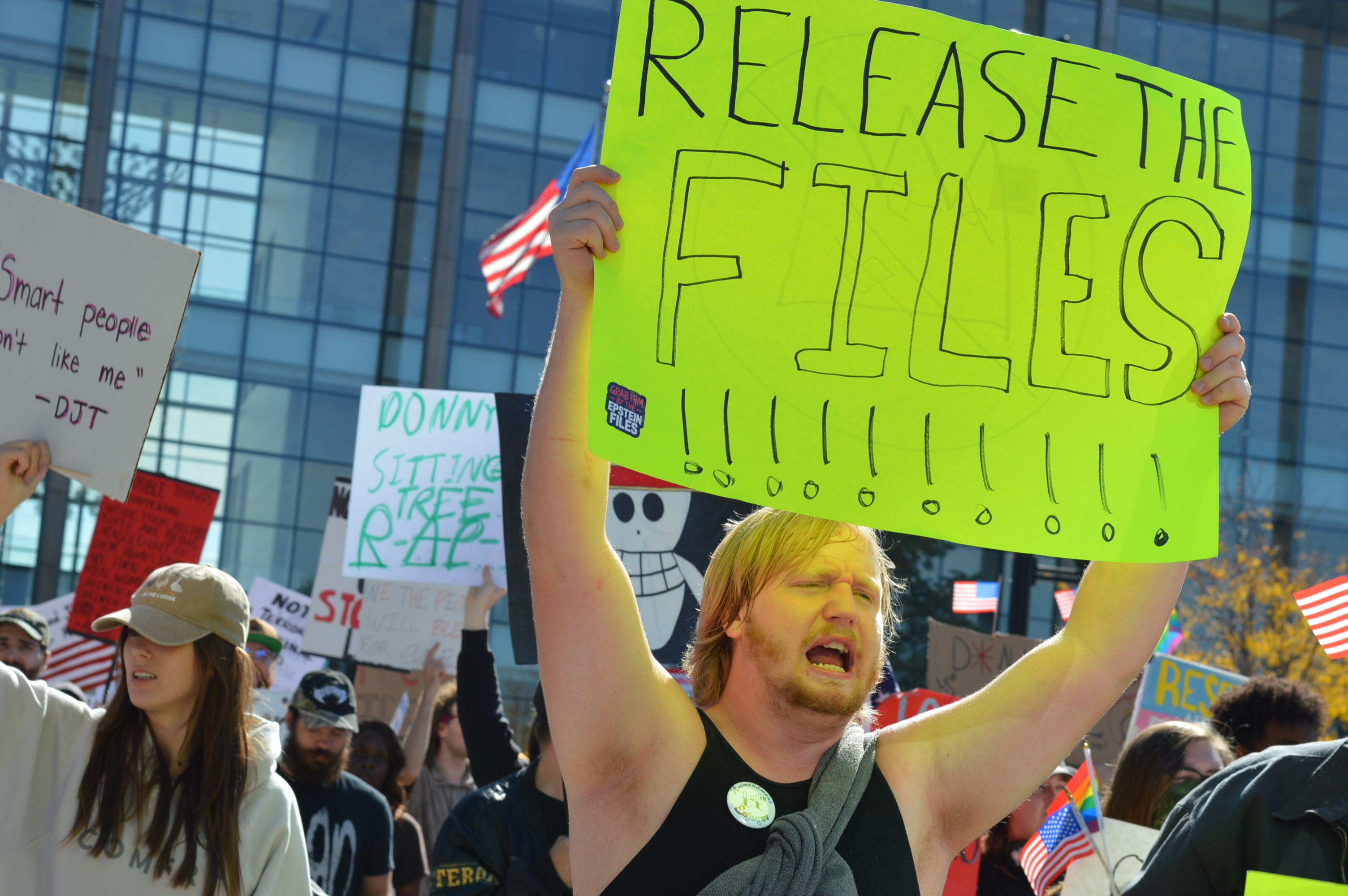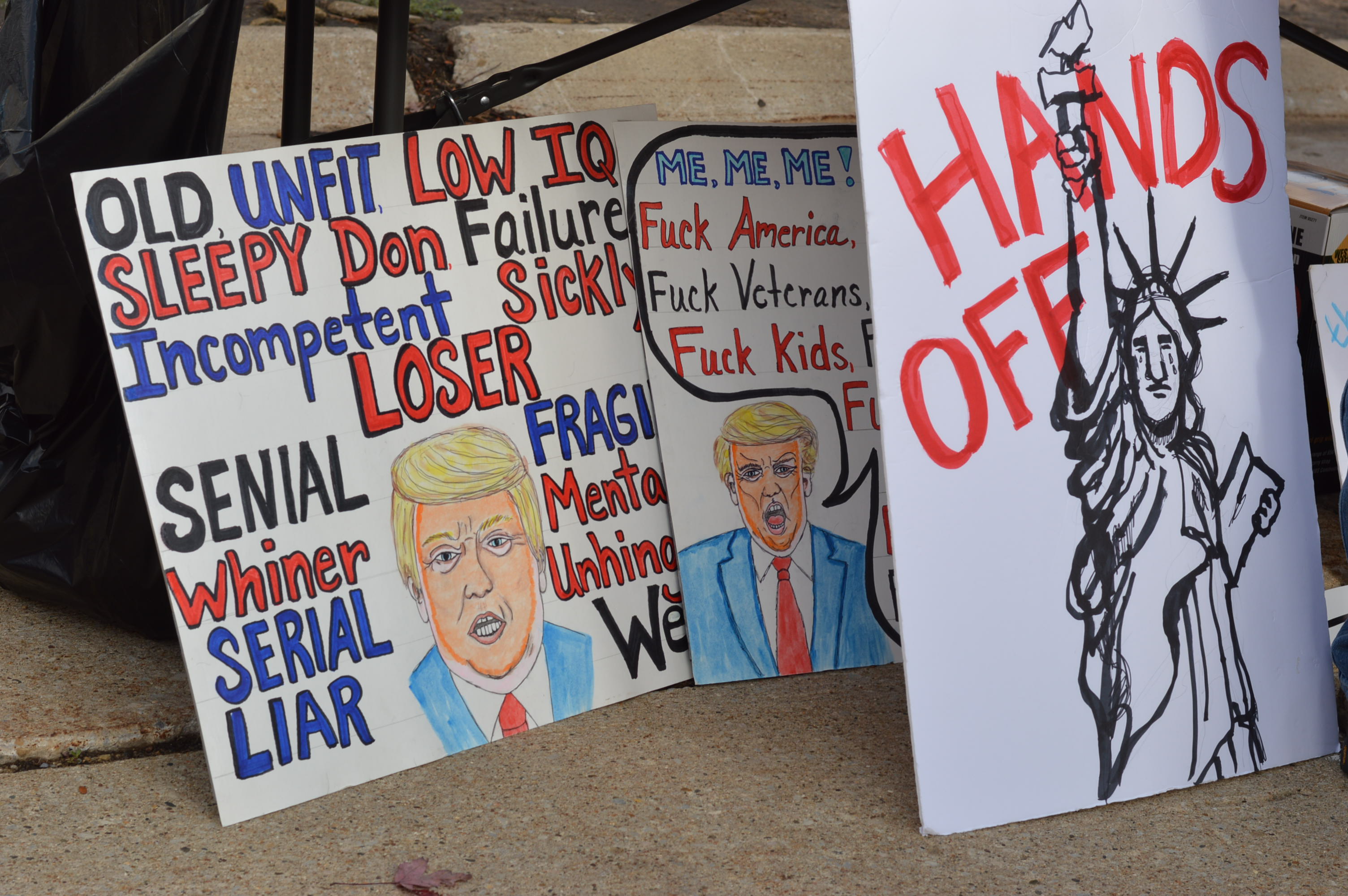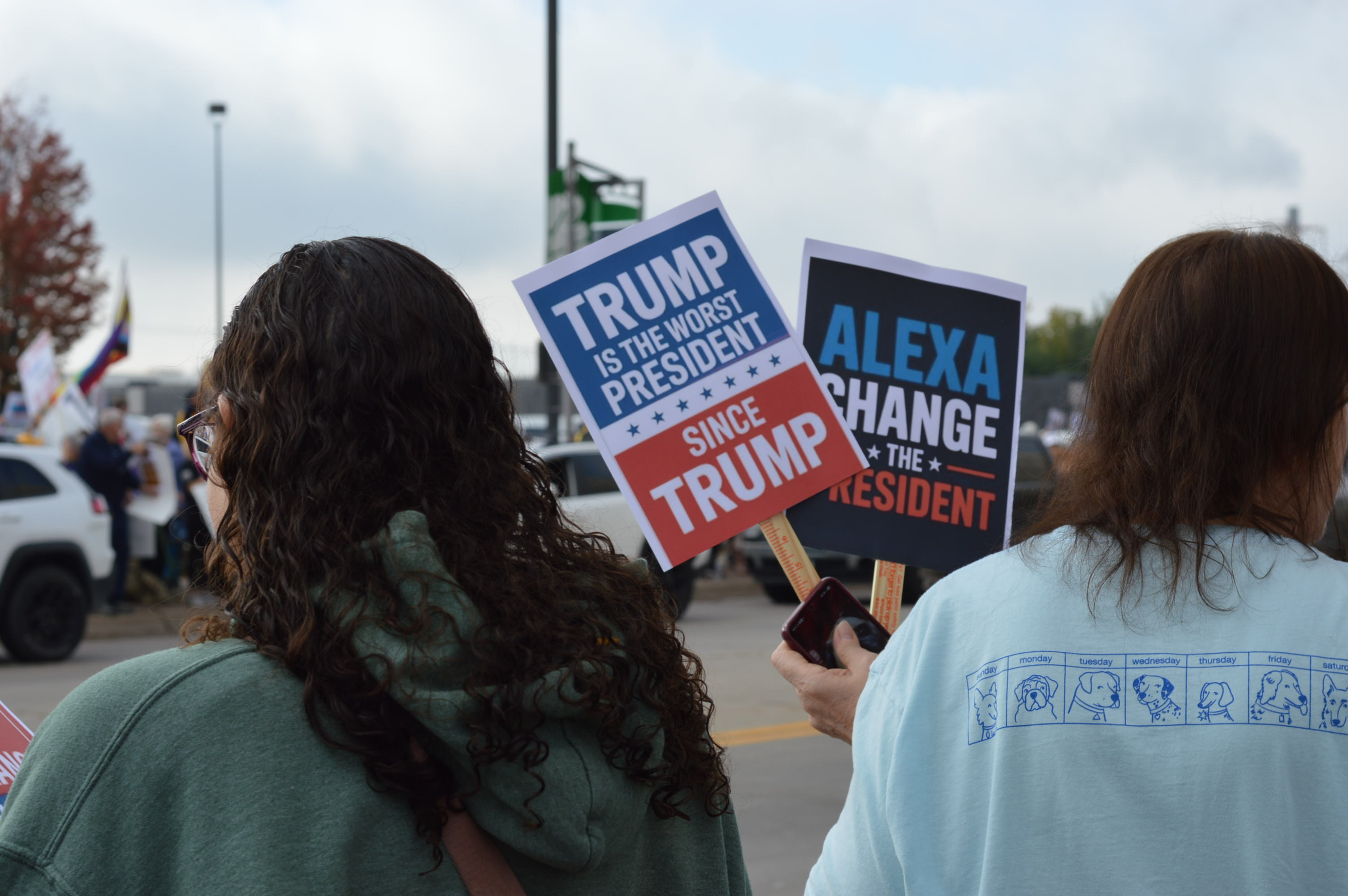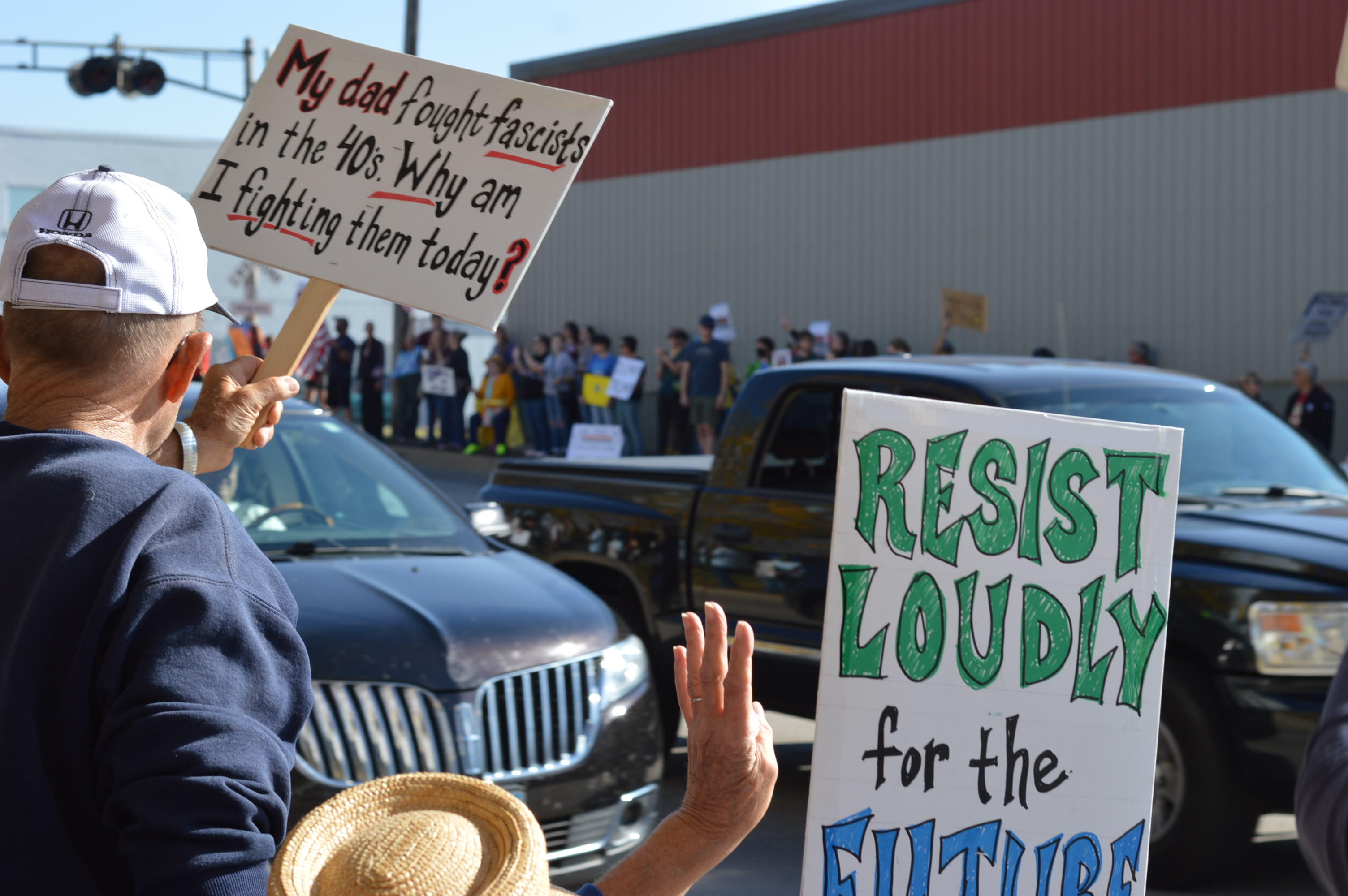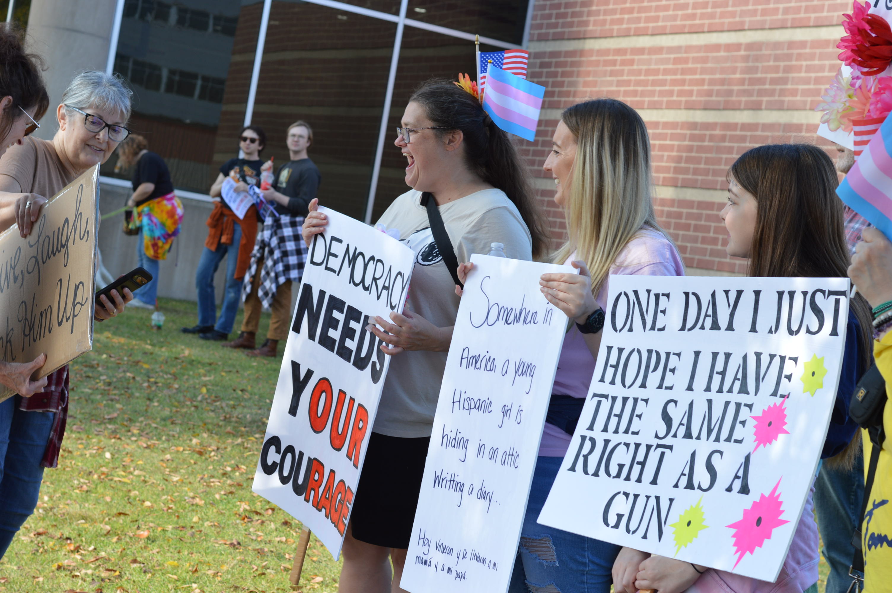 Chanting “this is what democracy looks like,” an estimated 4,000 people waved American flags and carried signs reading “No kings in America,” “Democracy not dictatorship,” “Trump is a traitor,” “I love my country” and more, while motorists honked in support.