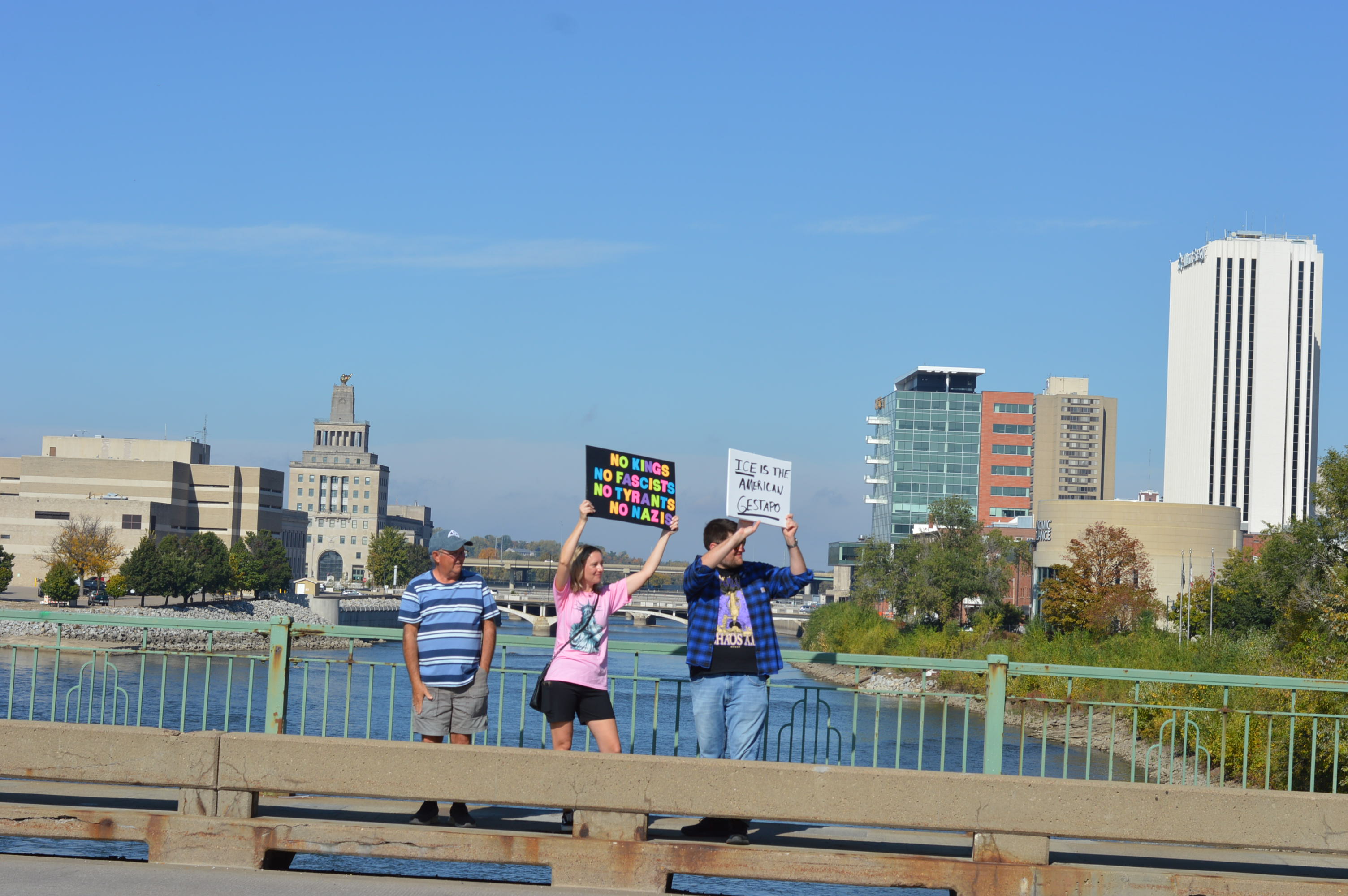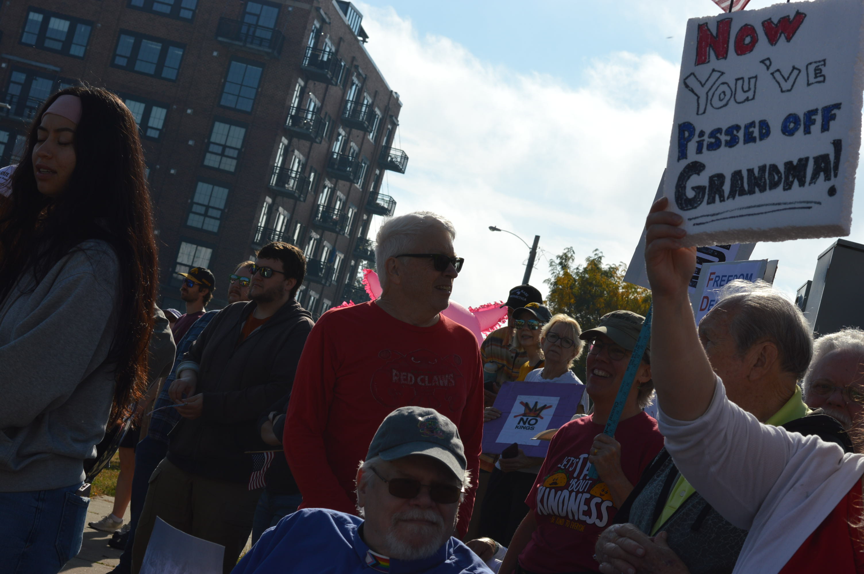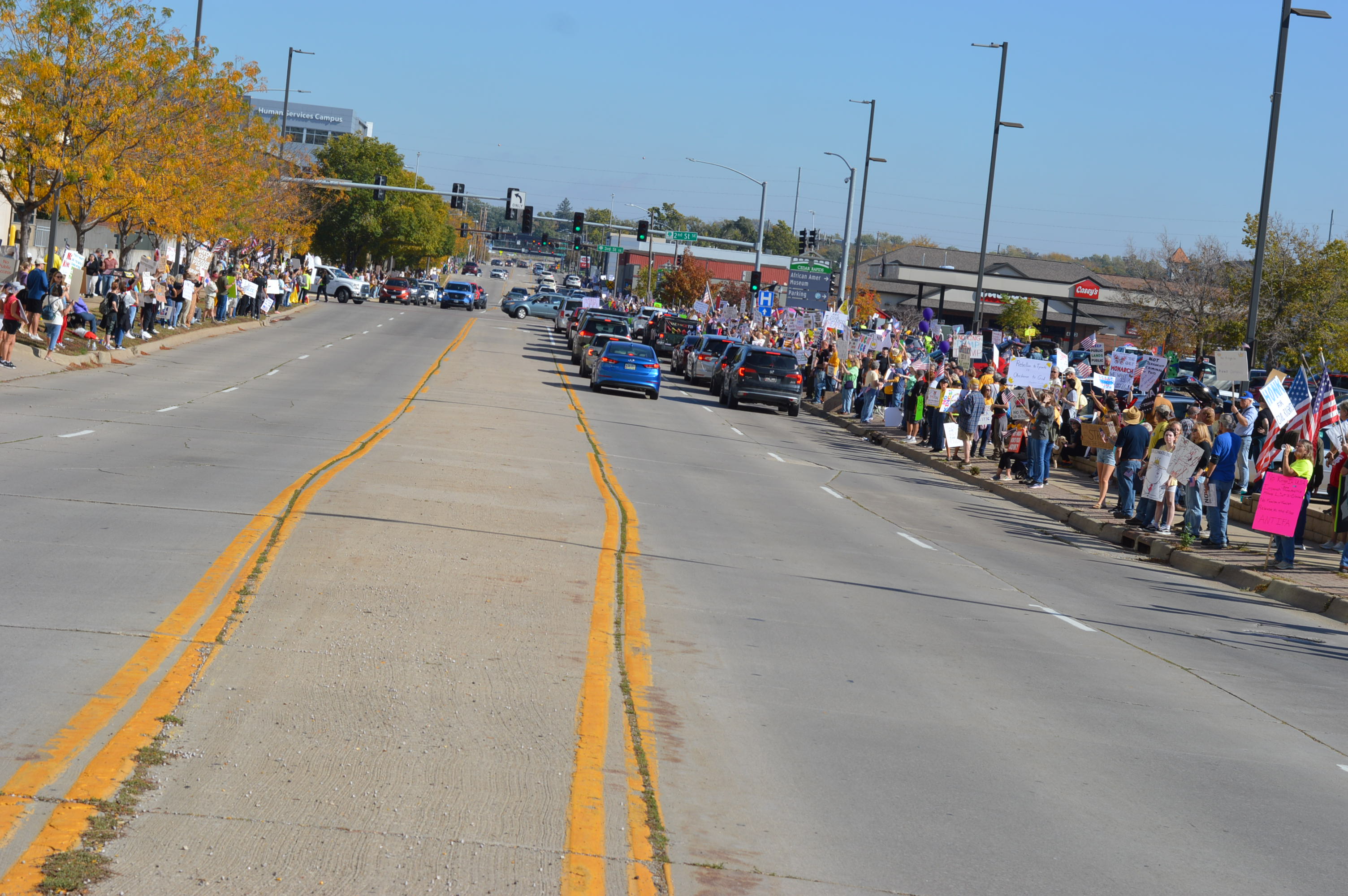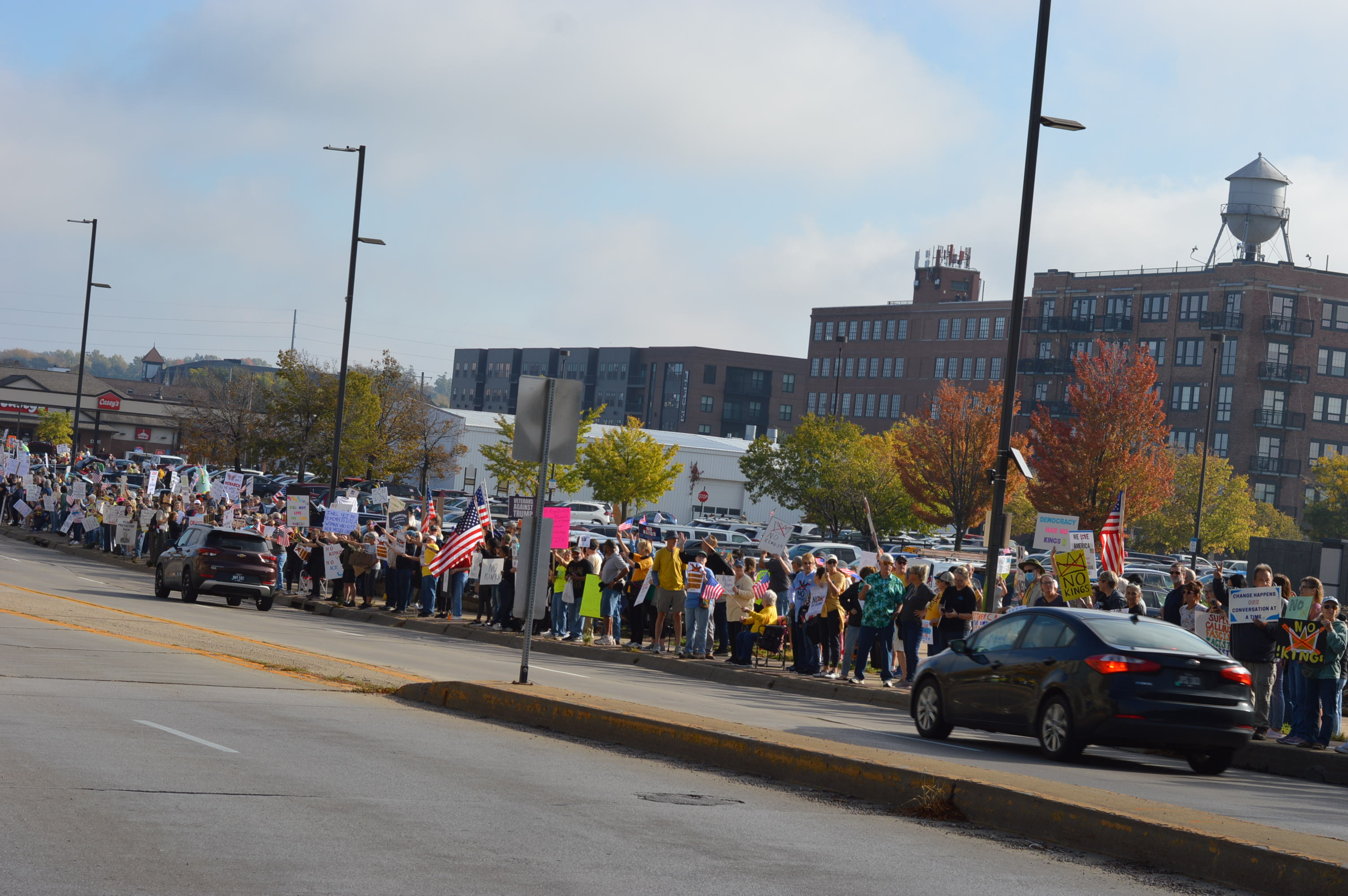 Standing several people deep at some intersections, the crowd stretched from halfway across the Eighth Avenue Bridge, past the railroad tracks to Fifth Street SE; an even longer line than the previous “No Kings” protest in June.