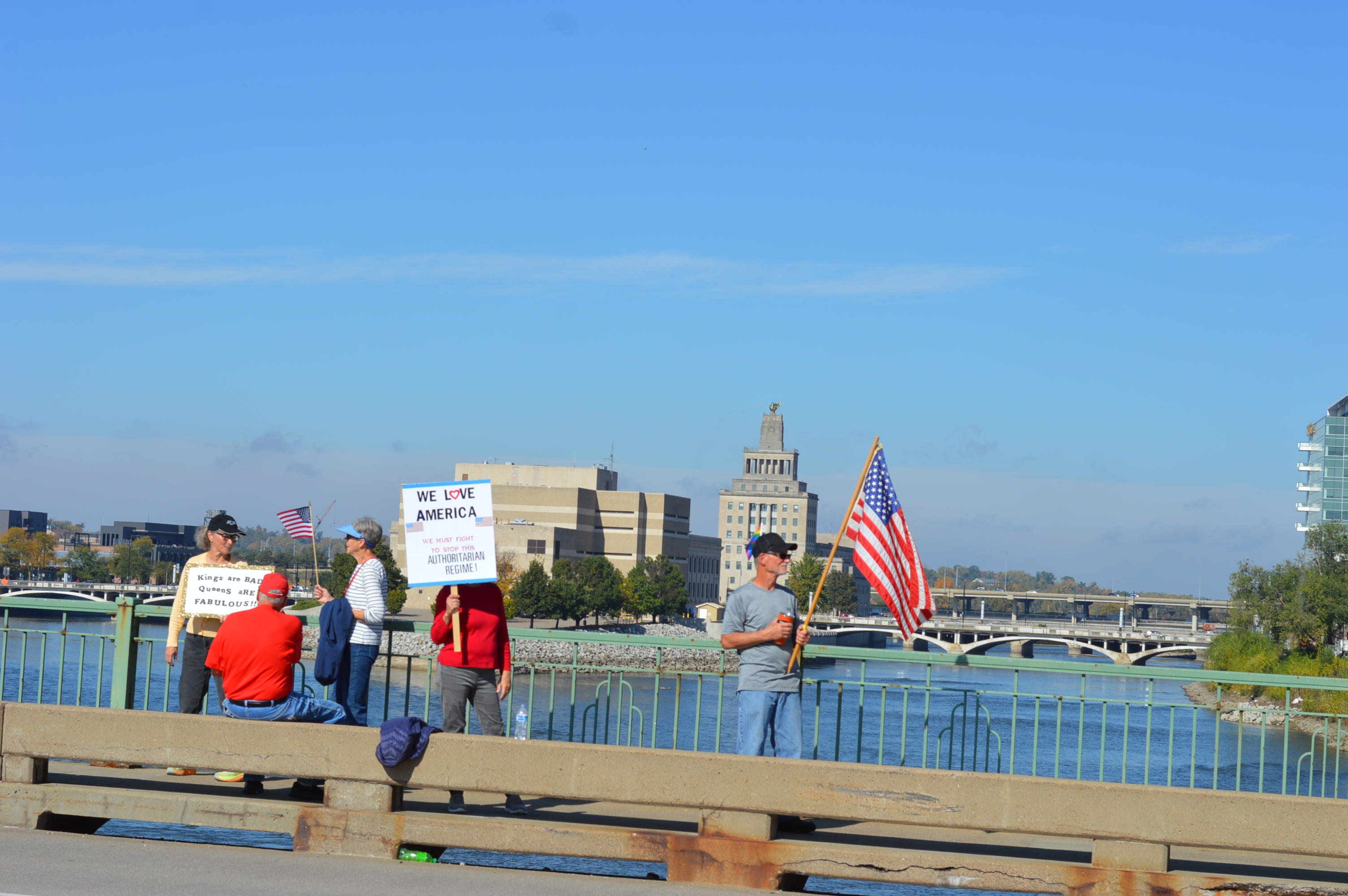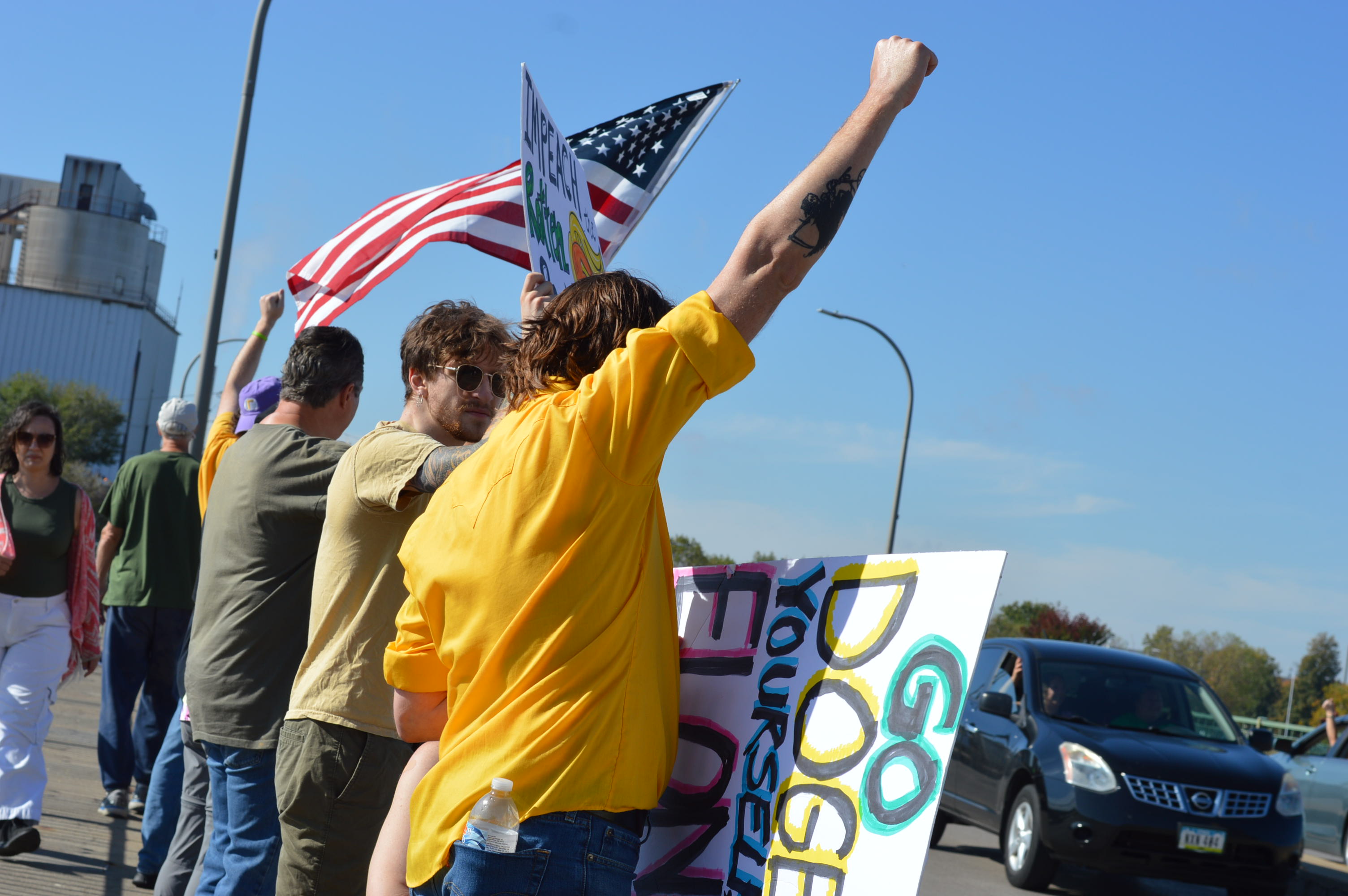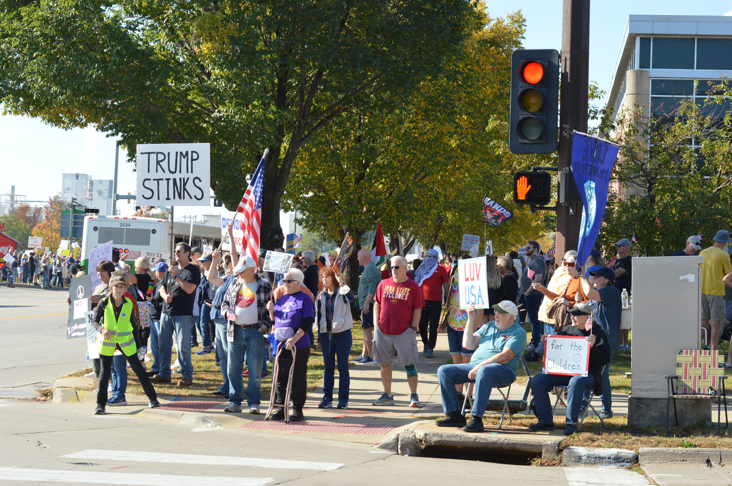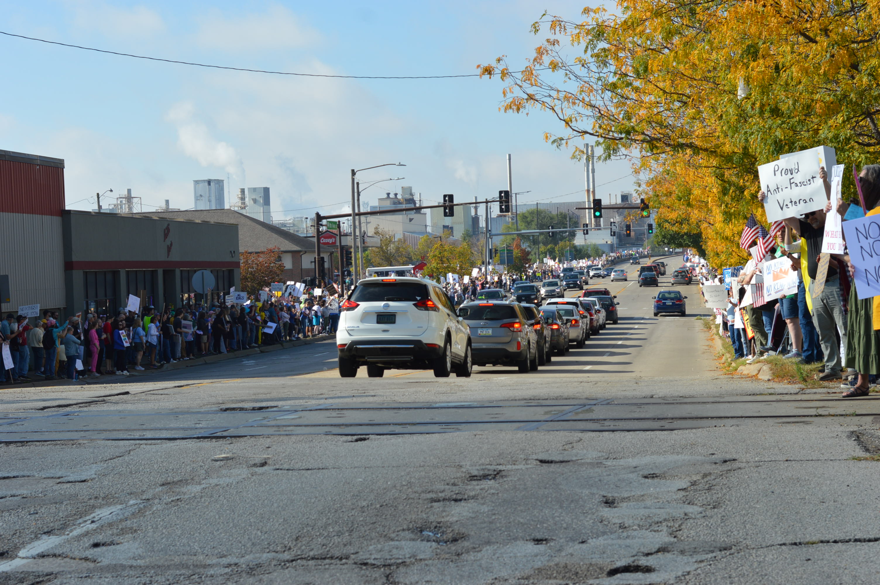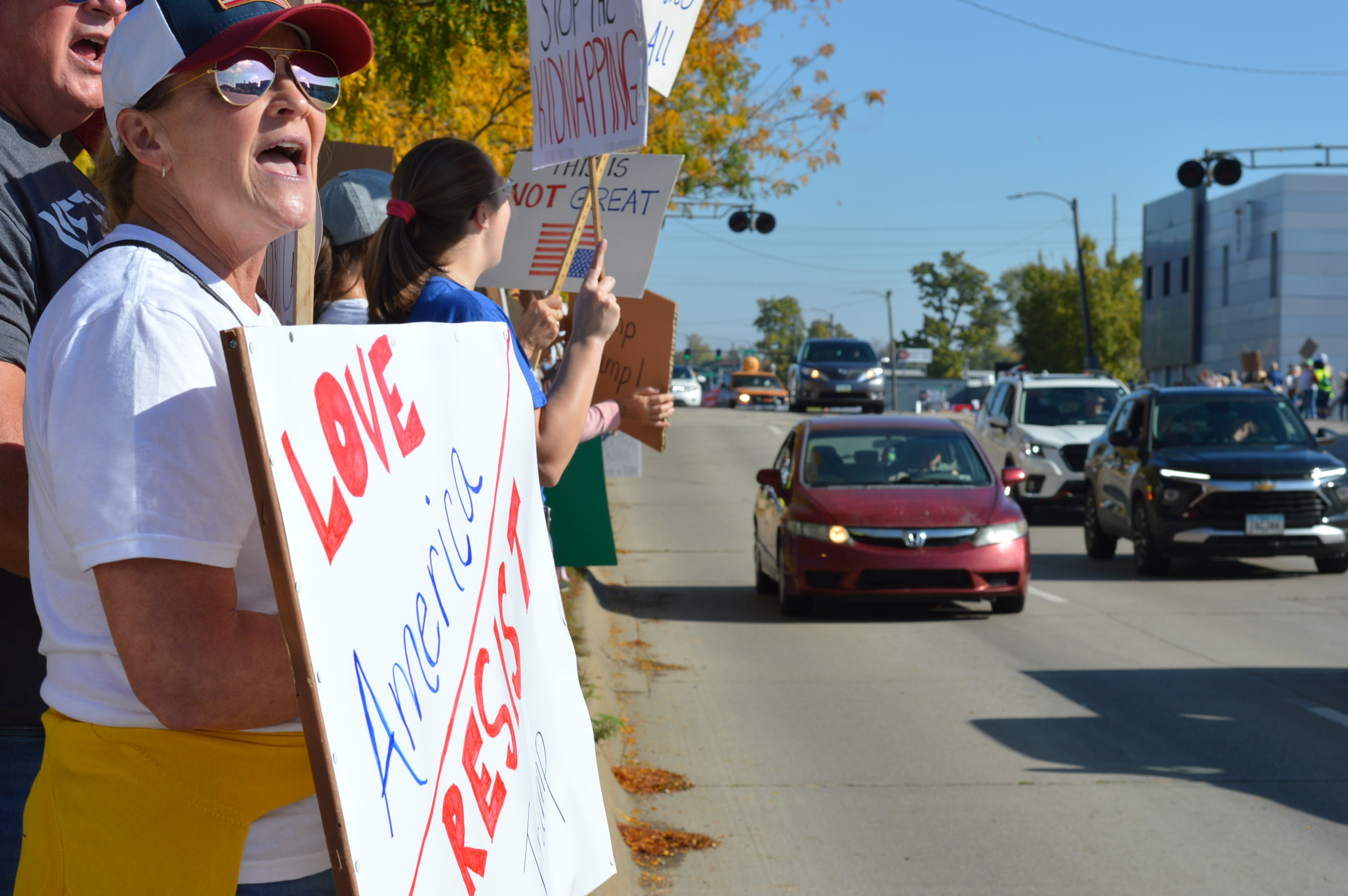 Standing several people deep at some intersections, the crowd stretched from halfway across the Eighth Avenue Bridge, past the railroad tracks to Fifth Street SE; an even longer line than the previous “No Kings” protest in June.
