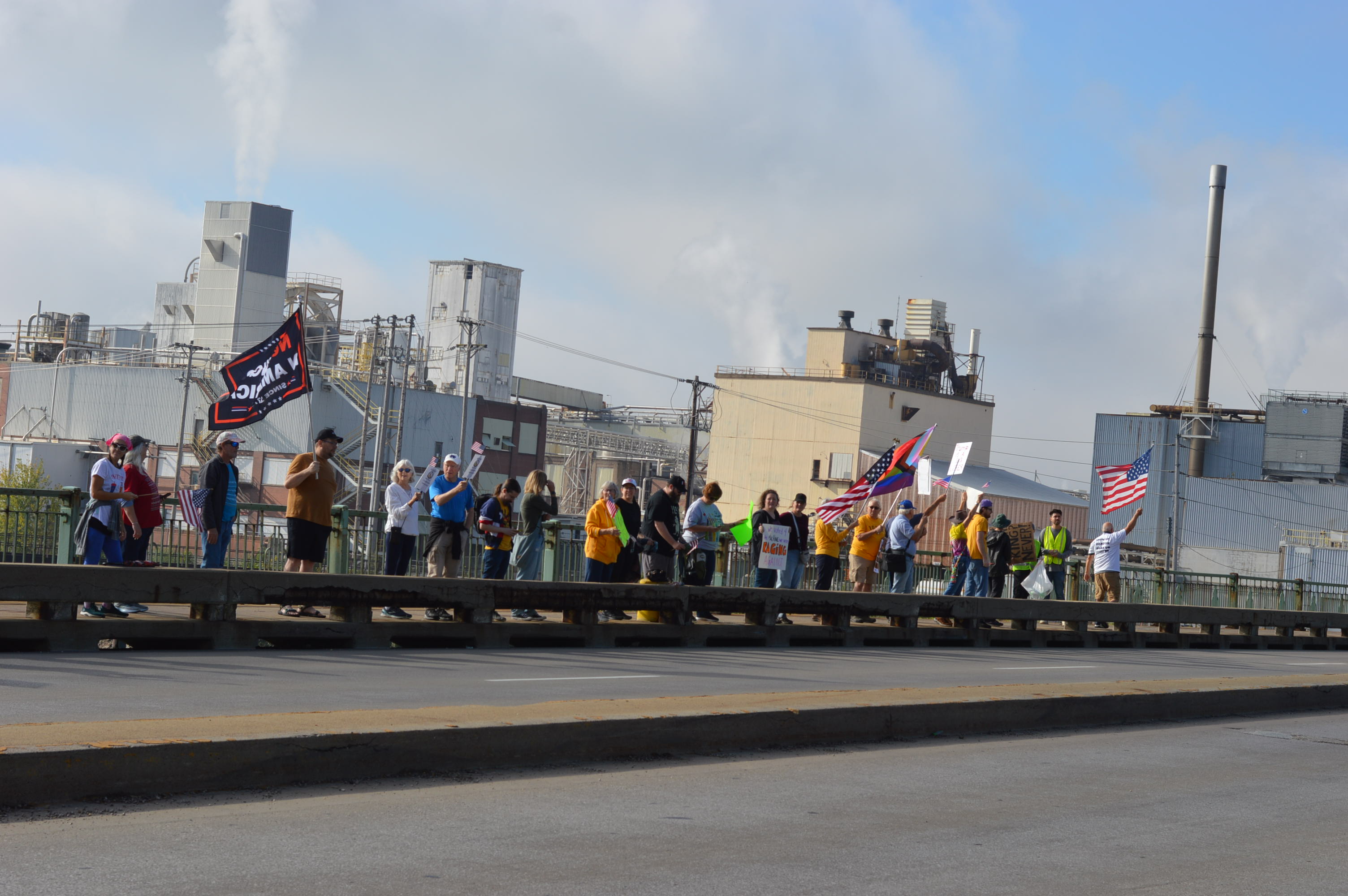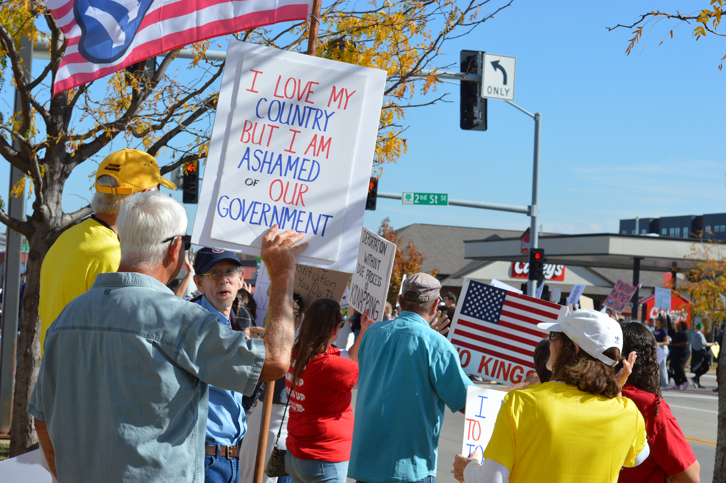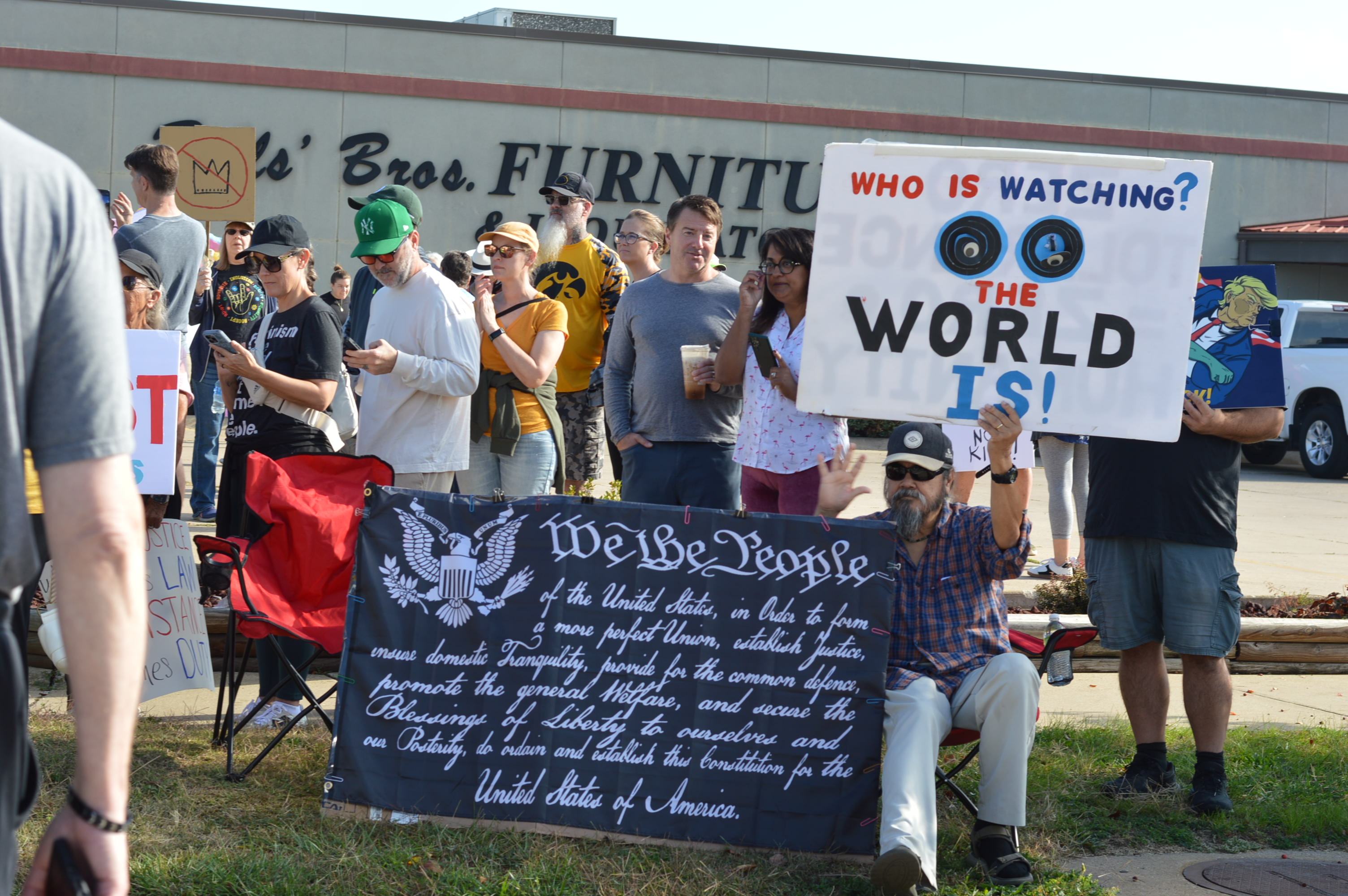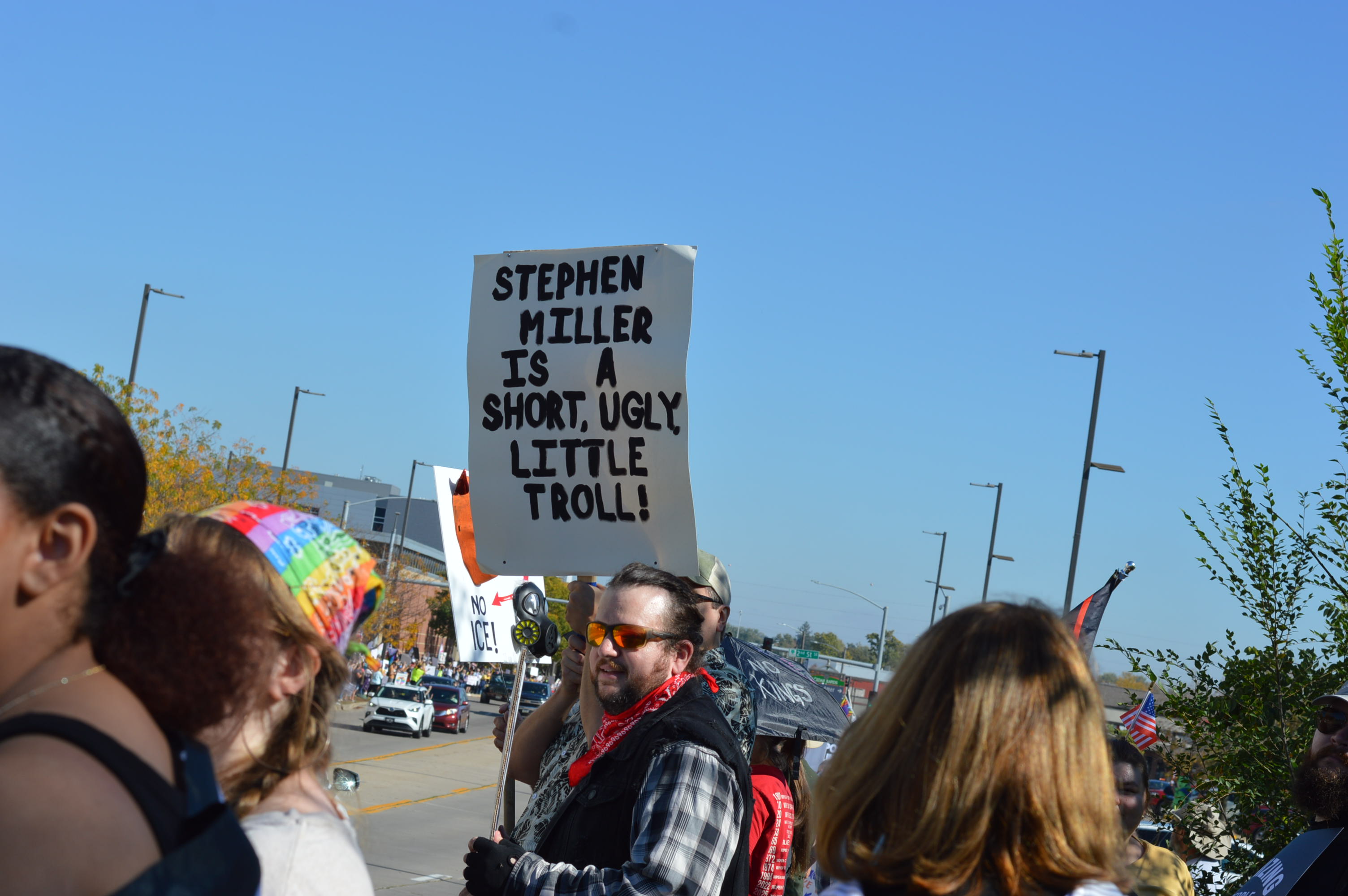 Standing several people deep at some intersections, the crowd stretched from halfway across the Eighth Avenue Bridge, past the railroad tracks to Fifth Street SE; an even longer line than the previous “No Kings” protest in June.