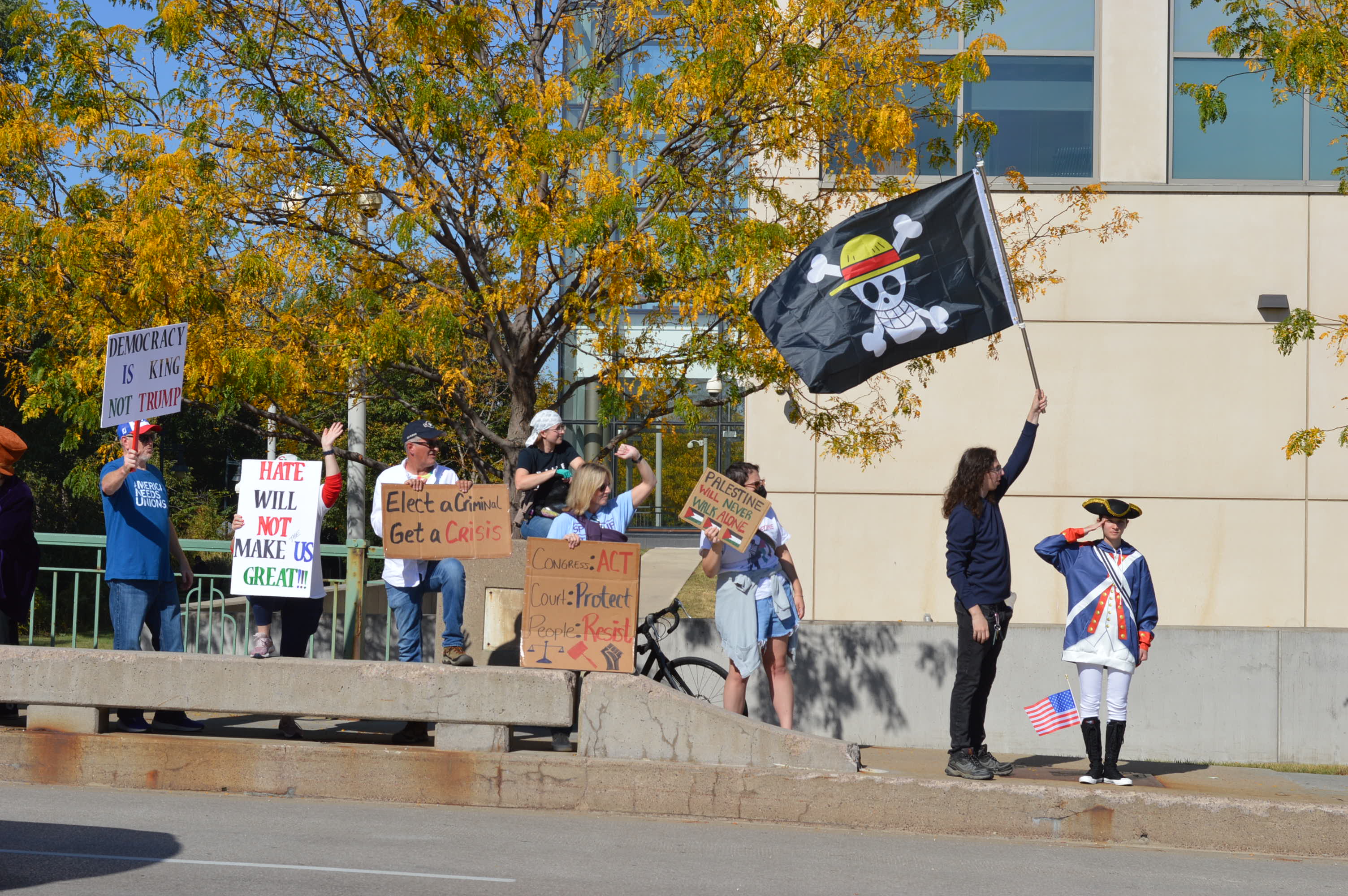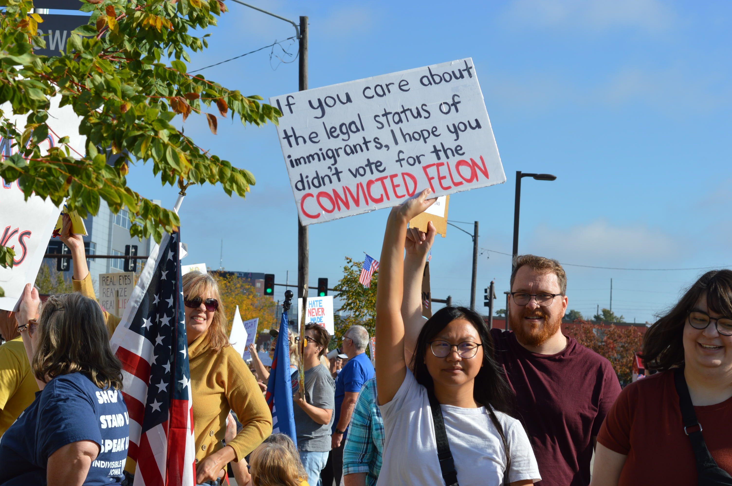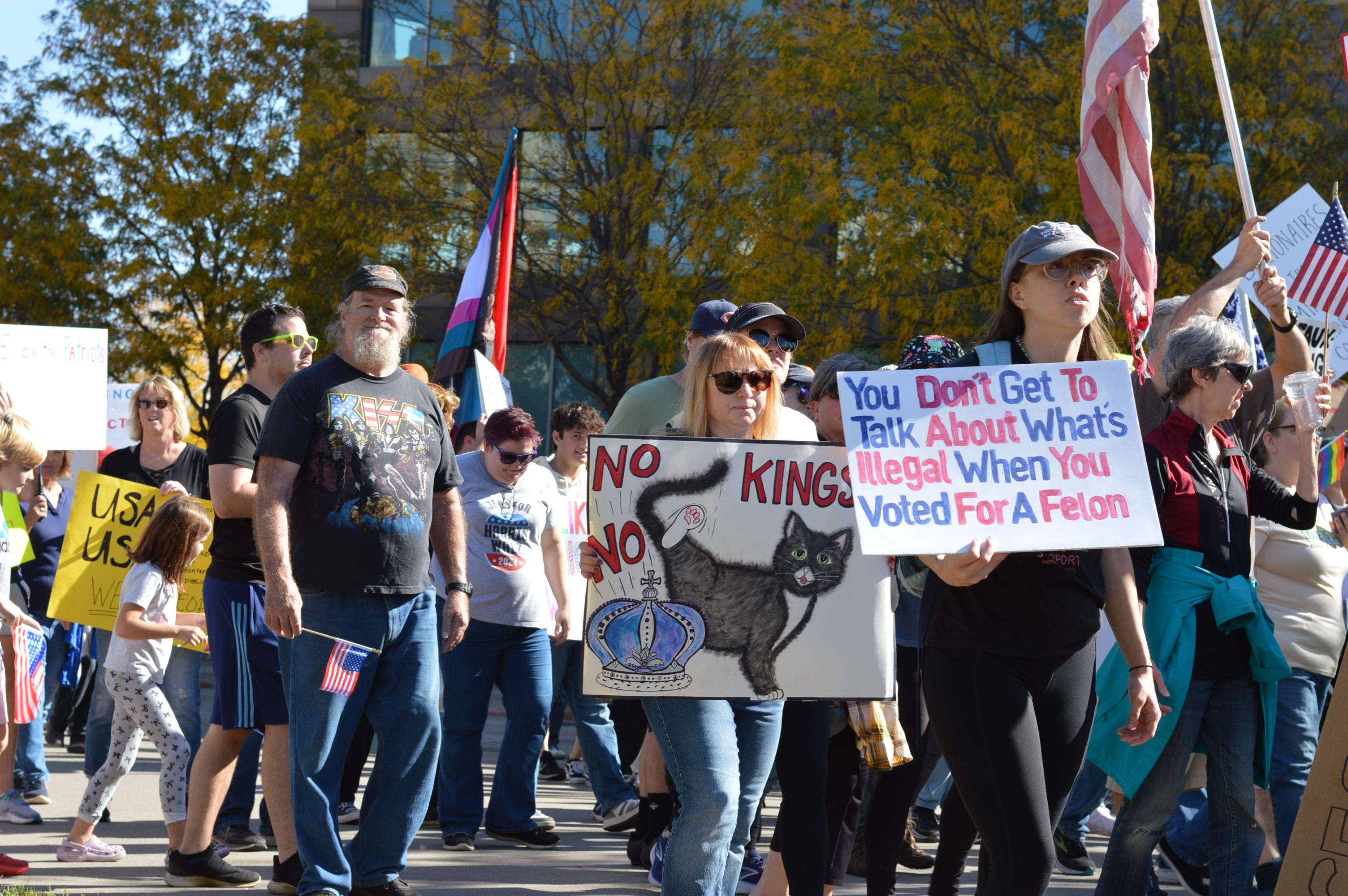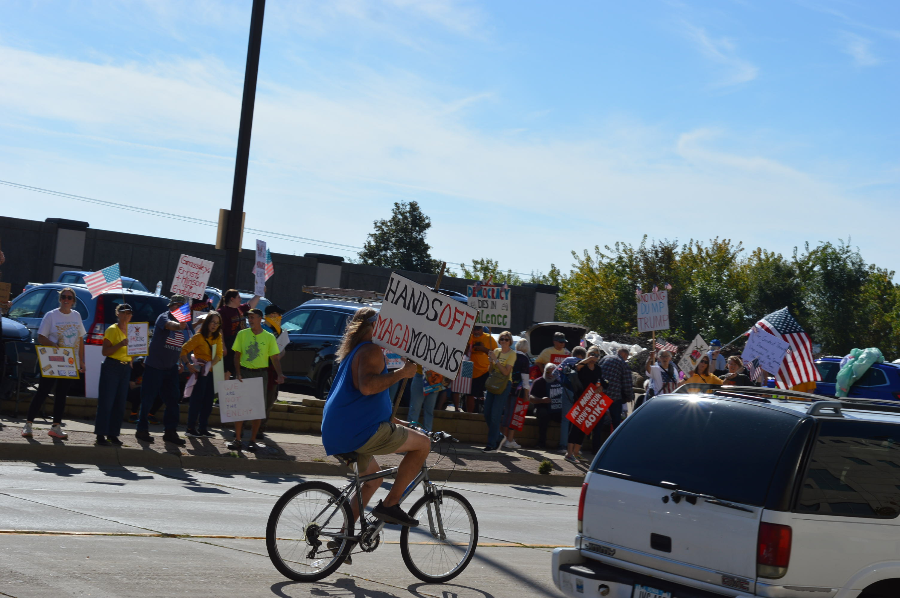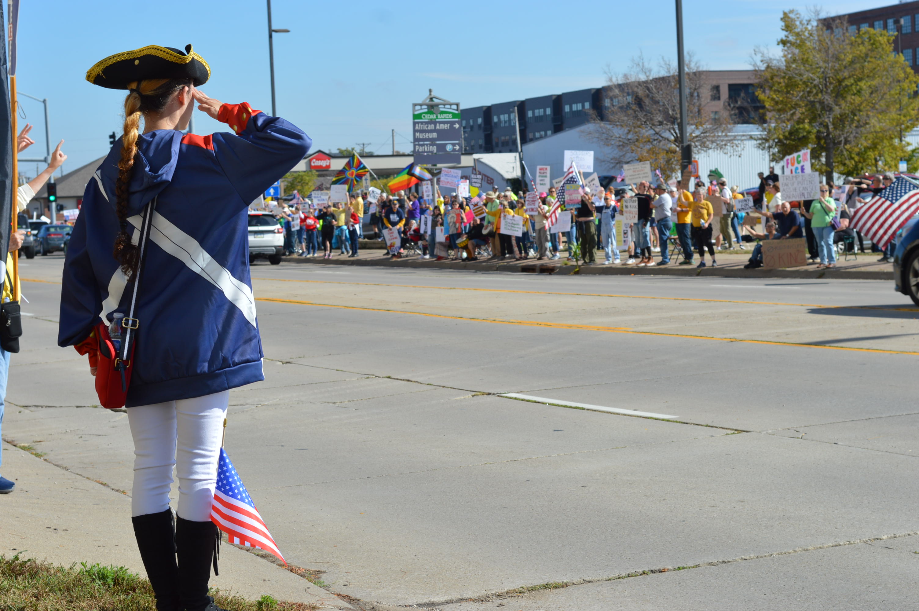 Standing several people deep at some intersections, the crowd stretched from halfway across the Eighth Avenue Bridge, past the railroad tracks to Fifth Street SE; an even longer line than the previous “No Kings” protest in June.