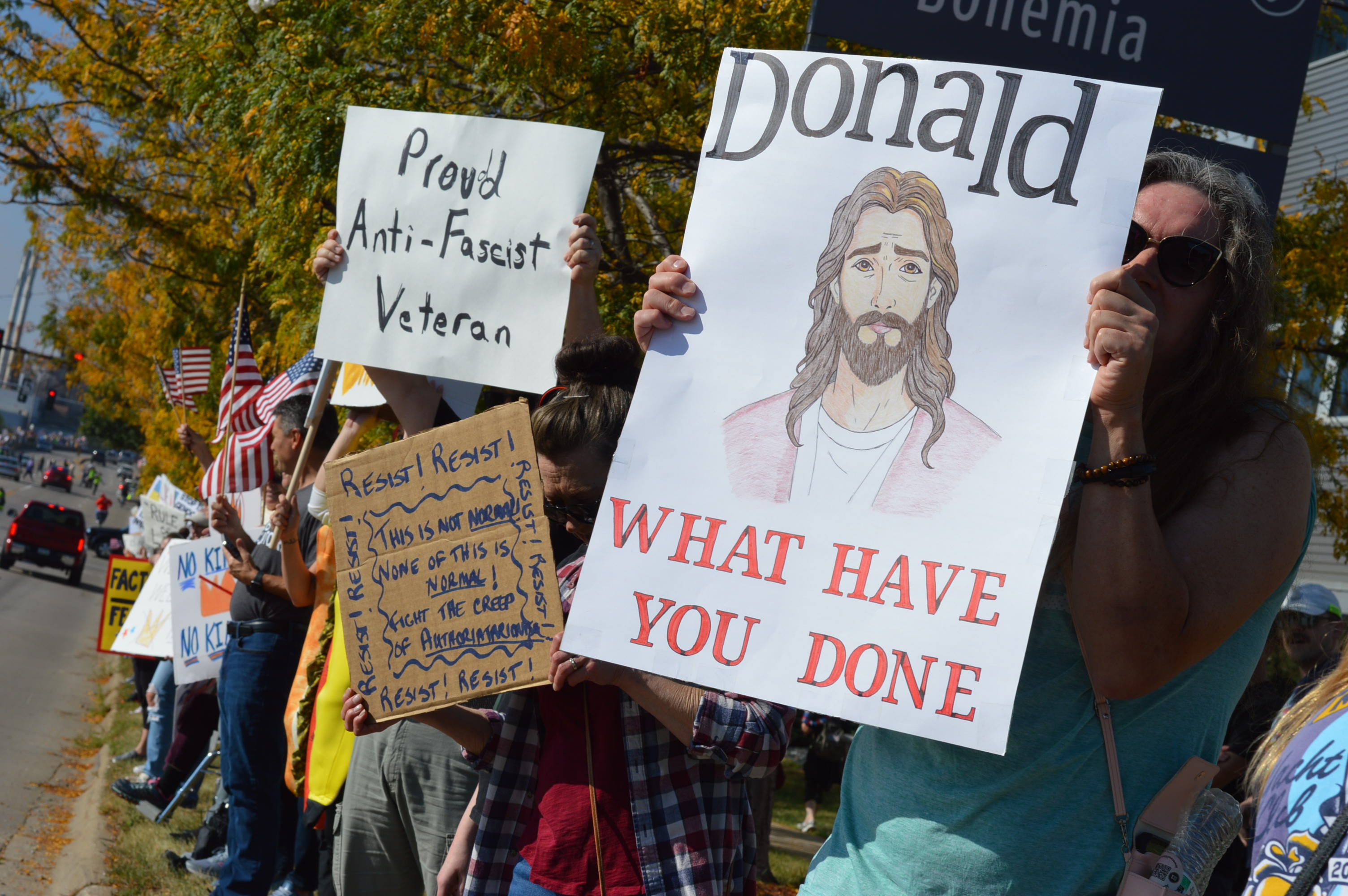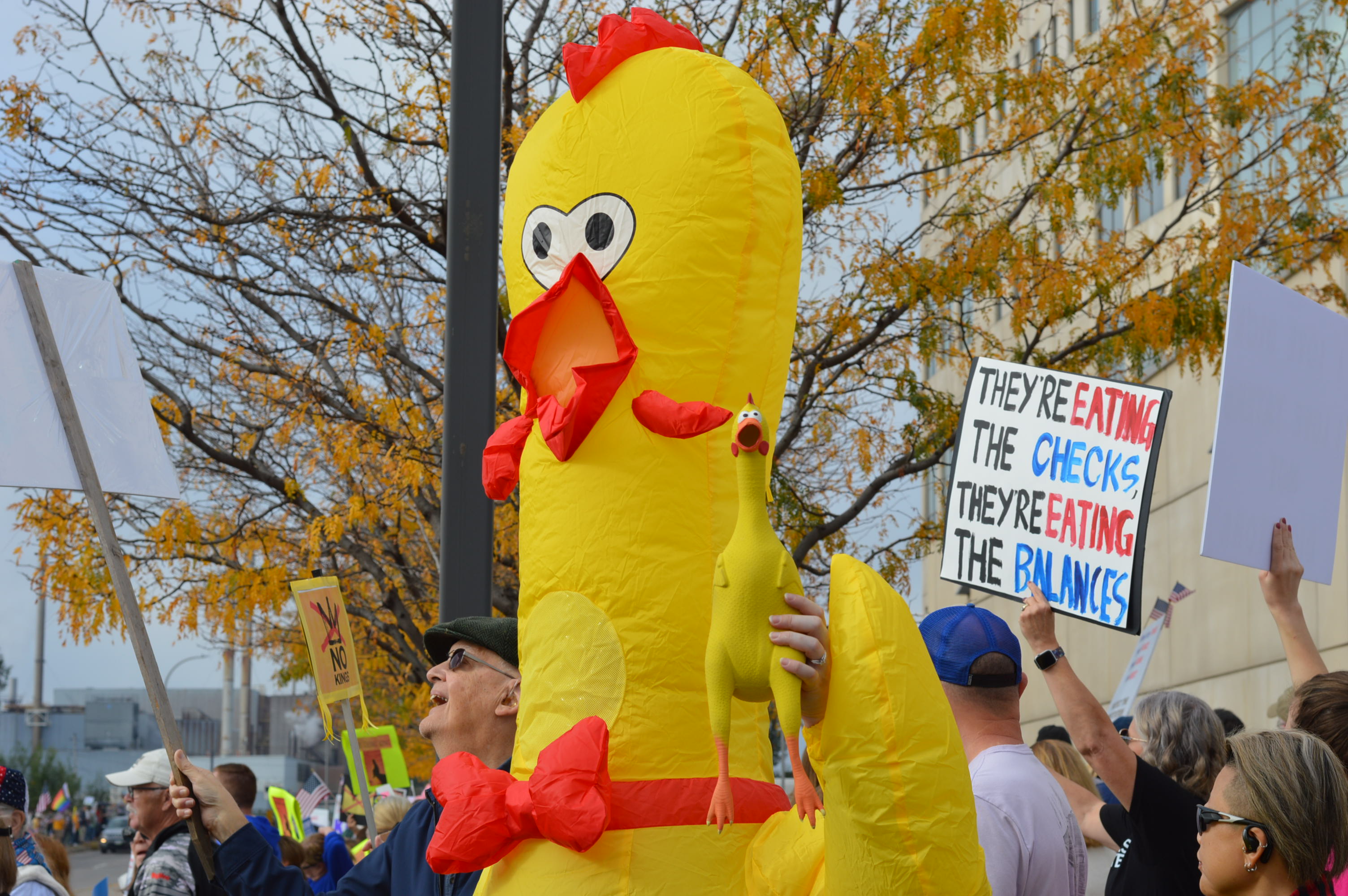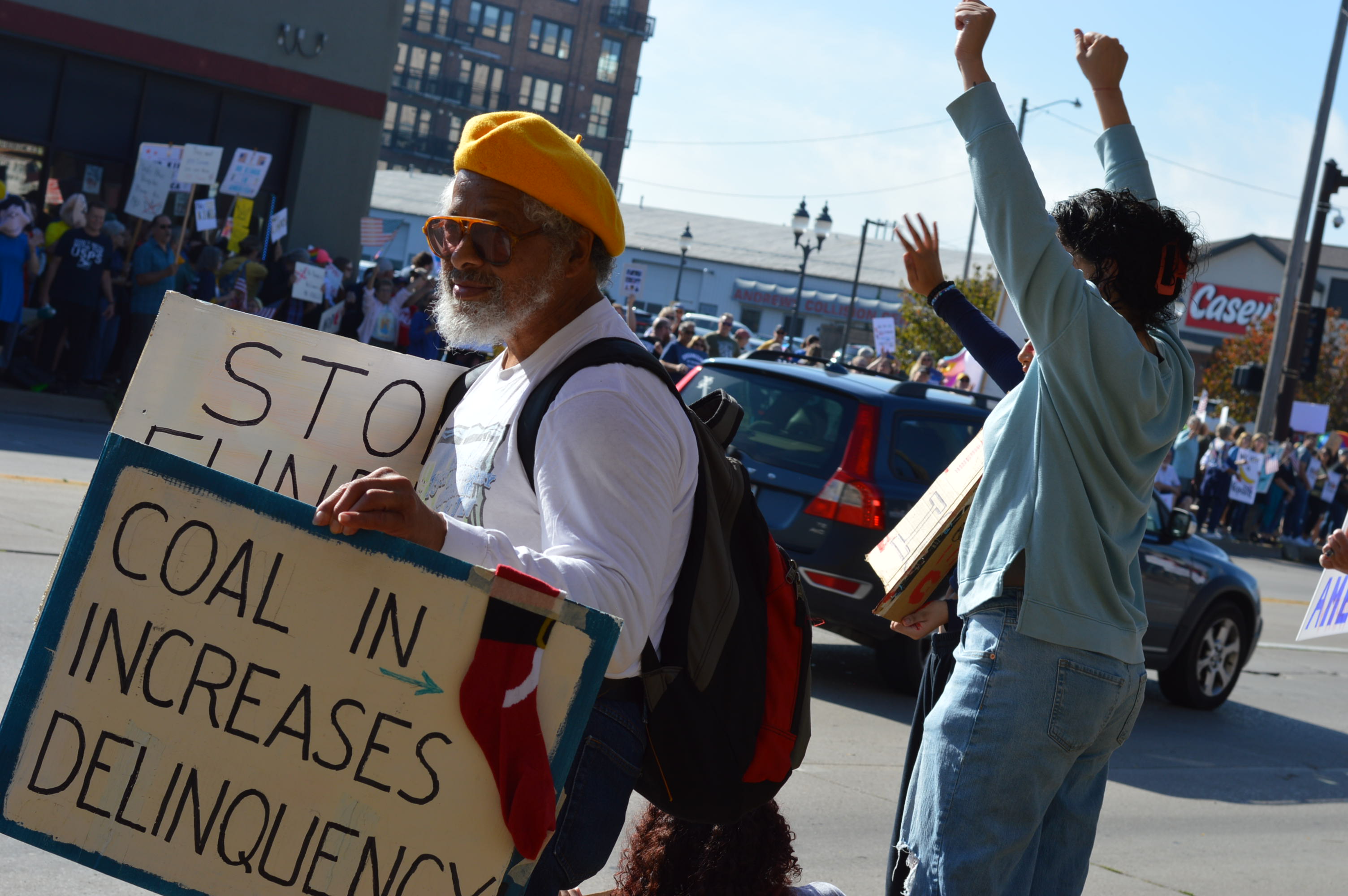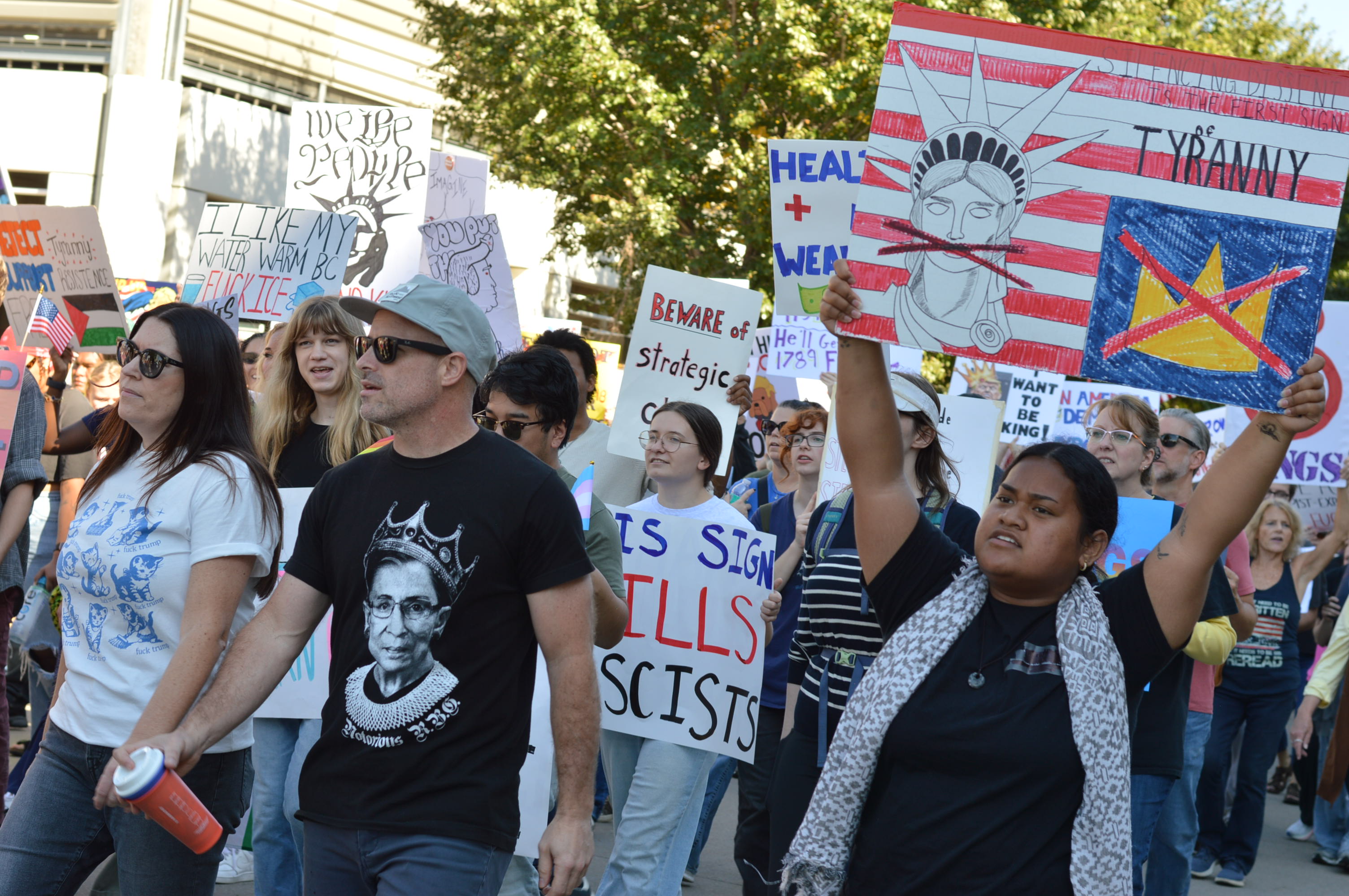 Standing several people deep at some intersections, the crowd stretched from halfway across the Eighth Avenue Bridge, past the railroad tracks to Fifth Street SE; an even longer line than the previous “No Kings” protest in June.