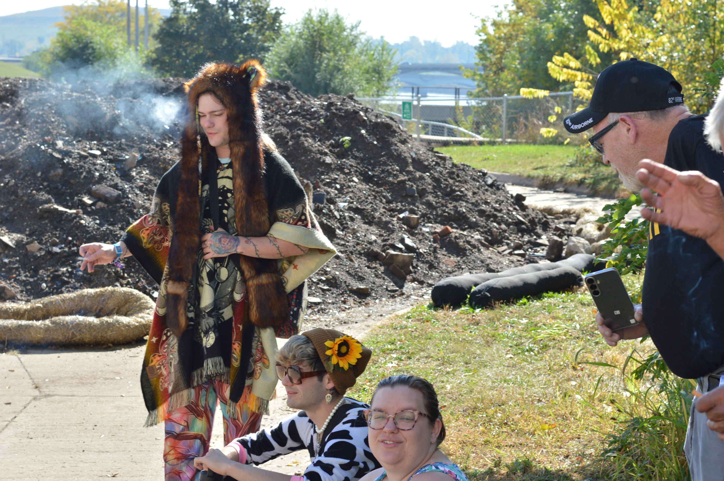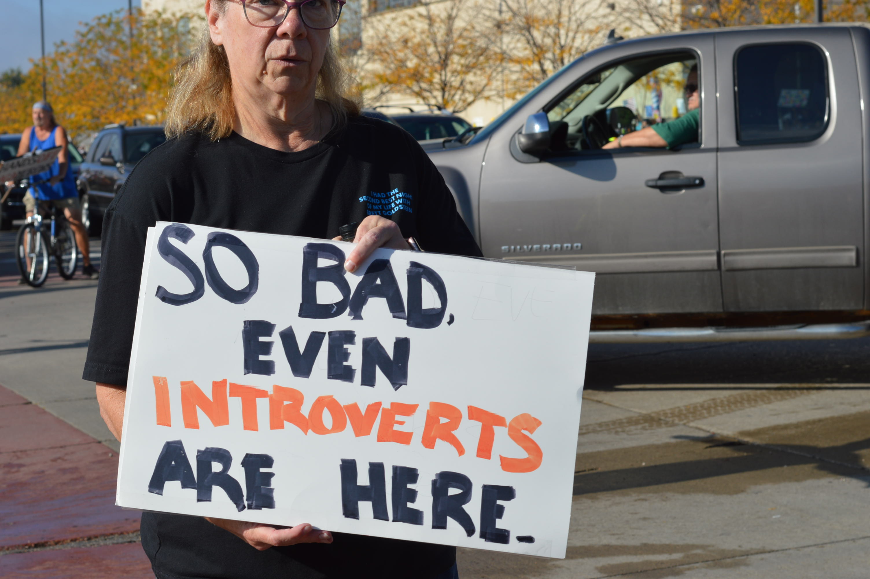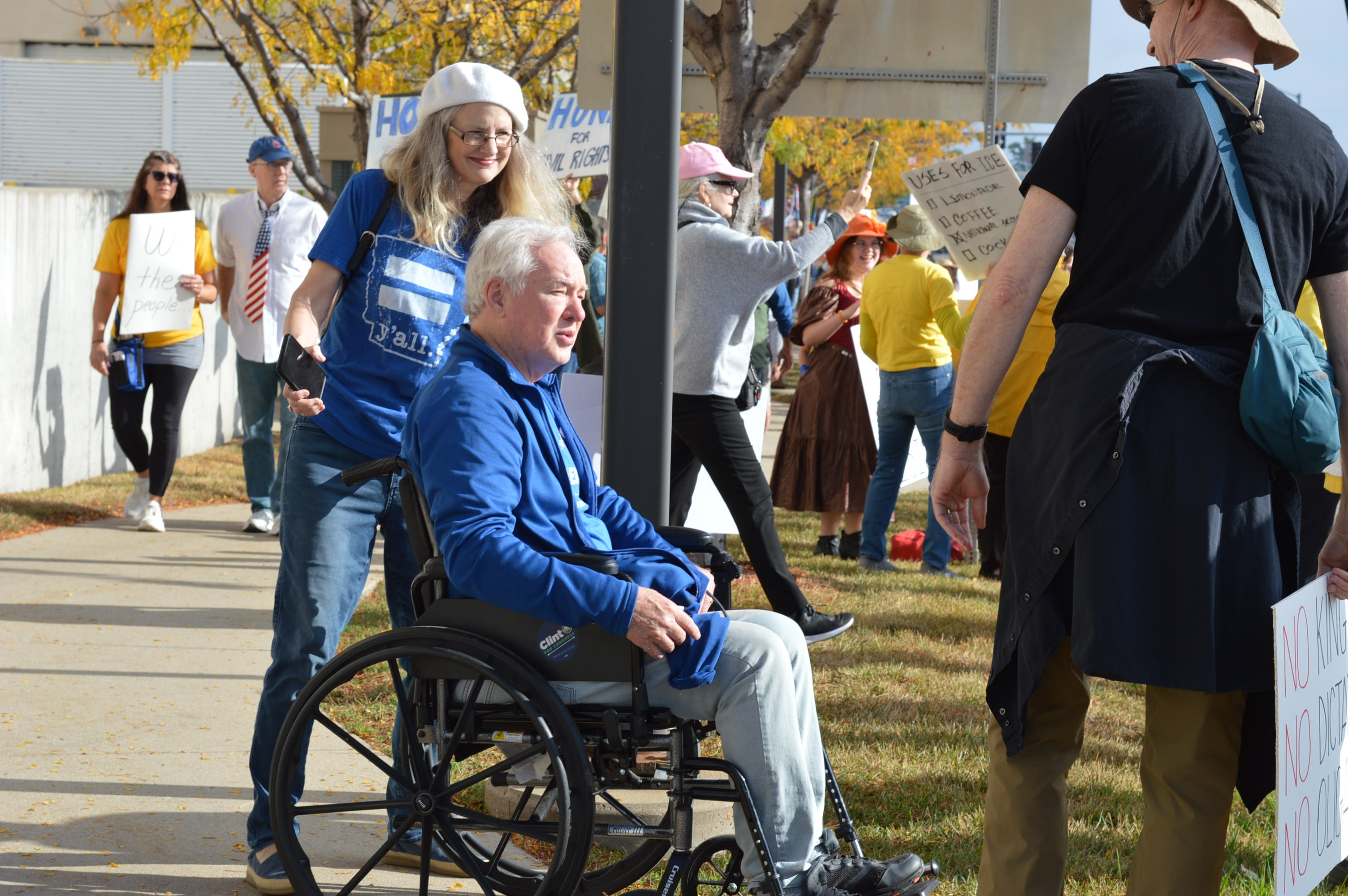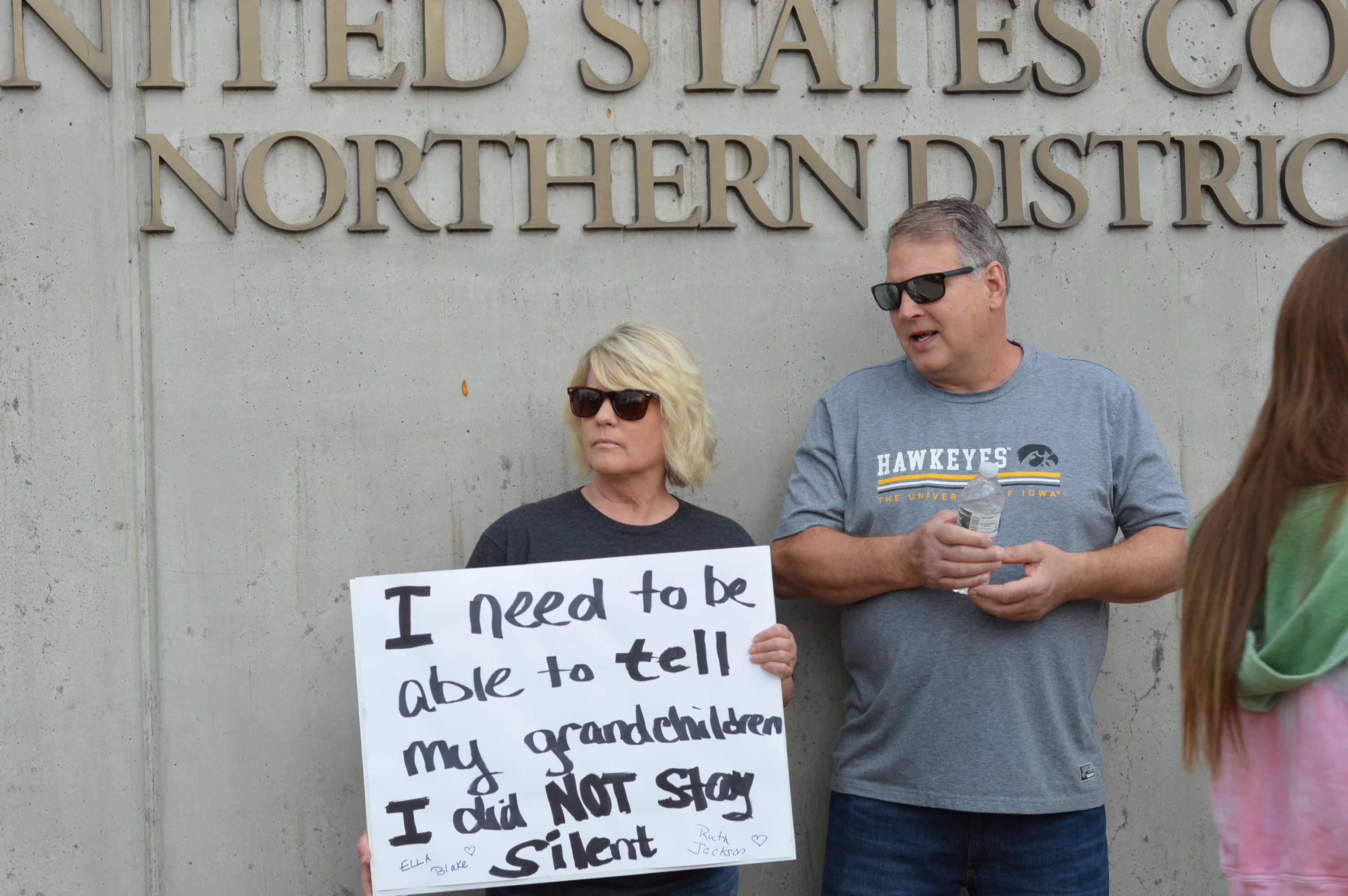 Demonstrators pause in front of the federal courthouse in Cedar Rapids, Iowa, during the “No Kings” protest on Oct. 18, 2025. (photo/Cindy Hadish)