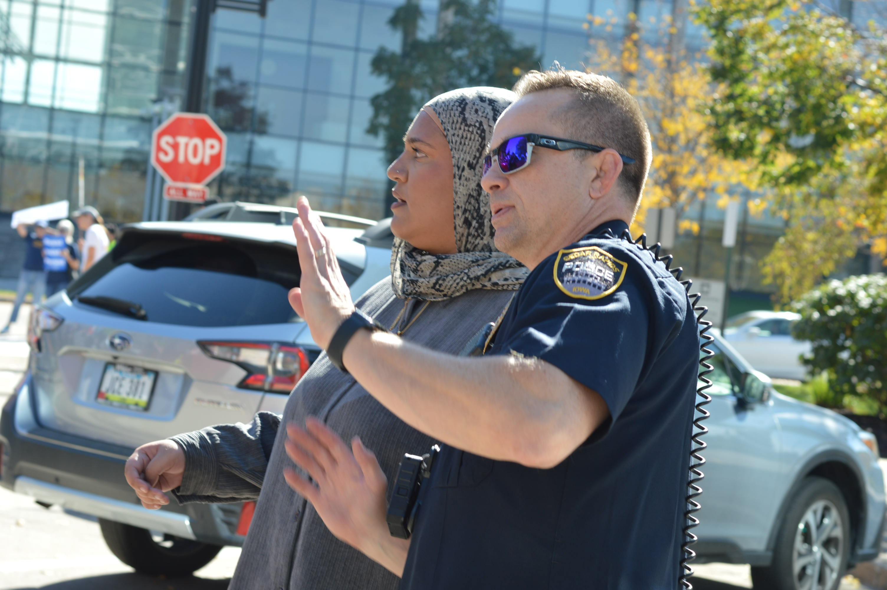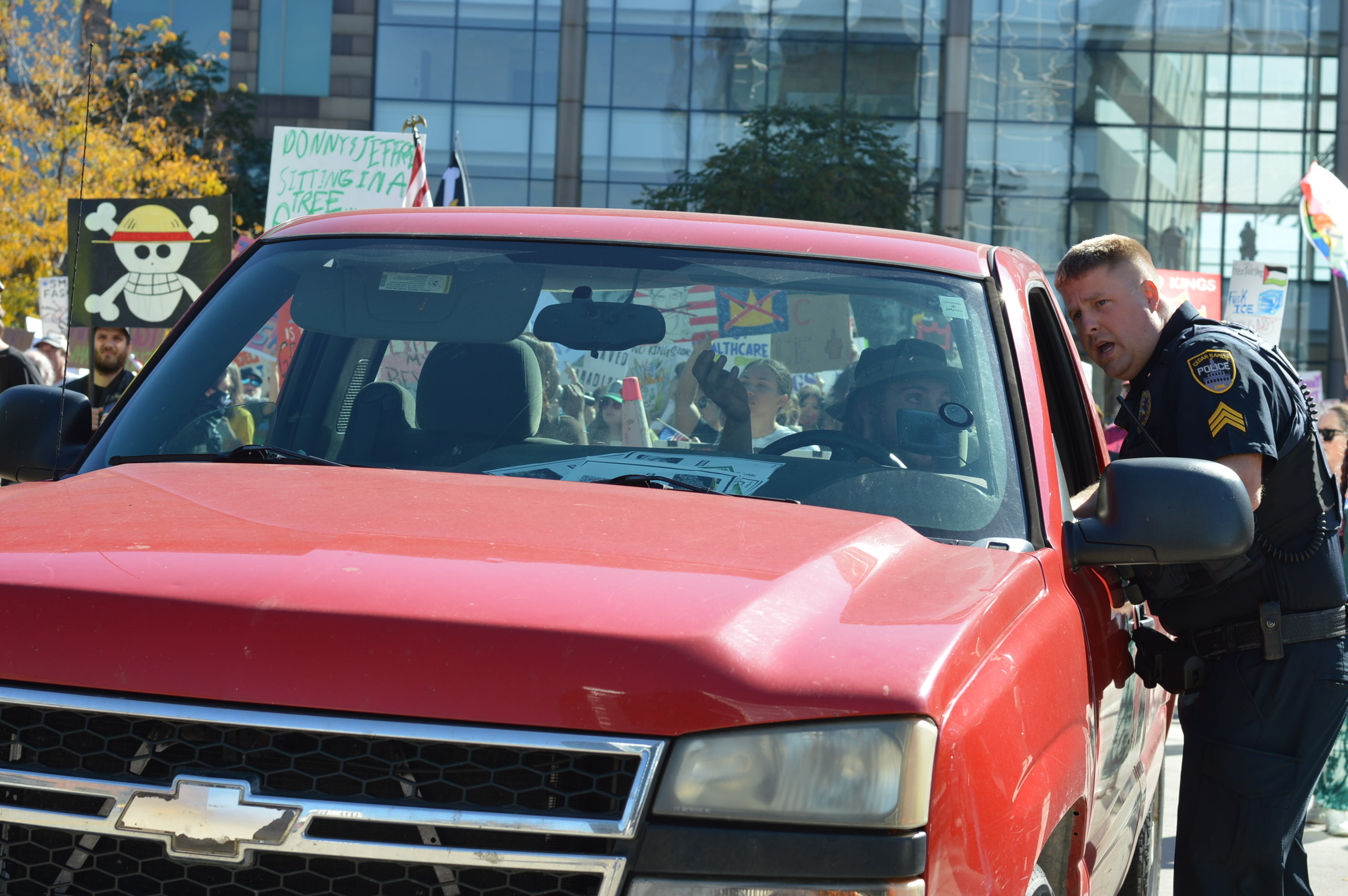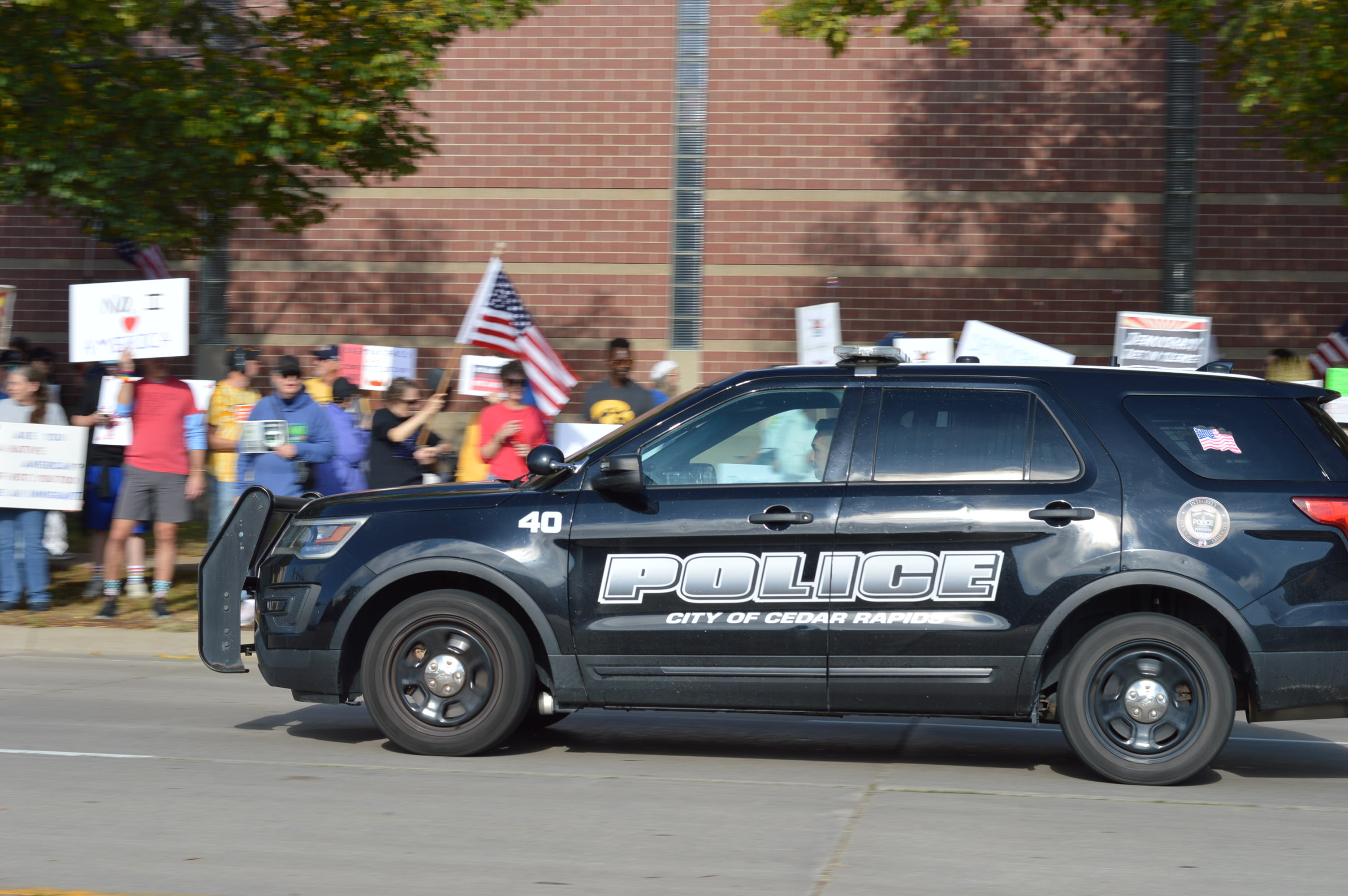 Cedar Rapids police temporarily halt a march following the “No Kings” protest. (photo/Cindy Hadish)
